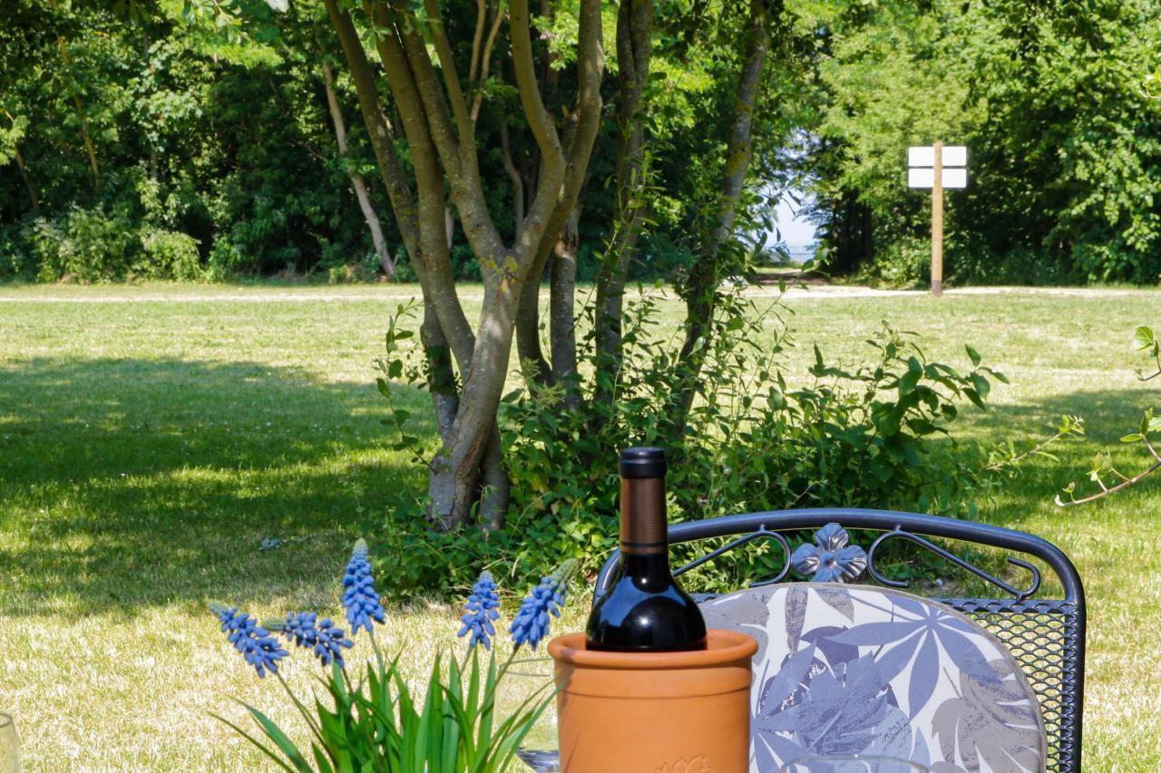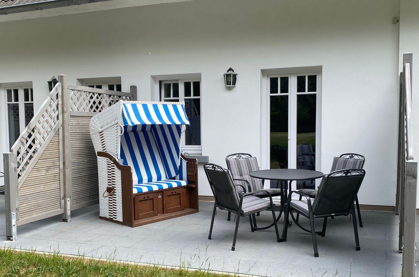 Genießen Sie das Ostsee-Feeling mit der ganzen Familie auf der romantisch anmutenden Terrasse, die Ihnen einen fantastischen freien Blick auf die Ruhe ausstrahlende Umgebung mit weitläufigen Rasenflächen, die das Ferienhaus umfassen, bietet. Moderne Gartenmöbel und ein hübscher Strandkorb laden zum gemütlichen Verweilen ein und vervollständigen das harmonische Ambiente im Außenbereich des Hauses.