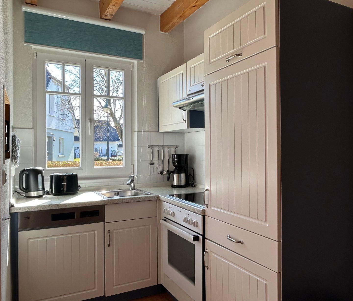 voll ausgestattete Küche (Herd, Backofen, Mikrowelle, Kühlschrank inkl. Gefrierfach, Geschirrspüler)