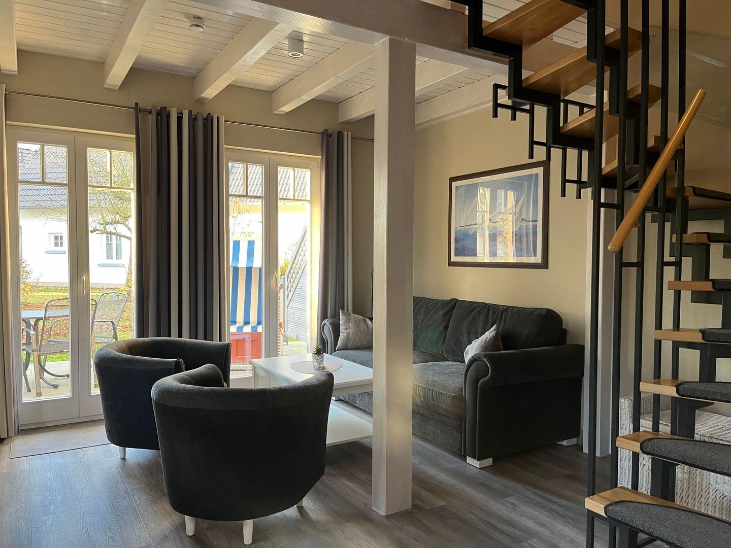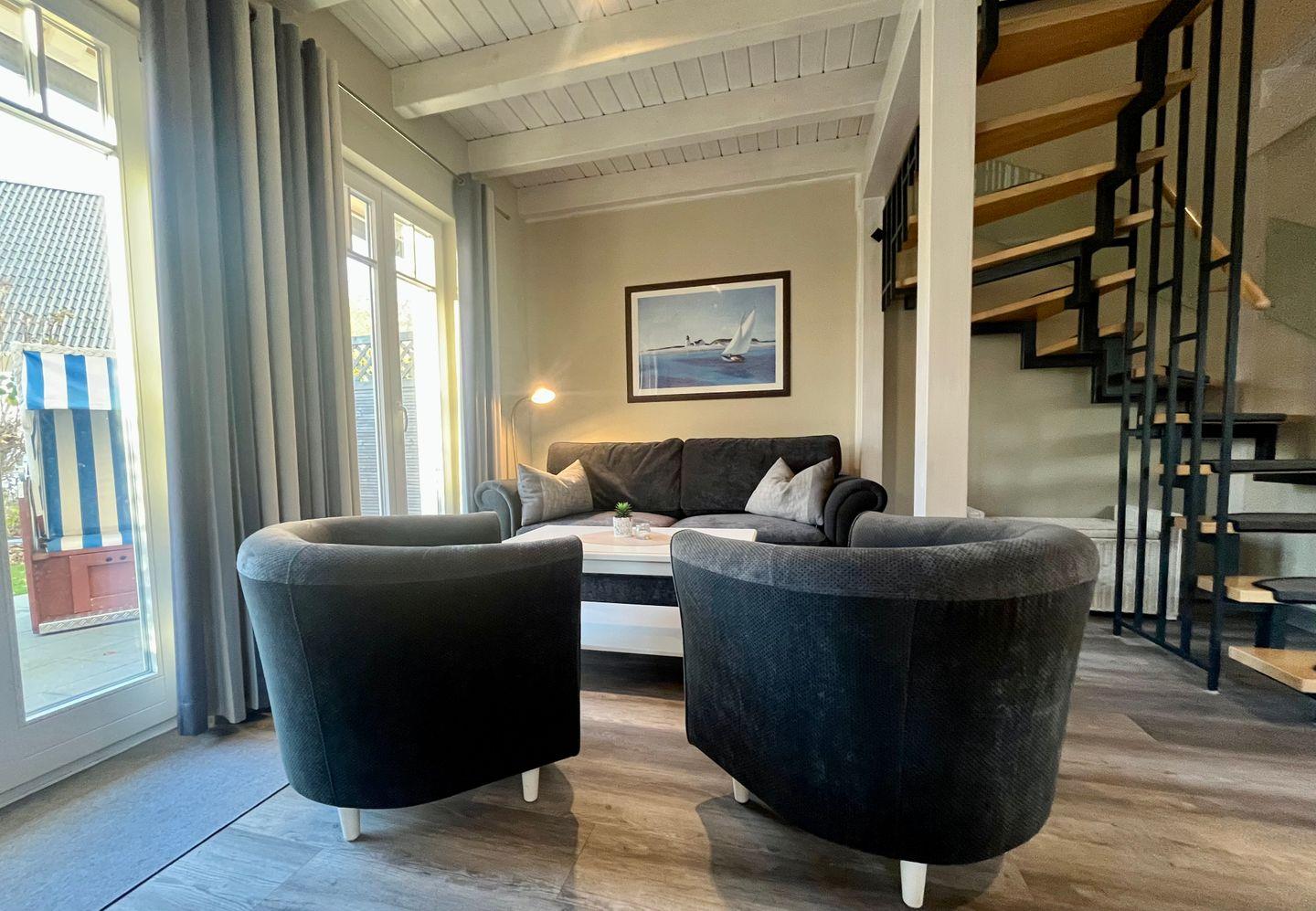 Im Erdgeschoss erwartet Sie ein liebevoll gestalteter Wohnbereich mit zwei bequemen Sesseln und einer gemütlichen Schlafcouch, die sich bei Bedarf in einen komfortablen Schlafplatz für zwei Personen verwandeln lässt. Warme Farben, stilvolle Dekoration und hochwertige Möbel schaffen eine behagliche Atmosphäre – perfekt für entspannte Abende nach einem erlebnisreichen Tag an der Ostsee.