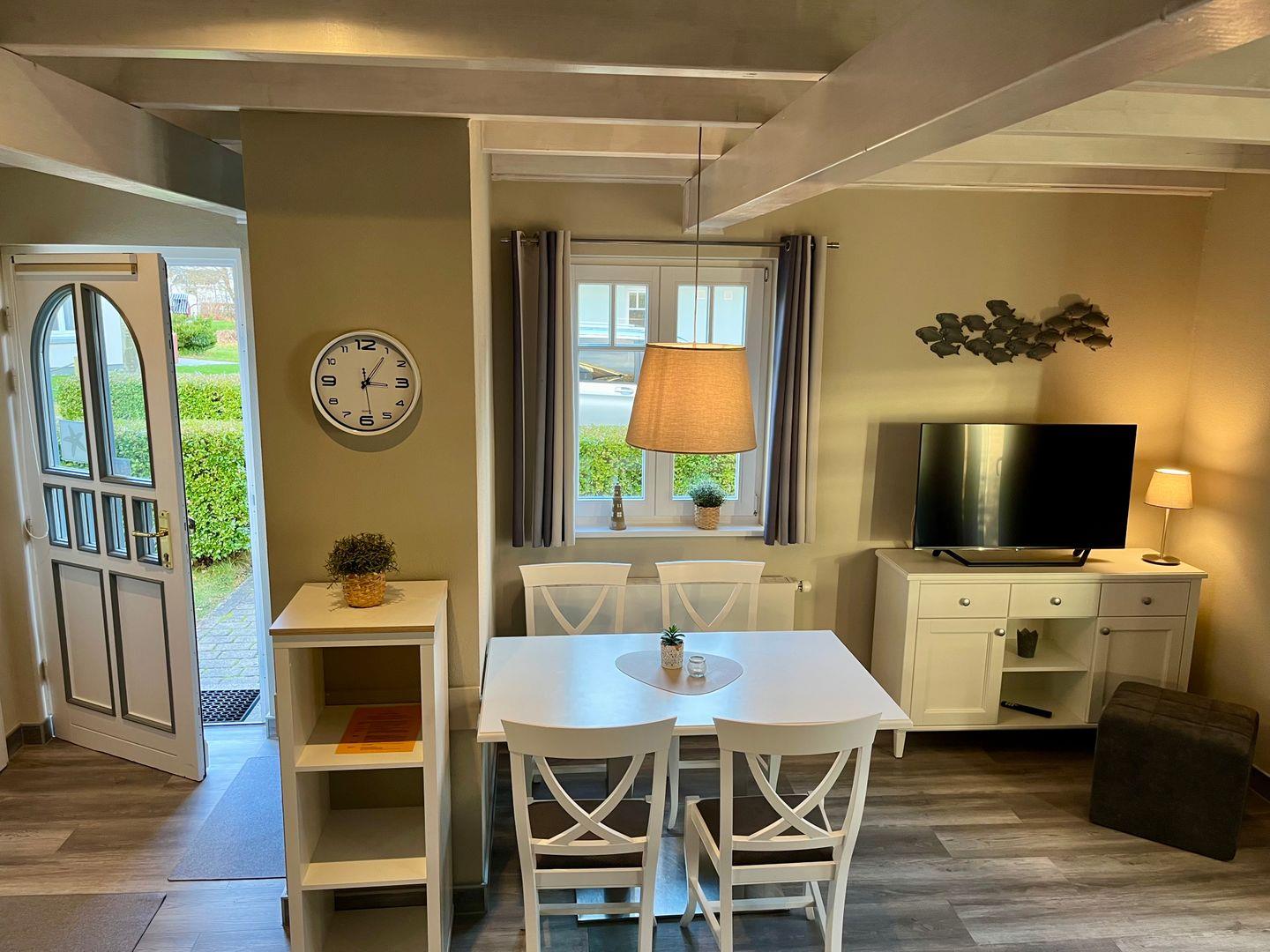 Die moderne, voll ausgestattete Einbauküche lässt keine Wünsche offen: 4-Felder-Herd, Backofen, Mikrowelle, Kühlschrank inkl. Gefrierfach und Geschirrspüler. Hier ist alles vorhanden, um Ihre Lieblingsgerichte im Handumdrehen zuzubereiten. Gemeinsam speisen Sie am großzügigen Esstisch für 6 Personen, der nahtlos in den Wohnbereich integriert ist – gesellige Abende sind garantiert.