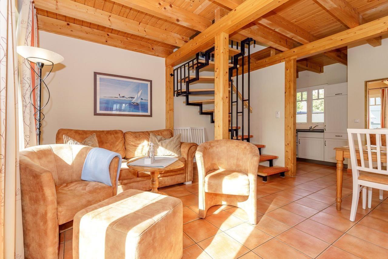 Im Erdgeschoss erwartet Sie ein liebevoll gestalteter Wohnbereich mit zwei bequemen Sesseln und einer gemütlichen Schlafcouch, die sich bei Bedarf in einen komfortablen Schlafplatz für zwei Personen verwandeln lässt. Warme Farben, stilvolle Dekoration und hochwertige Möbel schaffen eine behagliche Atmosphäre – perfekt für entspannte Abende nach einem erlebnisreichen Tag an der Ostsee.