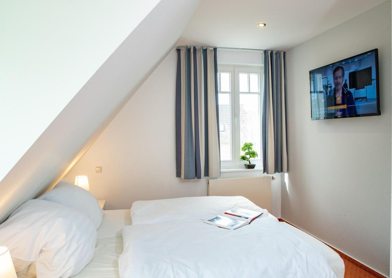 Schlafzimmer 2: zwei Einzelbetten, Kleiderschrank, Kommode und ein zusätzlicher Fernseher