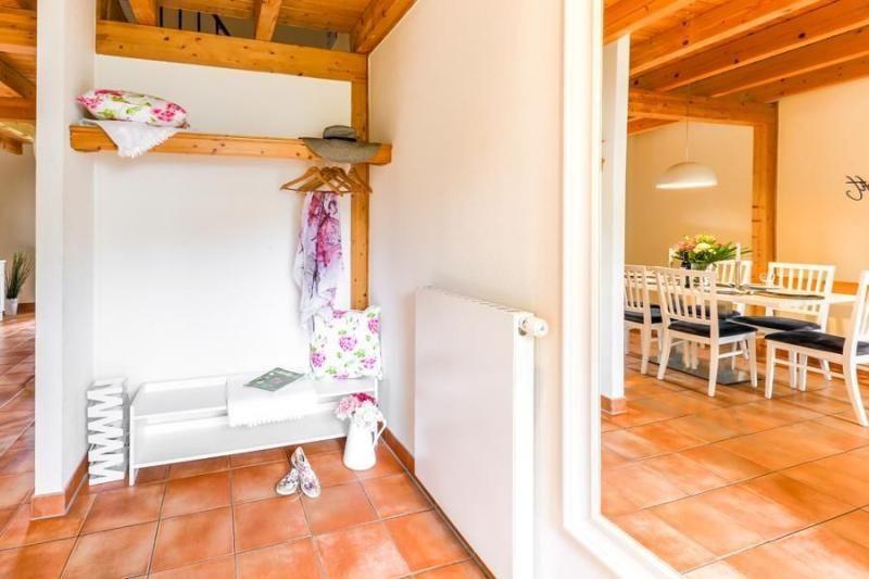 Der Eingangsbereich empfängt Sie mit einer einladenden Diele inklusive Garderobe mit großem Spiegel sowie einem separaten Abstellraum, in dem Sie bequem Gepäck, Vorräte oder Strandausrüstung unterbringen können.
