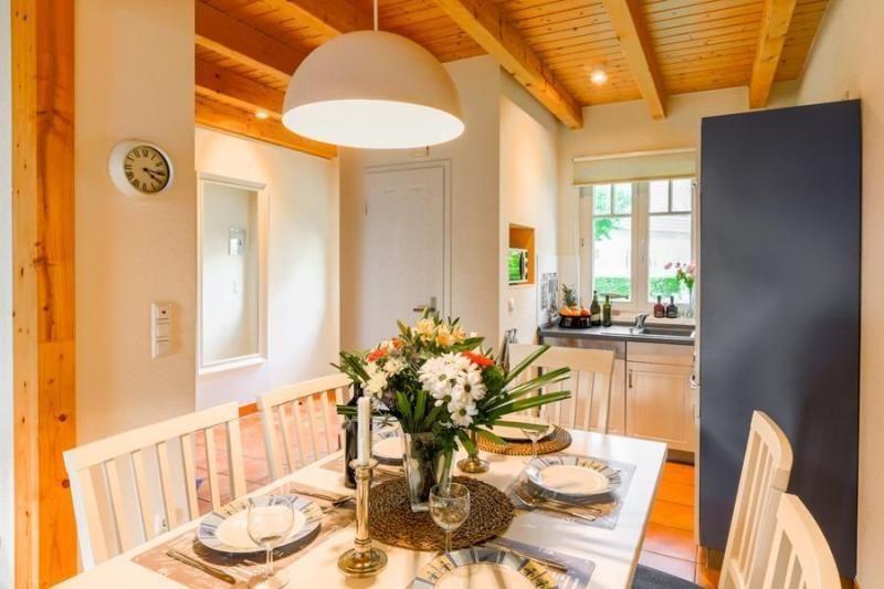 Die moderne, voll ausgestattete Einbauküche lässt keine Wünsche offen: 4-Felder-Herd, Backofen, Mikrowelle, Kühlschrank inkl. Gefrierfach, Geschirrspüler – hier ist alles vorhanden, um Ihre Lieblingsgerichte im Handumdrehen zuzubereiten. Gemeinsam speisen Sie am Esstisch für 6 Personen, der nahtlos in den Wohnbereich integriert ist – gesellige Abende sind garantiert.