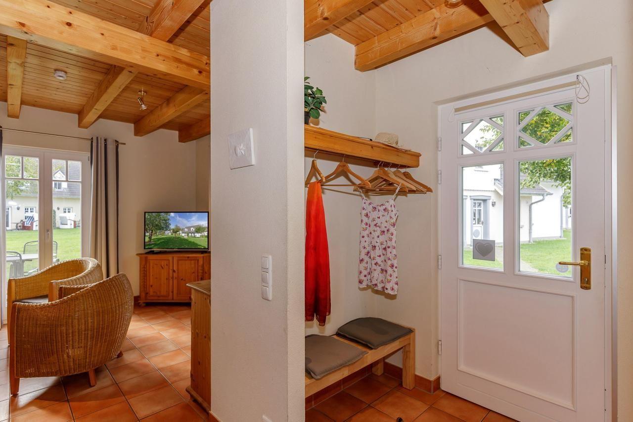 Der Eingangsbereich empfängt Sie mit einer einladenden Diele inklusive Garderobe sowie einem separaten Abstellraum, in dem Sie bequem Gepäck, Vorräte oder Strandausrüstung unterbringen können.