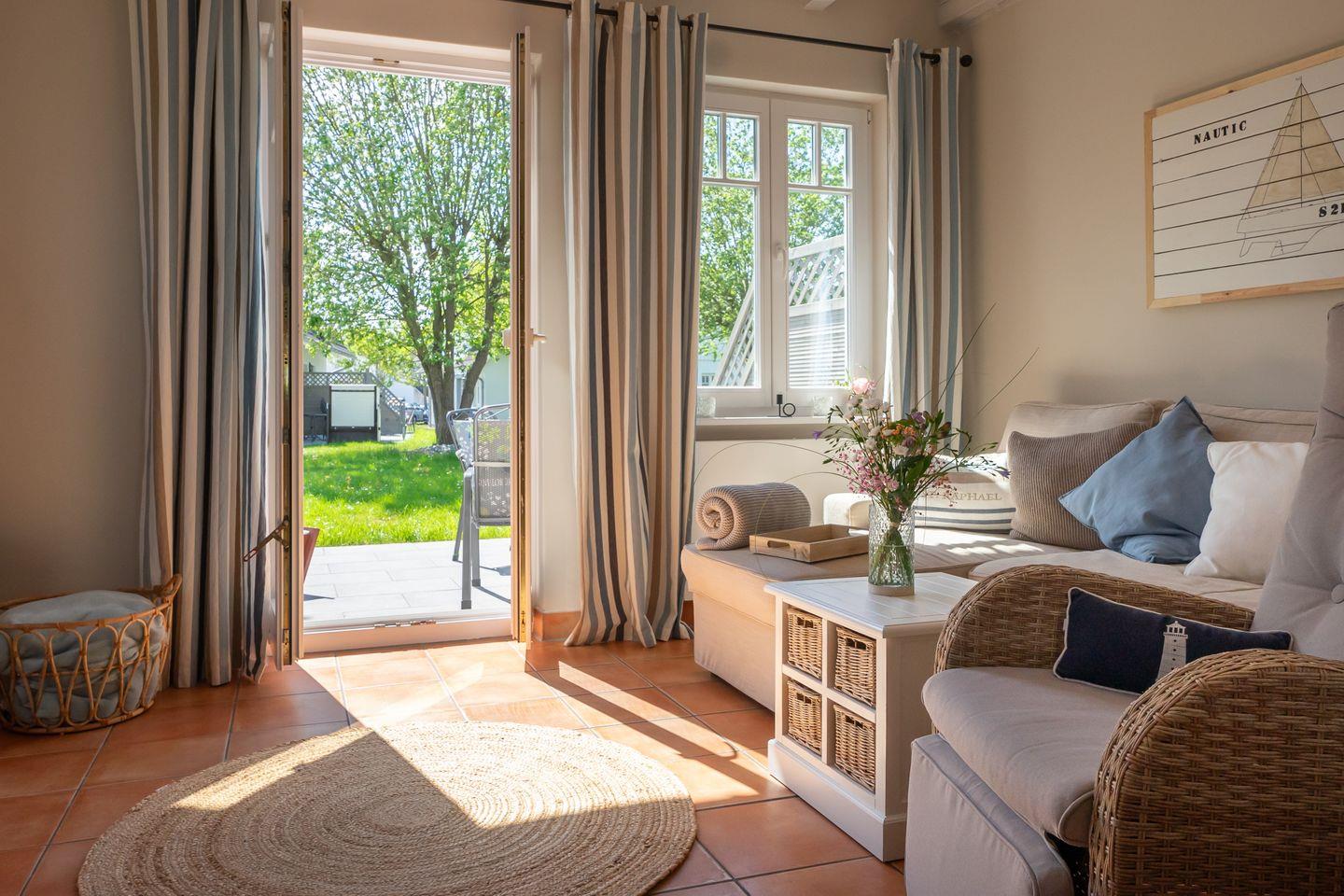 Genießen Sie das Ostsee-Feeling mit der ganzen Familie auf der romantisch anmutenden Terrasse, die Ihnen einen fantastischen freien Blick auf die Ruhe ausstrahlende Umgebung mit weitläufigen Rasenflächen, die das Ferienhaus umfassen, bietet. Moderne Gartenmöbel und ein hübscher Strandkorb laden zum gemütlichen Verweilen ein und vervollständigen das harmonische Ambiente im Außenbereich des Hauses.