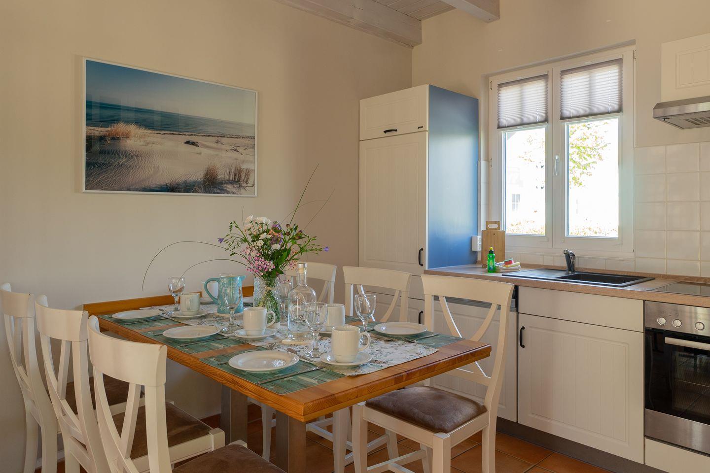 Die moderne, voll ausgestattete Einbauküche lässt keine Wünsche offen: 4-Felder-Herd, Backofen, Kühlschrank inkl. Gefrierfach, Geschirrspüler und Mikrowelle. Hier ist alles vorhanden, um Ihre Lieblingsgerichte im Handumdrehen zuzubereiten. Gemeinsam speisen Sie am großzügigen Esstisch für 6 Personen, der nahtlos in den Wohnbereich integriert ist – gesellige Abende sind garantiert.