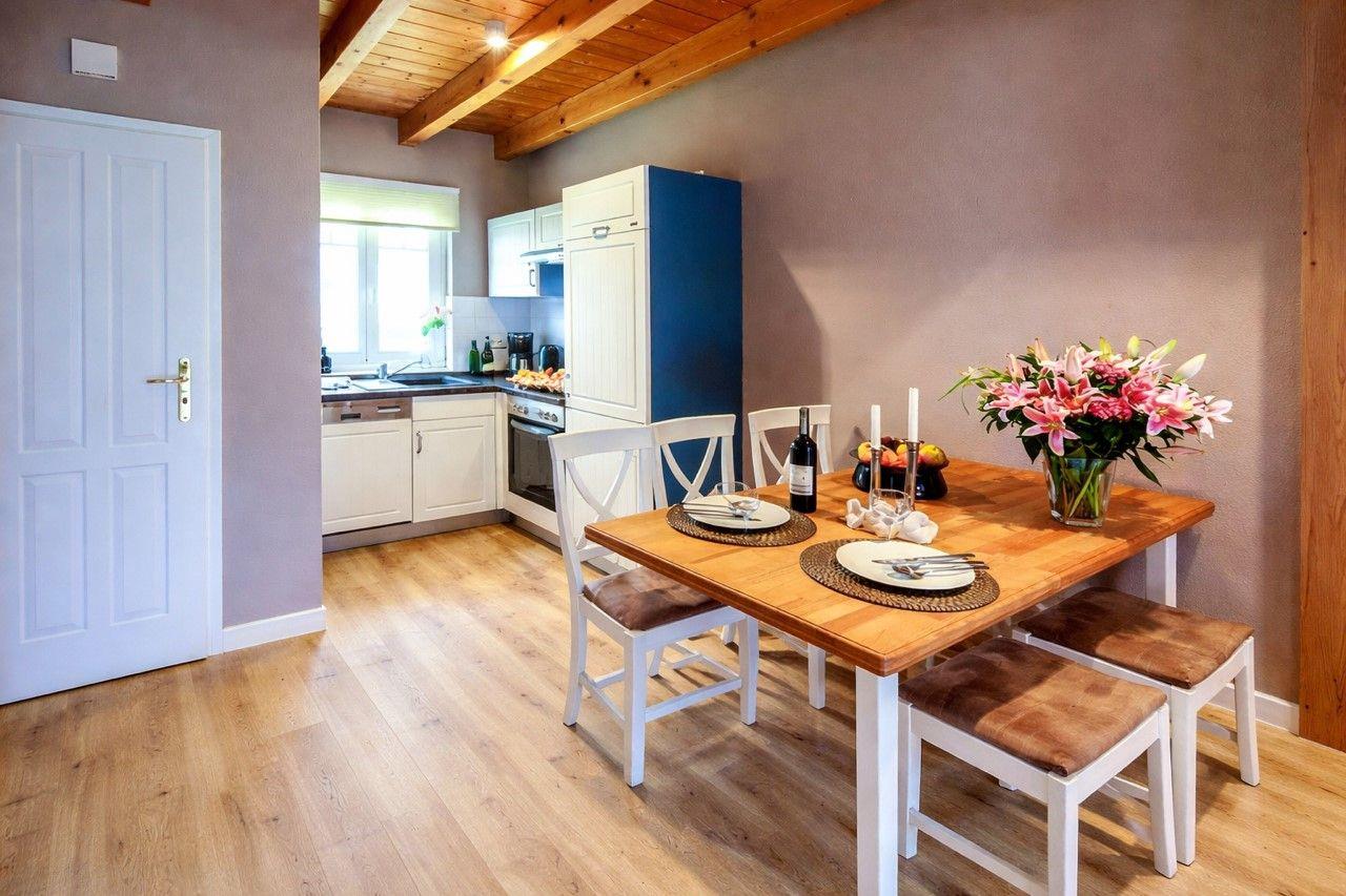 Die moderne, voll ausgestattete Einbauküche lässt keine Wünsche offen: 4-Felder-Herd, Backofen, Mikrowelle, Kühlschrank inkl. Gefrierfach und Geschirrspüler. Hier ist alles vorhanden, um Ihre Lieblingsgerichte im Handumdrehen zuzubereiten. Gemeinsam speisen Sie am großzügigen Esstisch für 6 Personen, der nahtlos in den Wohnbereich integriert ist – gesellige Abende sind garantiert.