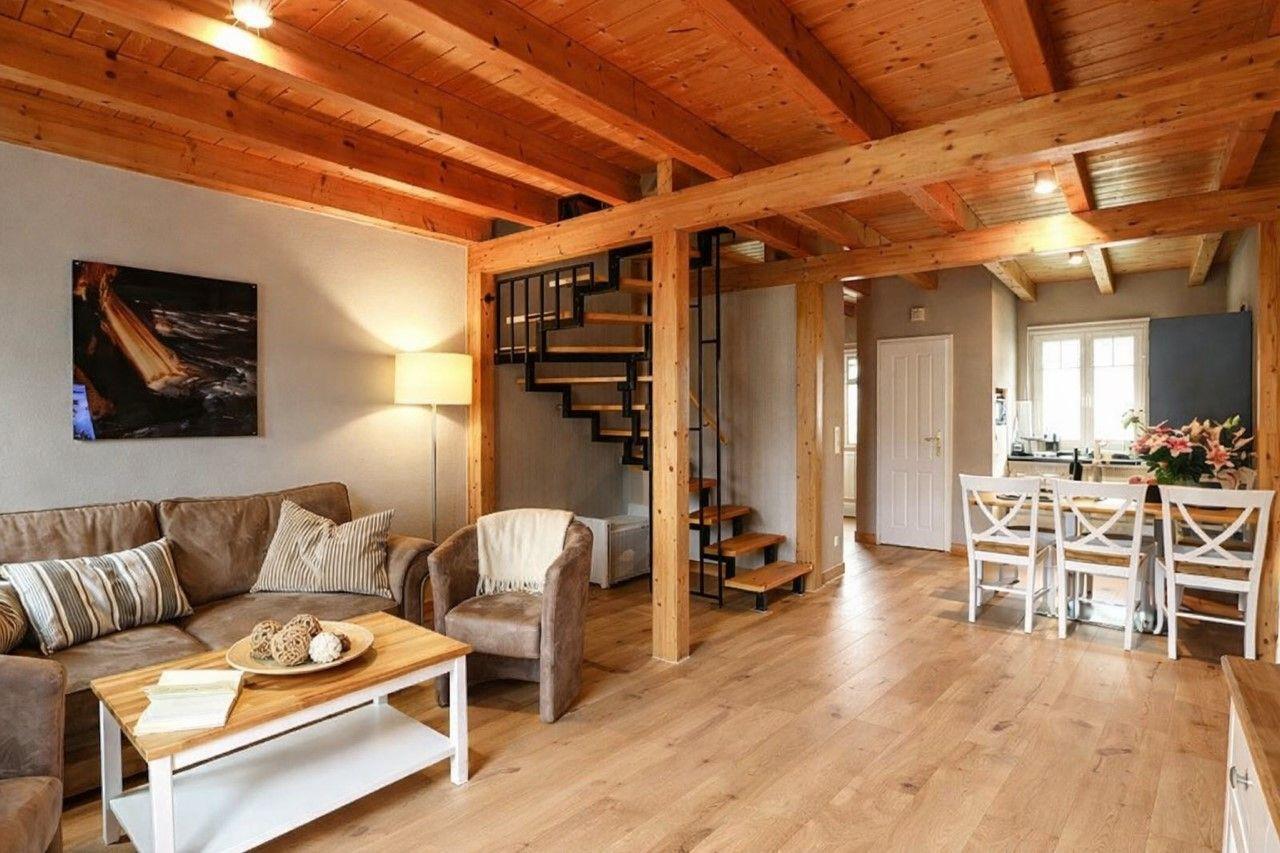 Im Erdgeschoss erwartet Sie ein liebevoll gestalteter Wohnbereich mit zwei bequemen Sesseln und einer gemütlichen Schlafcouch, die sich bei Bedarf in einen komfortablen Schlafplatz für zwei Personen verwandeln lässt. Warme Farben, stilvolle Dekoration und hochwertige Möbel schaffen eine behagliche Atmosphäre – perfekt für entspannte Abende nach einem erlebnisreichen Tag an der Ostsee.