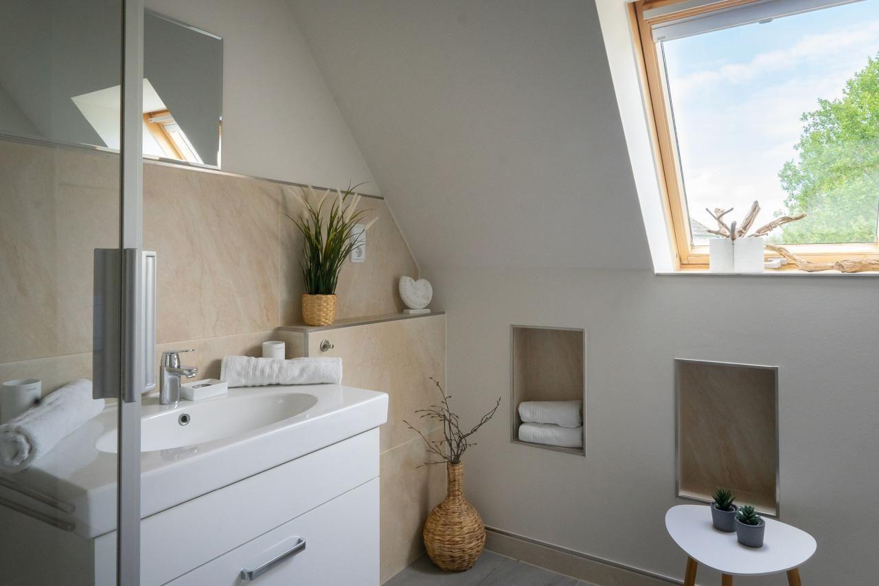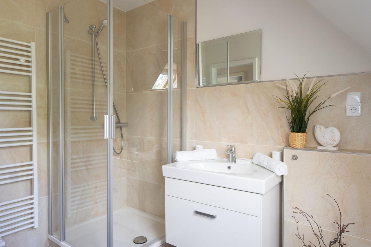 Das moderne Badezimmer bietet alles, was Sie für einen entspannten Start in den Tag brauchen: Dusche, WC, Waschbecken mit großzügigem Unterschrank, Handtuchtrockner und ausreichend Ablageflächen für Ihre Pflegeprodukte.
