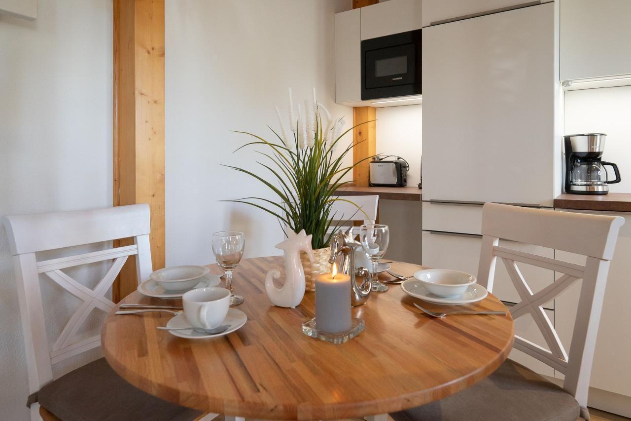 Ein Esstisch mit 4 Stühlen sowie eine moderne Küche mit 4-Felder-Herd, Backofen, Kühlschrank inkl. Gefrierfach, Mikrowelle, Geschirrspüler und allen nötigen Küchenutensilien lassen keine Wünsche offen.