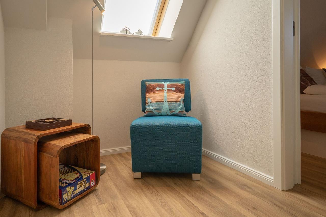 Im Erdgeschoss befindet sich das stilvolle Wohnzimmer mit zwei Sesseln und einer ausziehbaren Schlafcouch für bis zu zwei Personen. Für Ihre Unterhaltung sorgen ein Flachbild-TV, CD-Player, Radio und eine HiFi-Anlage.