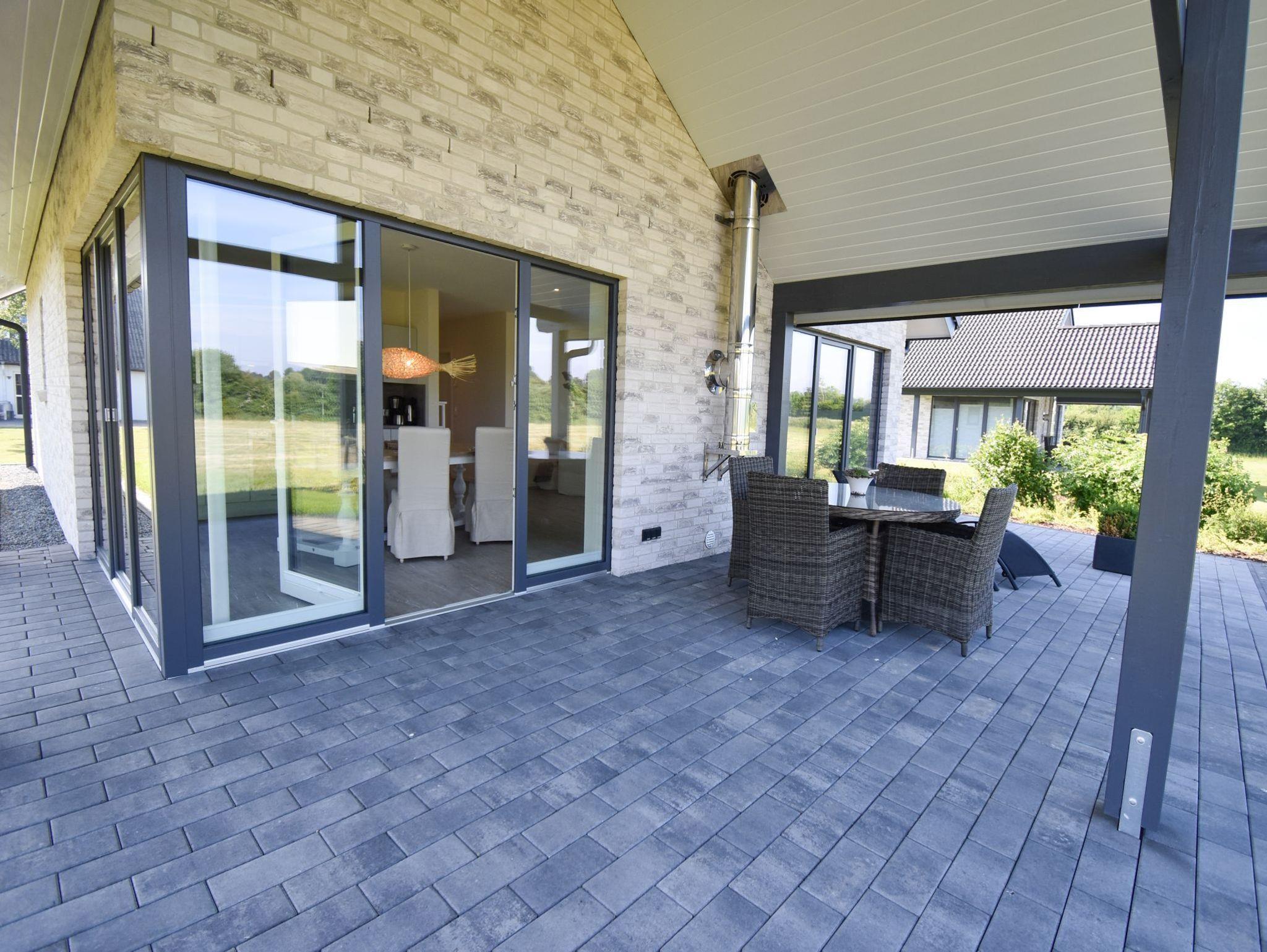 Modernes Ferienhaus mit Meerblick, Sauna und Terrasse nahe der Ostsee in idyllischer Natur.