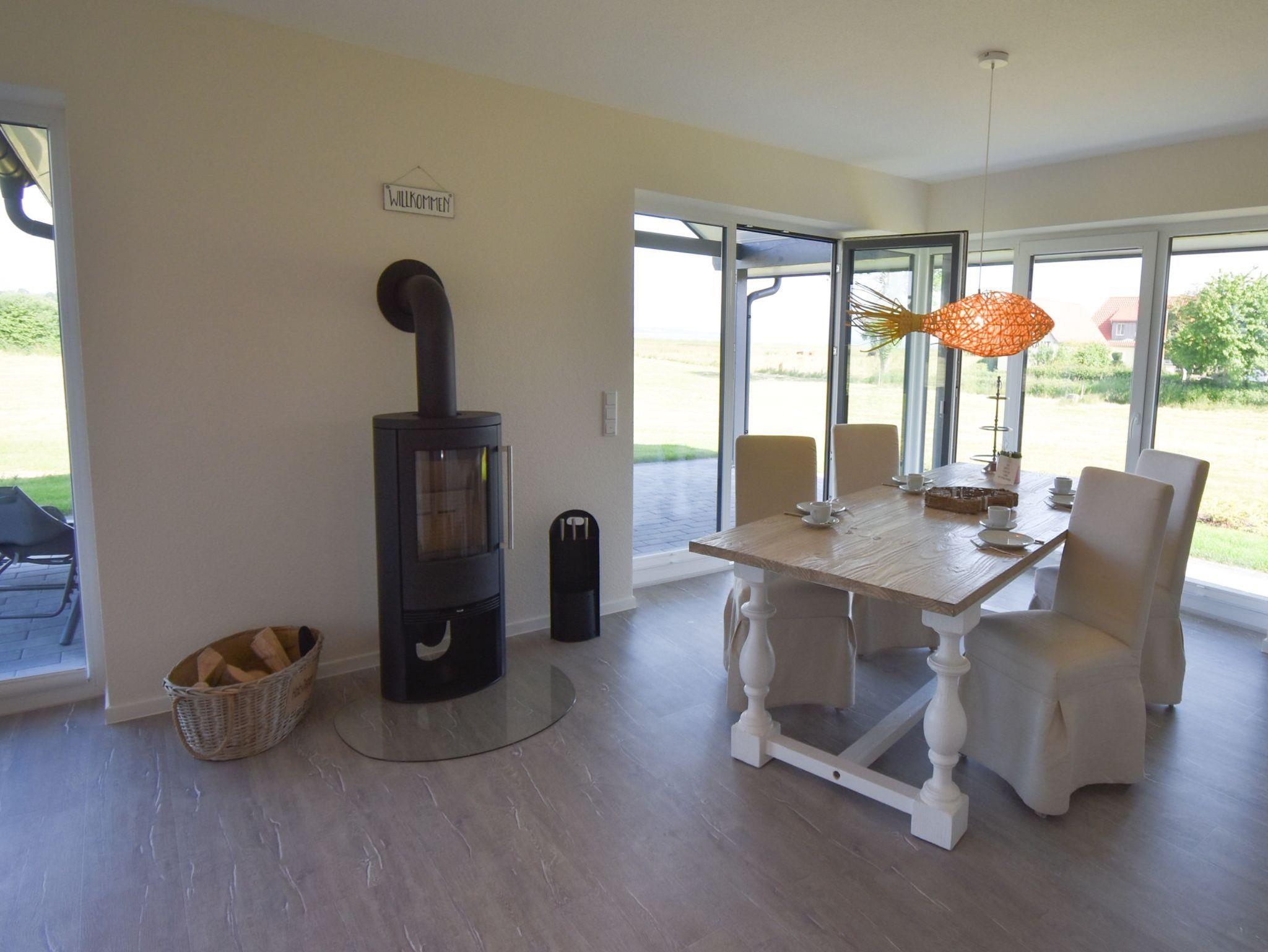 • Wohn- und Essbereich mit offener Küche, massivem Esstisch (2,50 m lang), Induktionskochfeld, Kaminofen und anliegender Terrasse