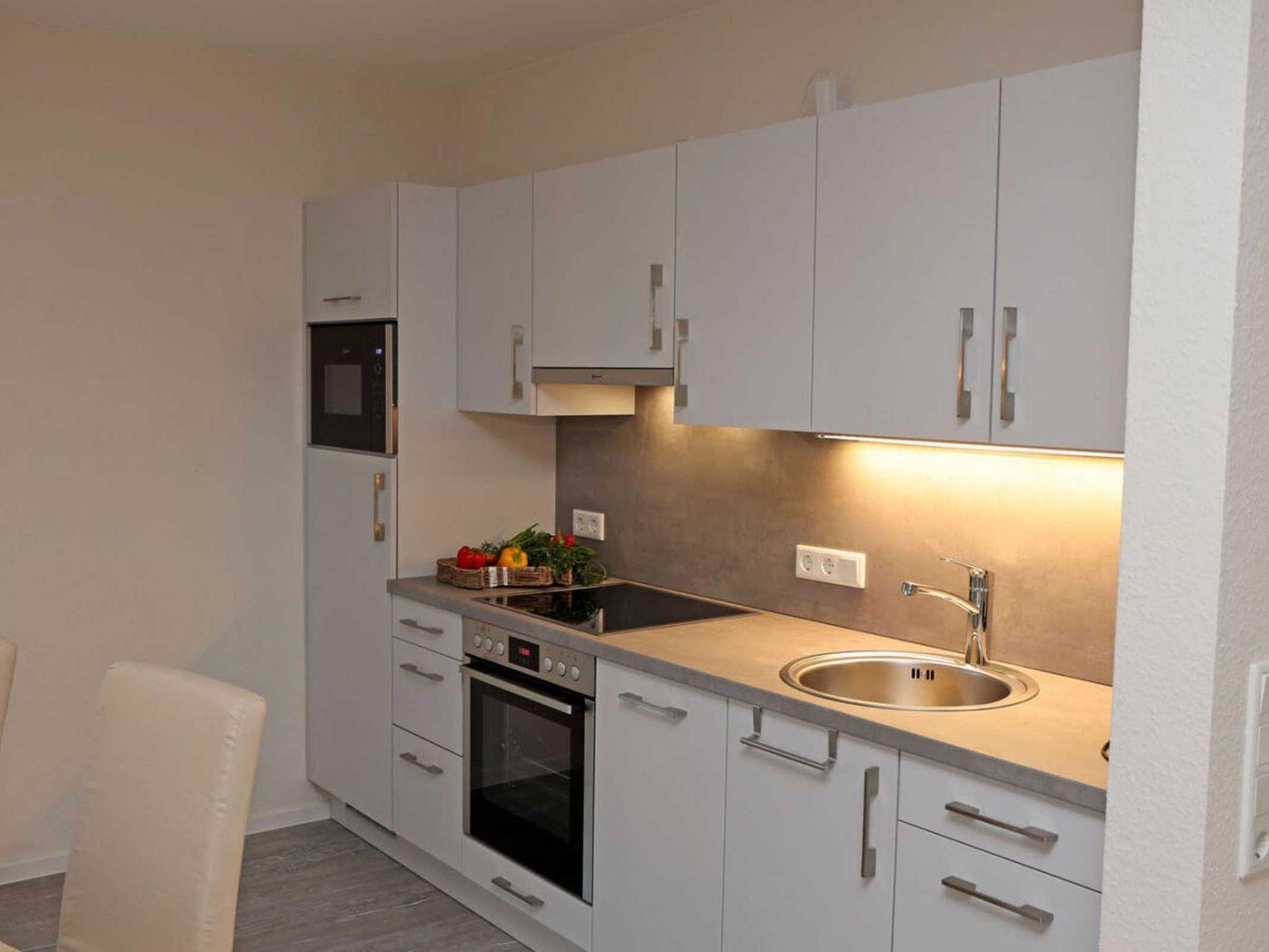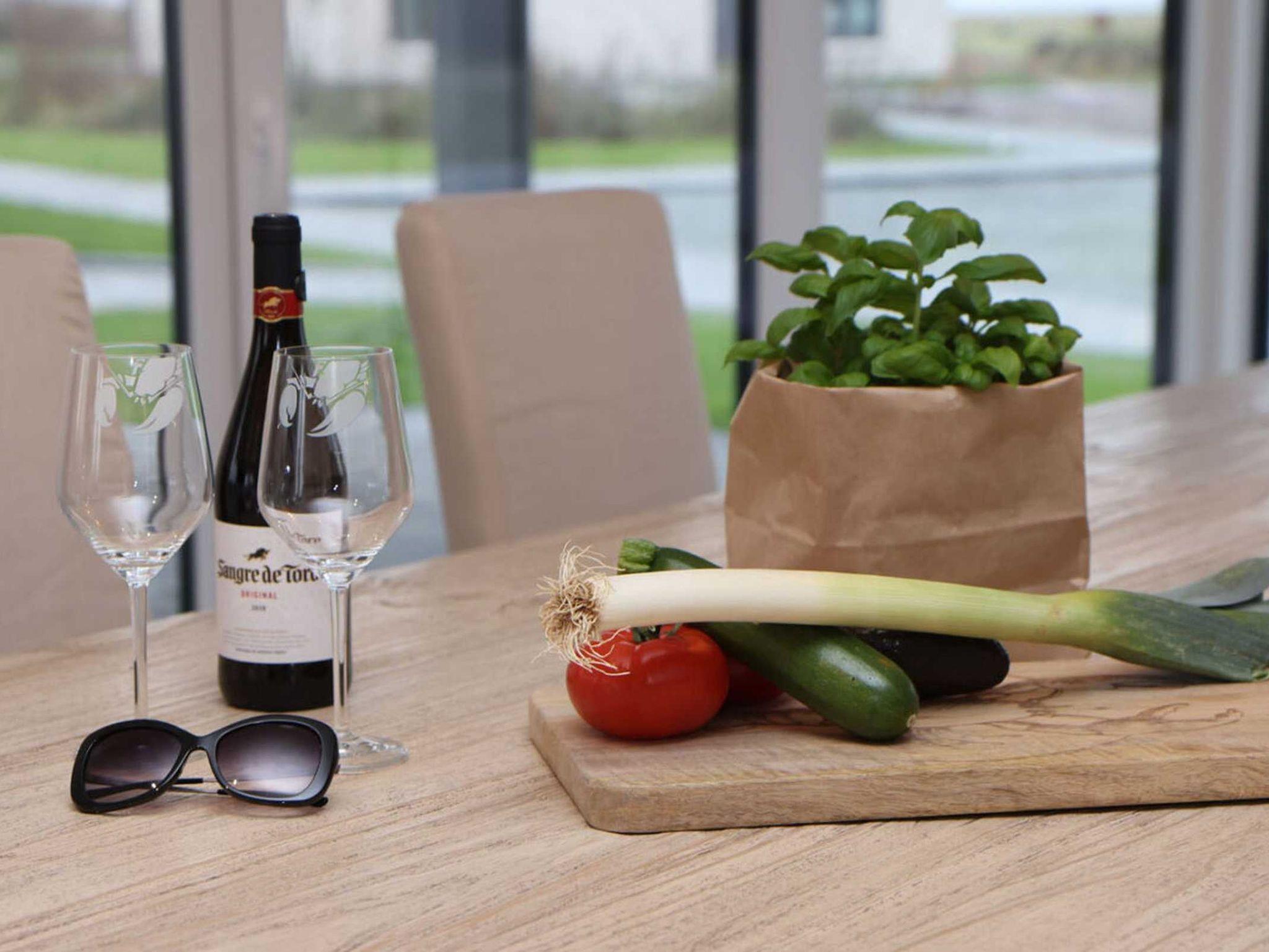 • Wohn- und Essbereich mit offener Küche, massivem Esstisch (2,50 m lang), Induktionskochfeld, Kaminofen und anliegender Terrasse