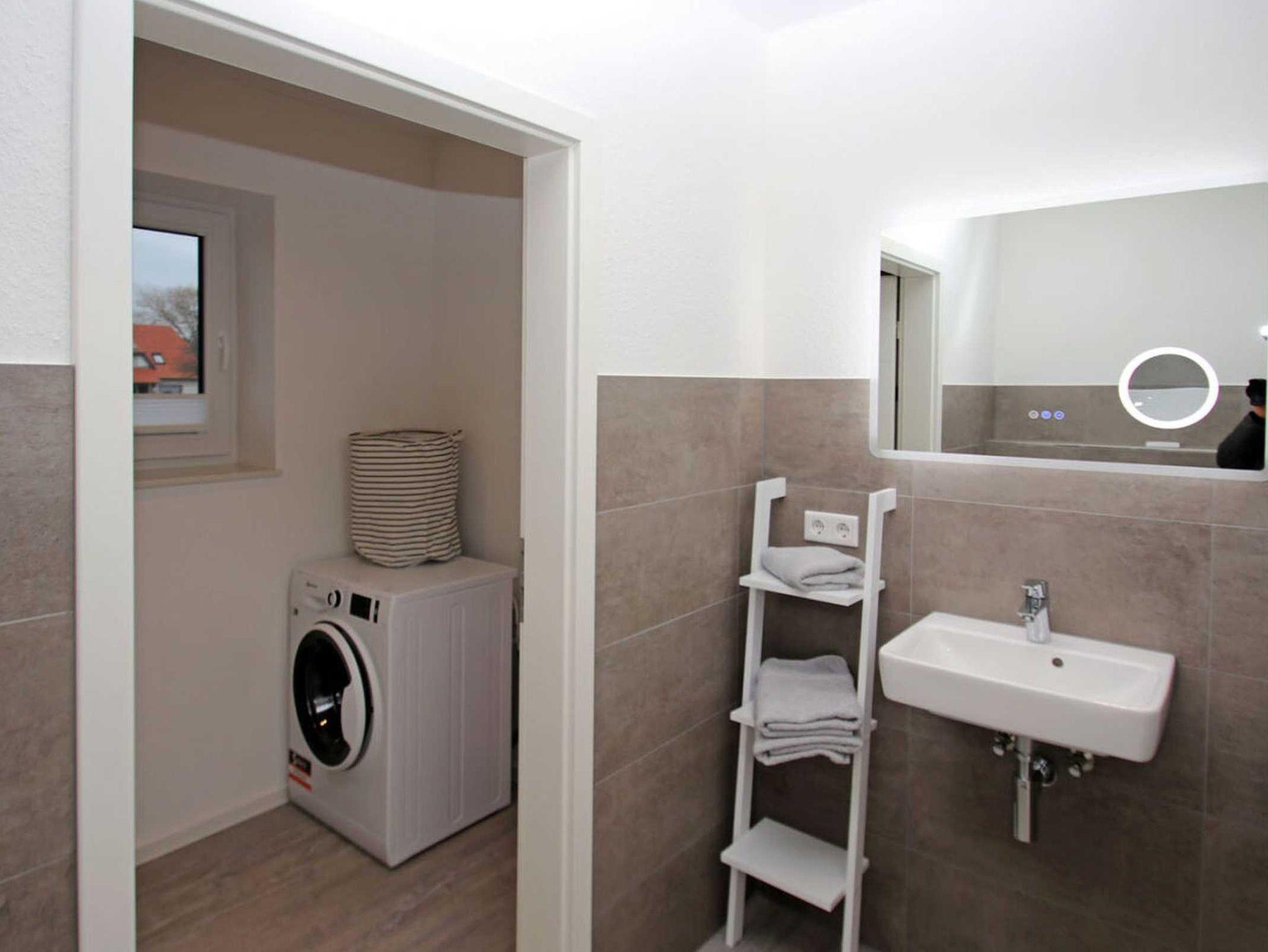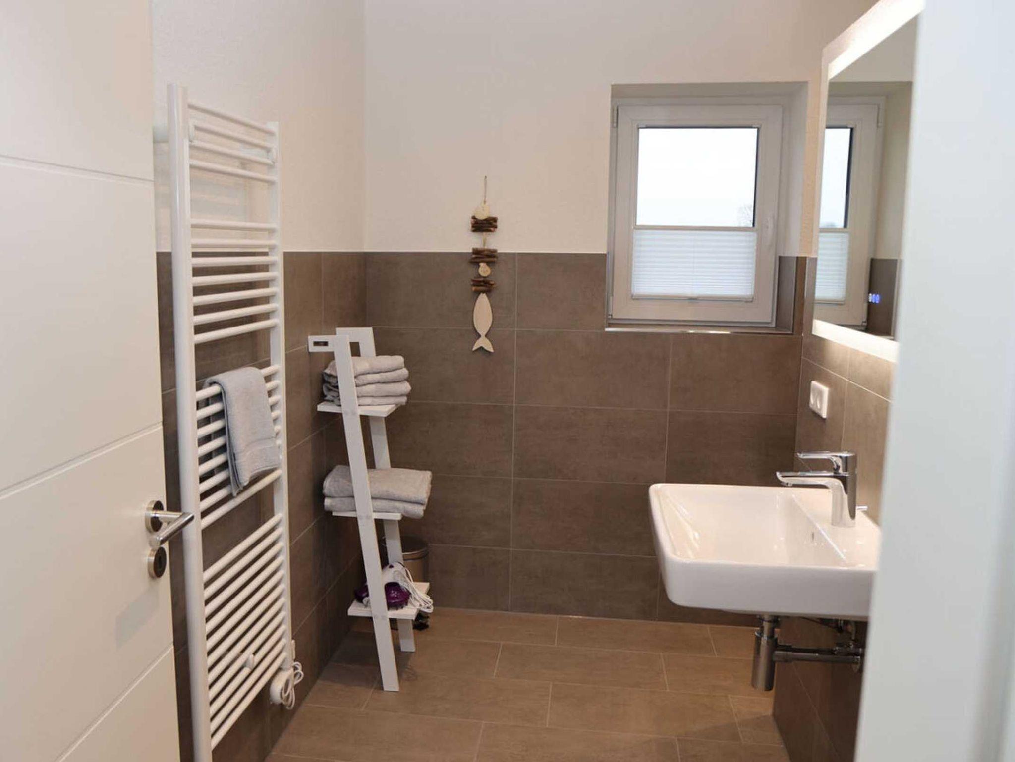 • Badezimmer mit bodengleicher Regendusche, Handtuchheizung und beheizbarem Spiegel mit LED Ambientebeleuchtung; Handtücher zu buchbar