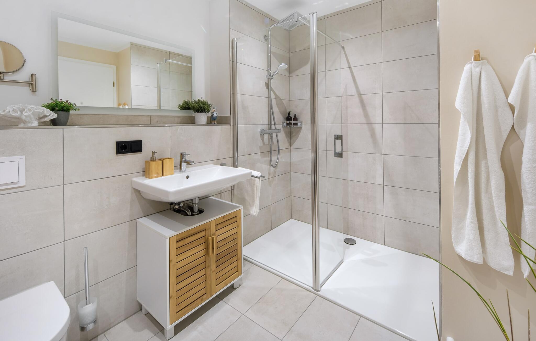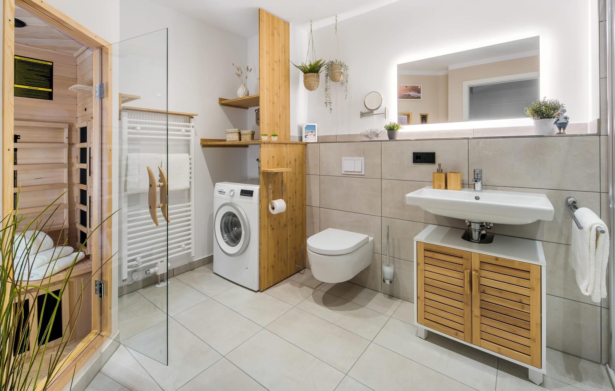 Auf dieser Etage befindet sich zudem ein bestens ausgestattetes Badezimmer mit bodengleicher Dusche und Infrarot-Sauna. Eine Wohlfühl-Oase, die zu jeder Jahreszeit für Entspannung sorgt.