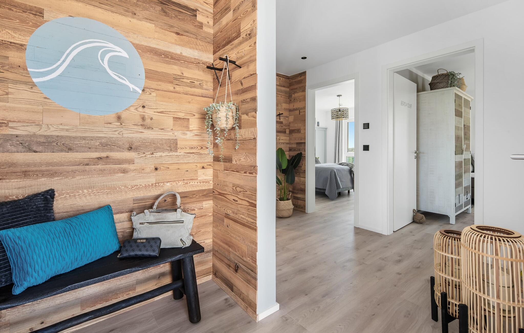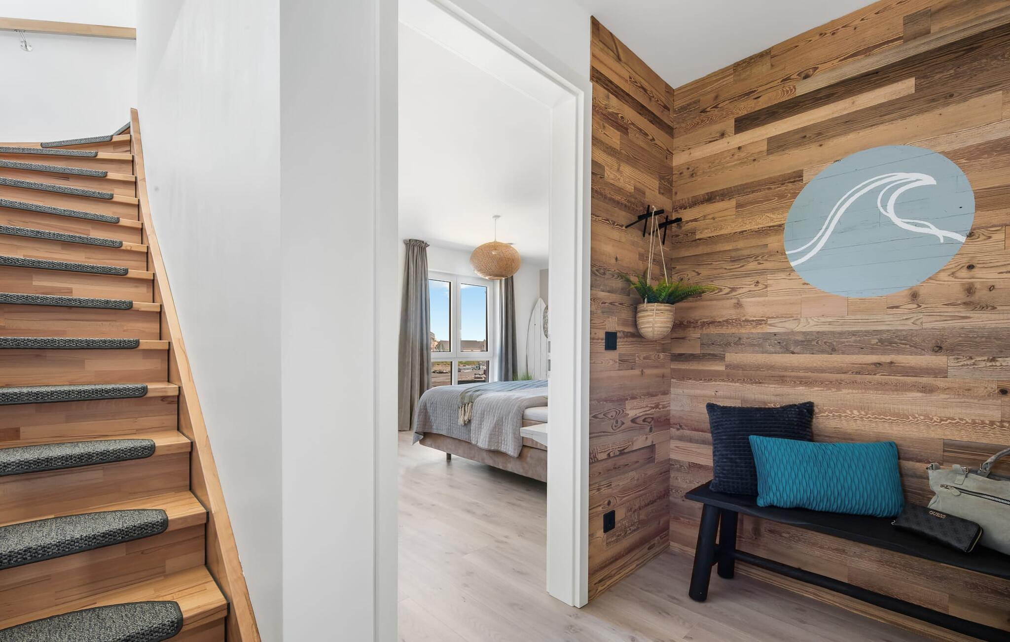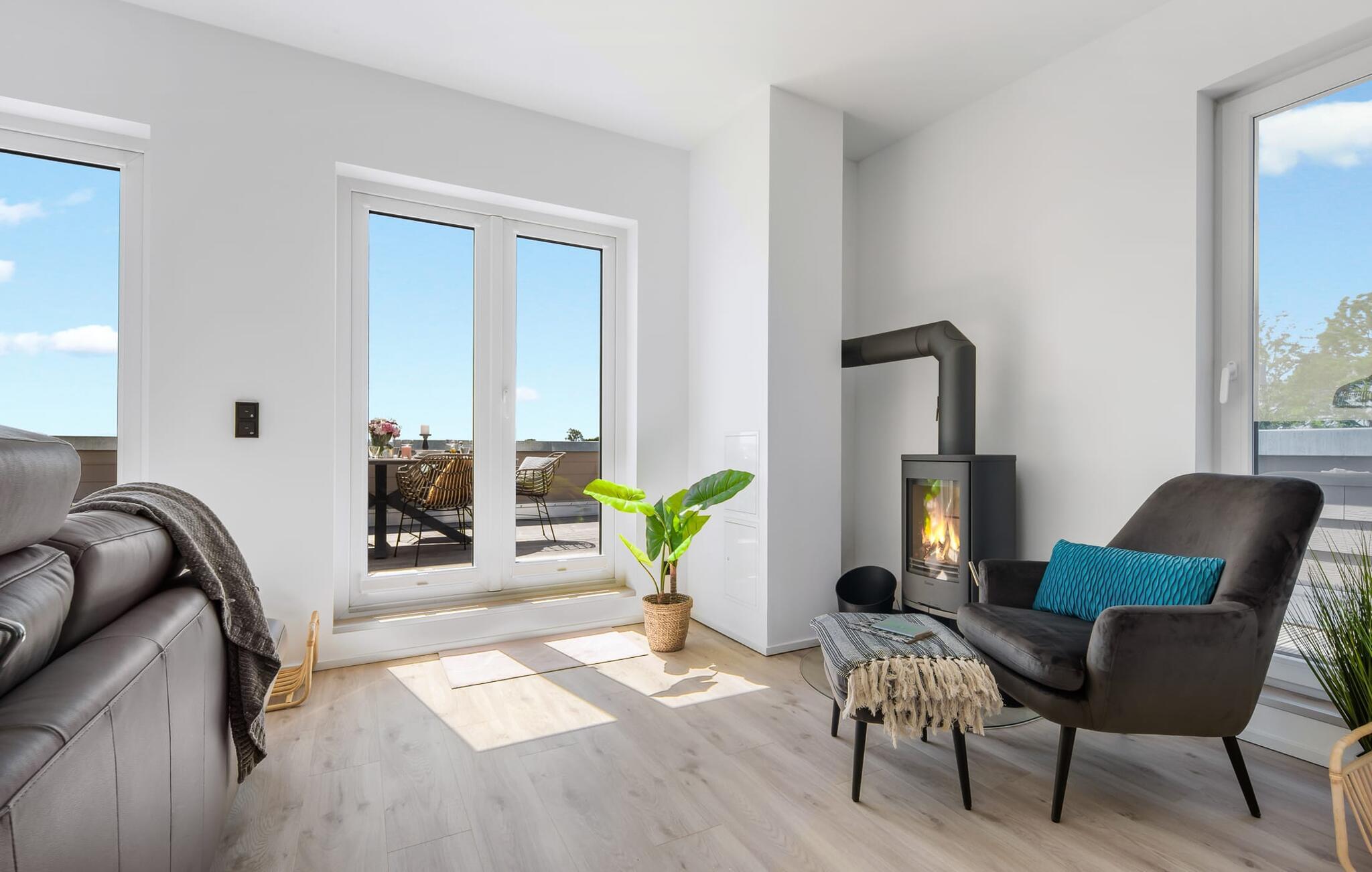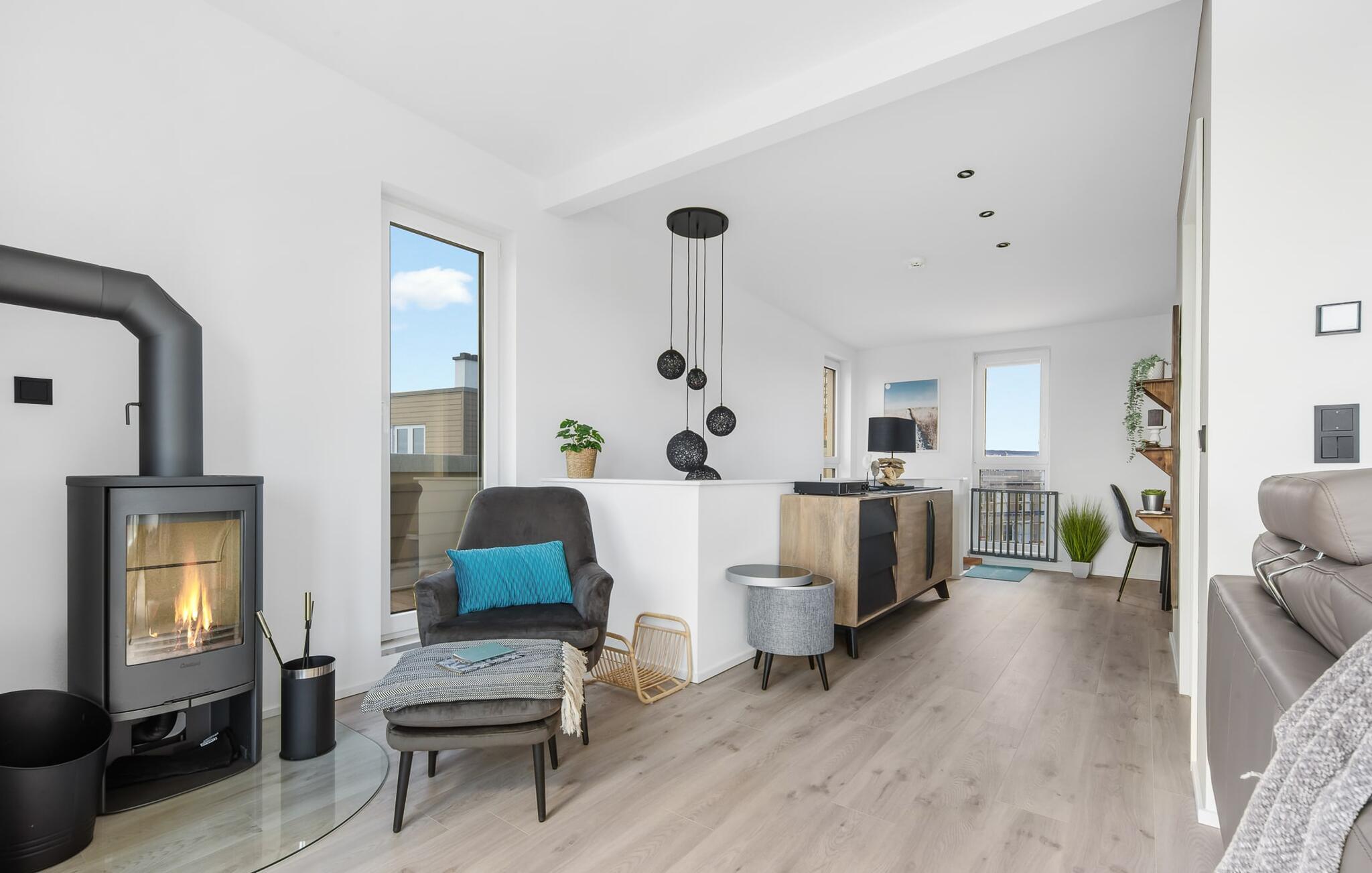 Im zweiten Obergeschoss angekommen, macht OCEANLOFT seinem Namen alle Ehre. Hier werdet ihr von der bodentiefen Fensterfront mit der angrenzenden Terrasse und Blick auf das Meer und die Naturschutz-Salzwiesen empfangen. Eintreten und sich sofort Zuhause fühlen ist Programm. In der Wohnlandschaft mit Kuschelfaktor zu entspannen, aus dem Fenster die Ruhe der Natur genießen oder saunieren ist Erholung pur! Der Alltag entrückt immer mehr... Sollte das Wetter sich einmal von der nordischen Seite zeigen, sorgt der Kaminofen mit seinem prasselnden Feuer für weitere Behaglichkeit.
