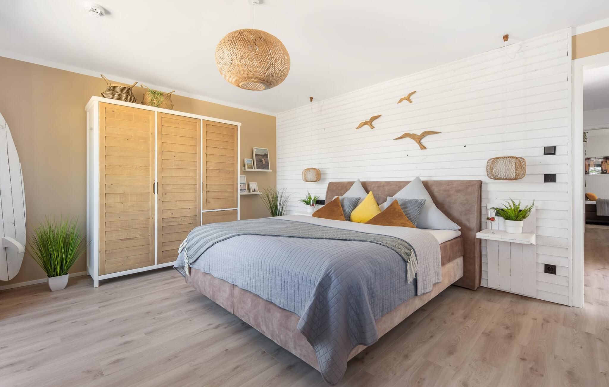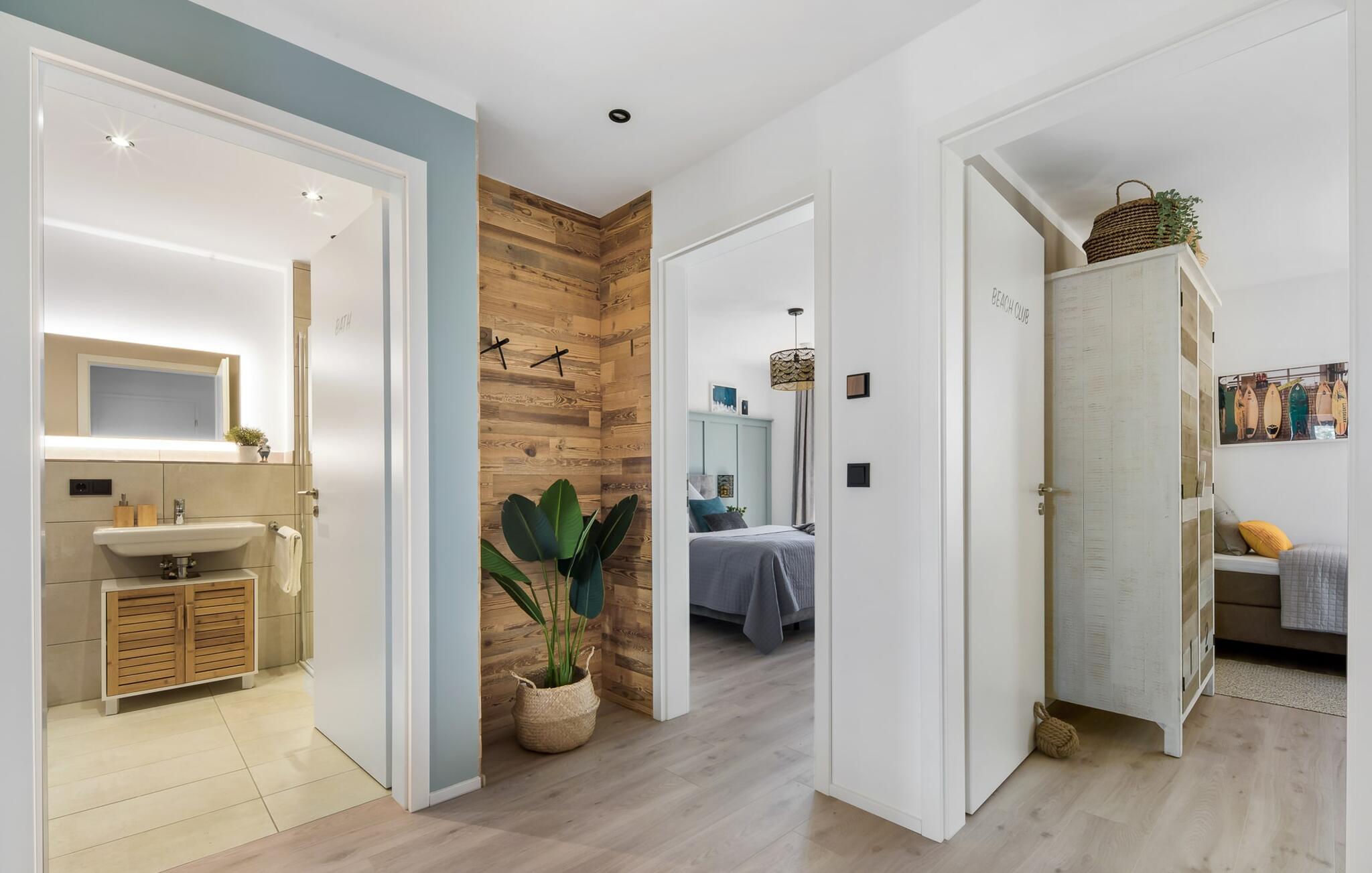Beim Betreten der Ferienwohnung im ersten Obergeschoss beginnt vom ersten Moment an die Entspannung. Ihr befindet euch direkt im Ruhebereich der Wohnung. In dieser Etage befinden sich die drei Schlafzimmer der Wohnung. Egal für welches Schlafzimmer ihr euch entscheidet, erholsamer Schlaf ist euch sicher. Zwei Schlafzimmer sind mit Doppelbetten, eines mit Überlänge (220cm), sowie jeweils einem Fernseher ausgestattet. Das dritte Schlafzimmer empfängt euch mit zwei Einzelbetten.