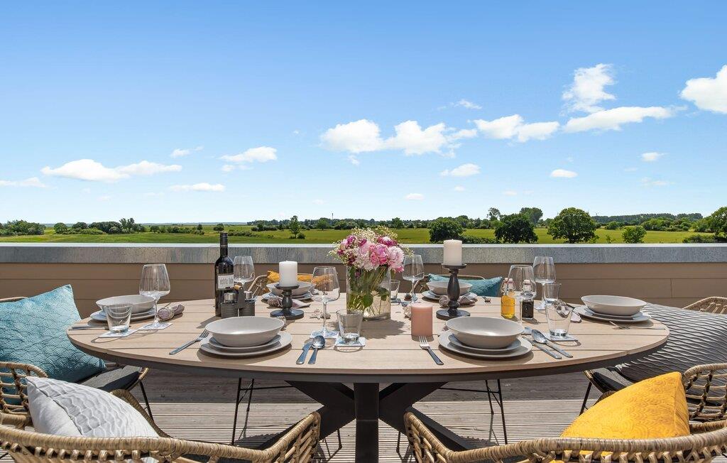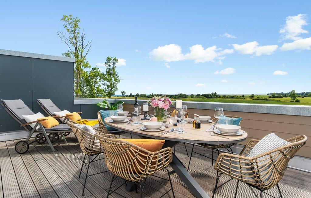 Direkt vom Wohnbereich aus betretet ihr die große Terrasse mit Süd-West-Ausrichtung. Nach hinten ausgerichtet mit Blick auf die Naturschutz-Salzwiesen, Felder und gen Meer sind gemütliche Stunden vorprogrammiert.