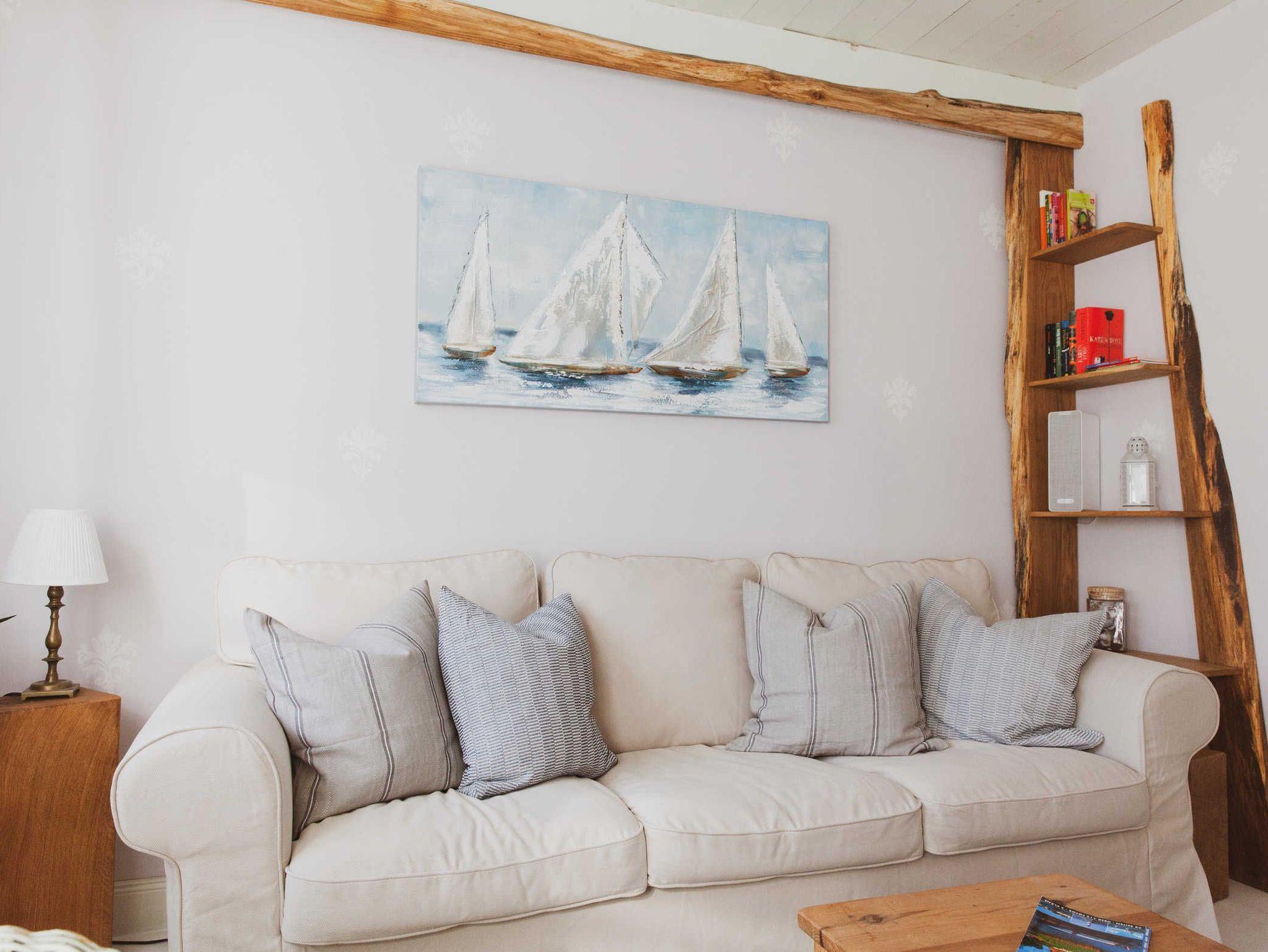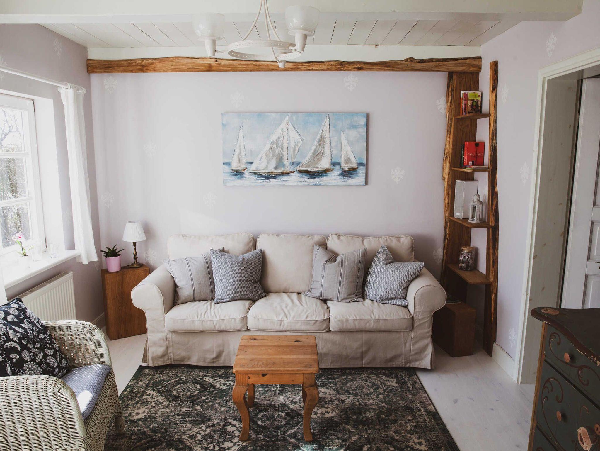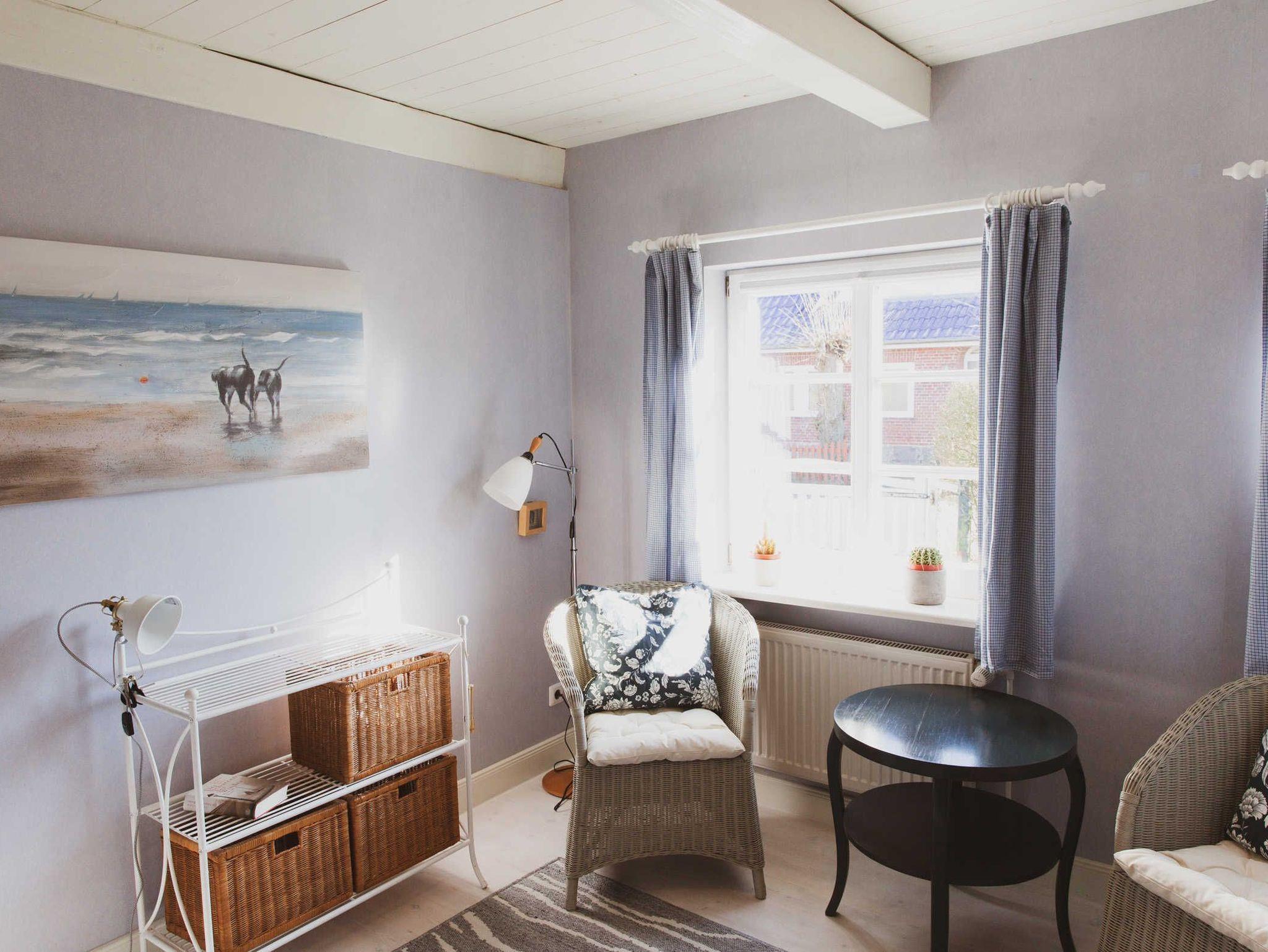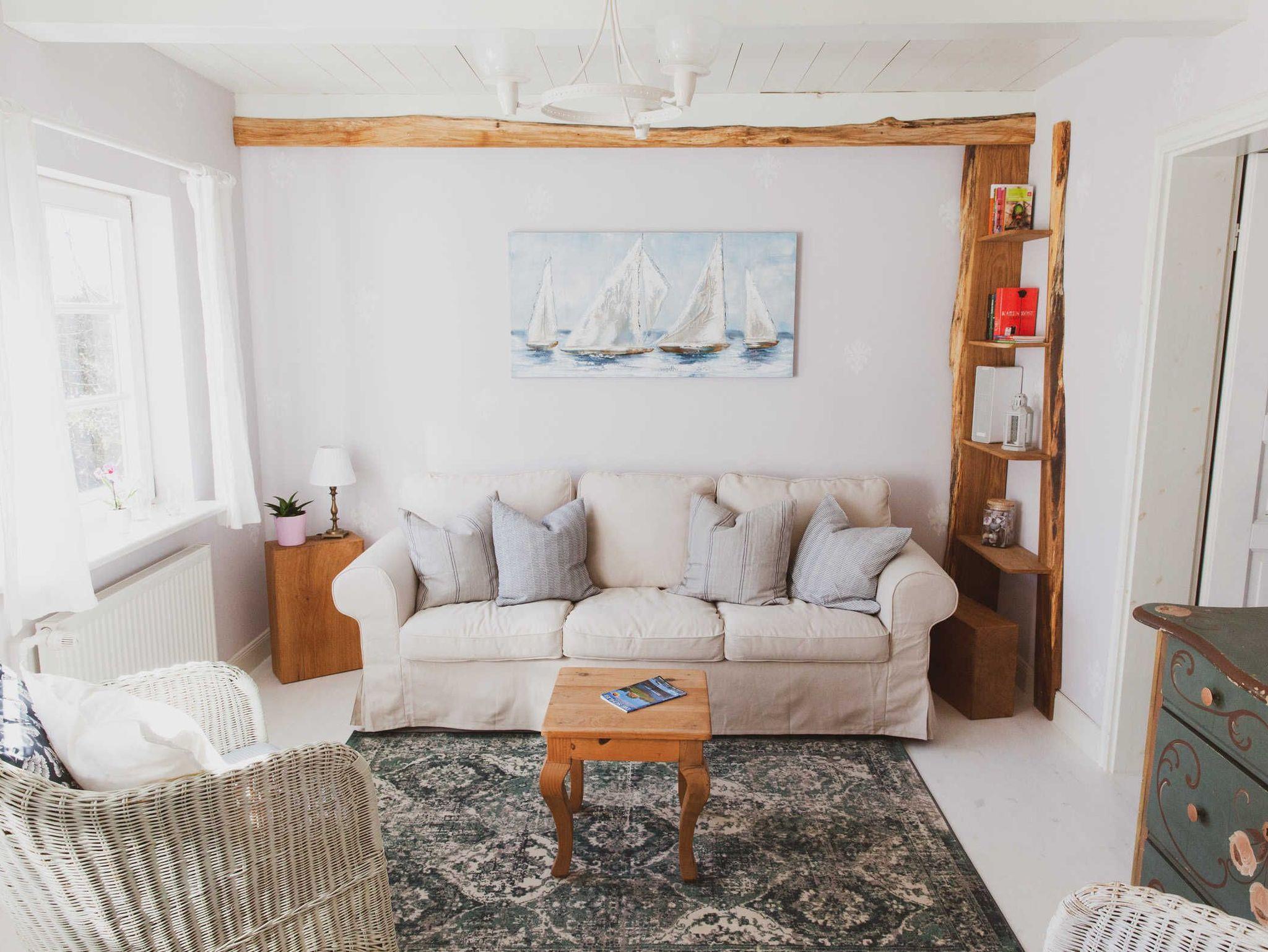 Gemütlich wird es auch im Wohnzimmer mit bewährtem Sofa und zwei großen Korbsesseln zum Lesen und Fernsehen.