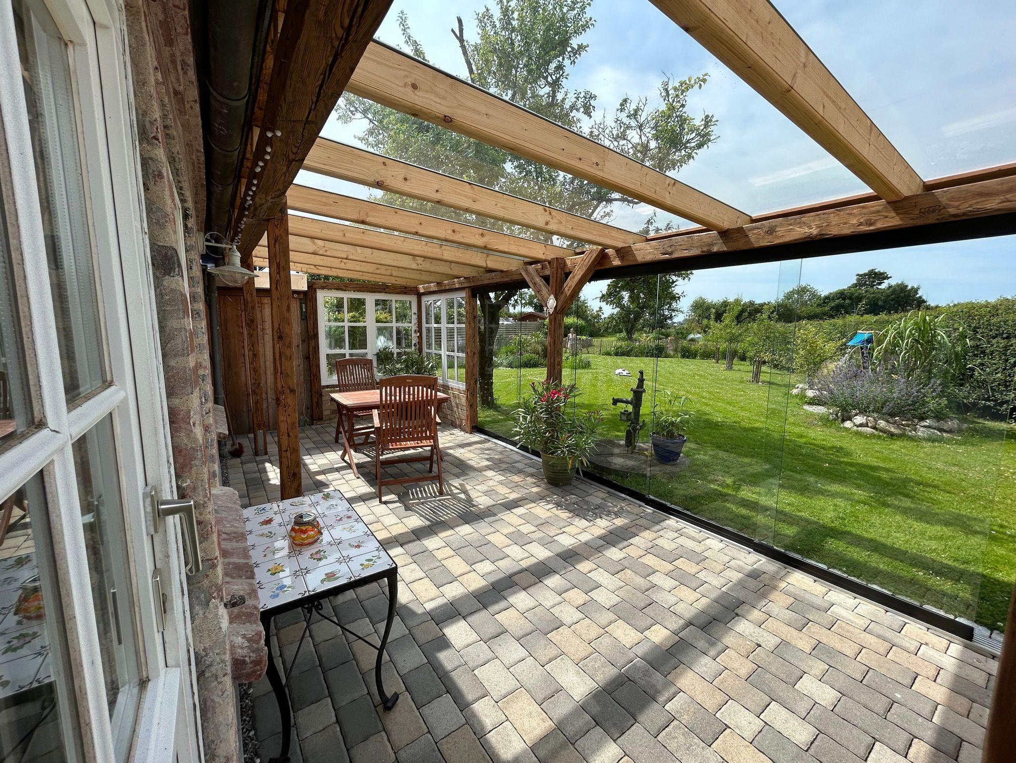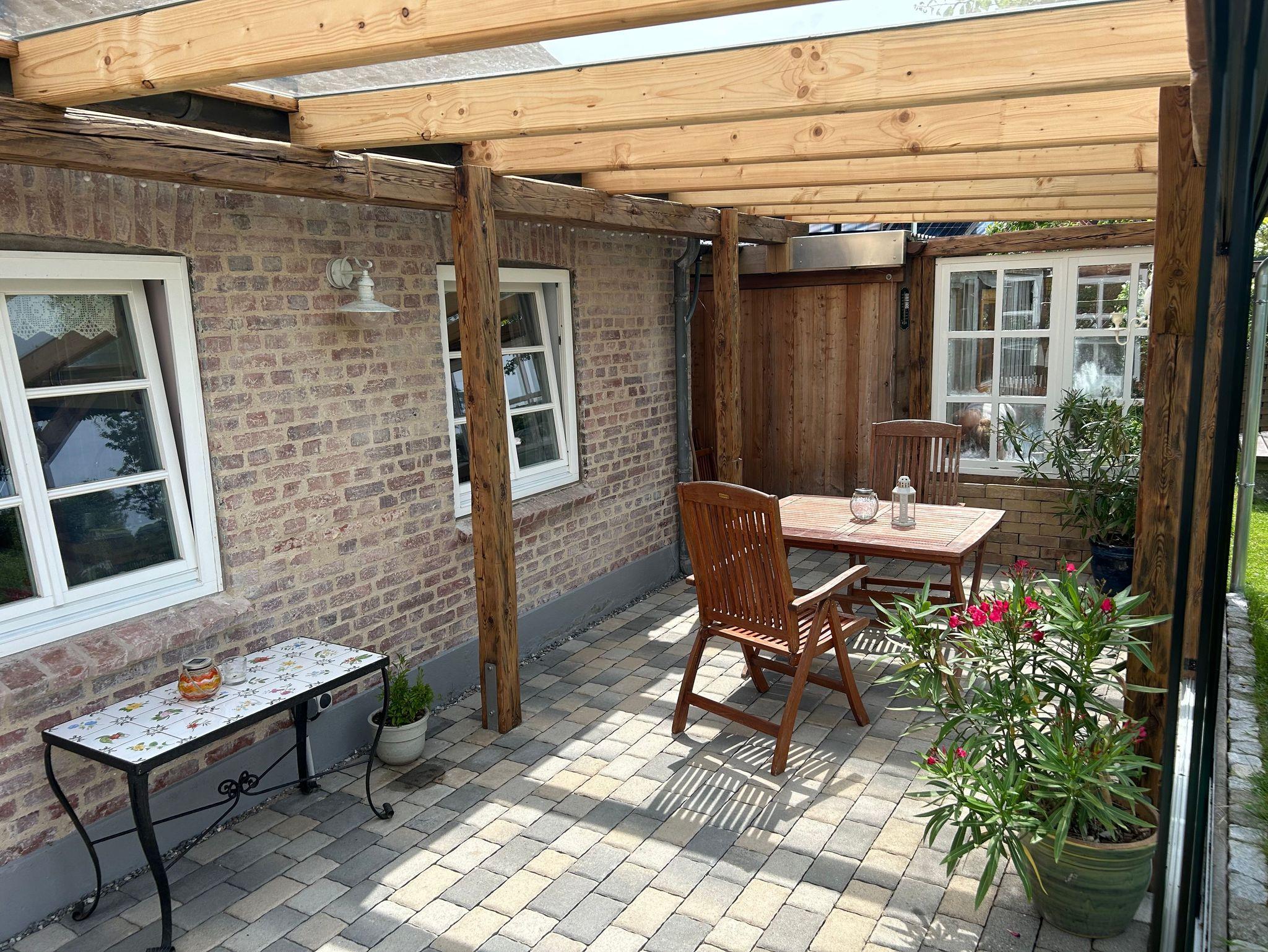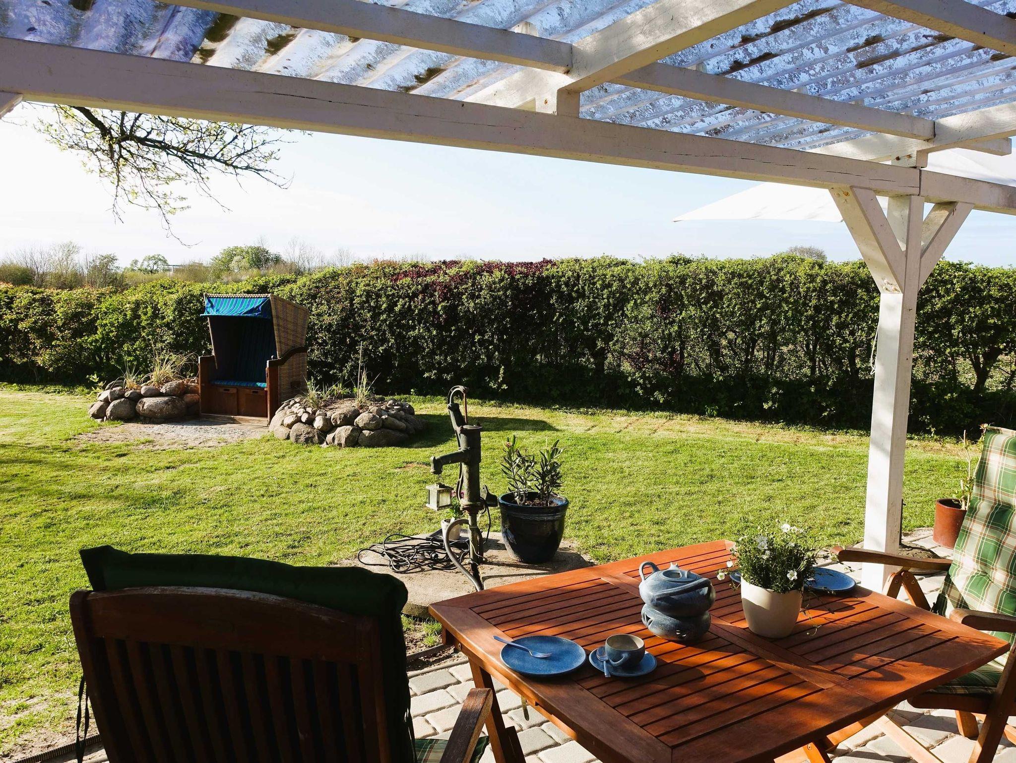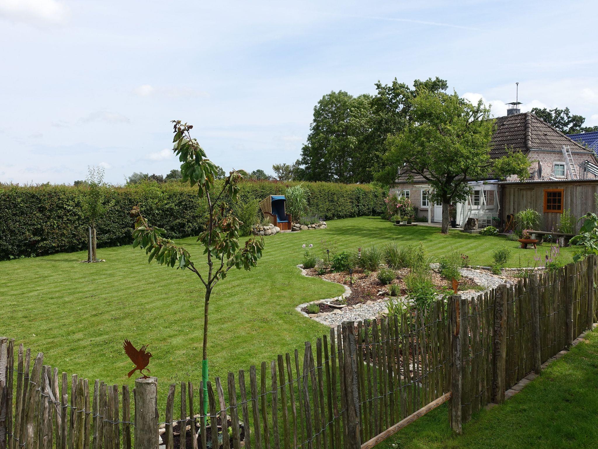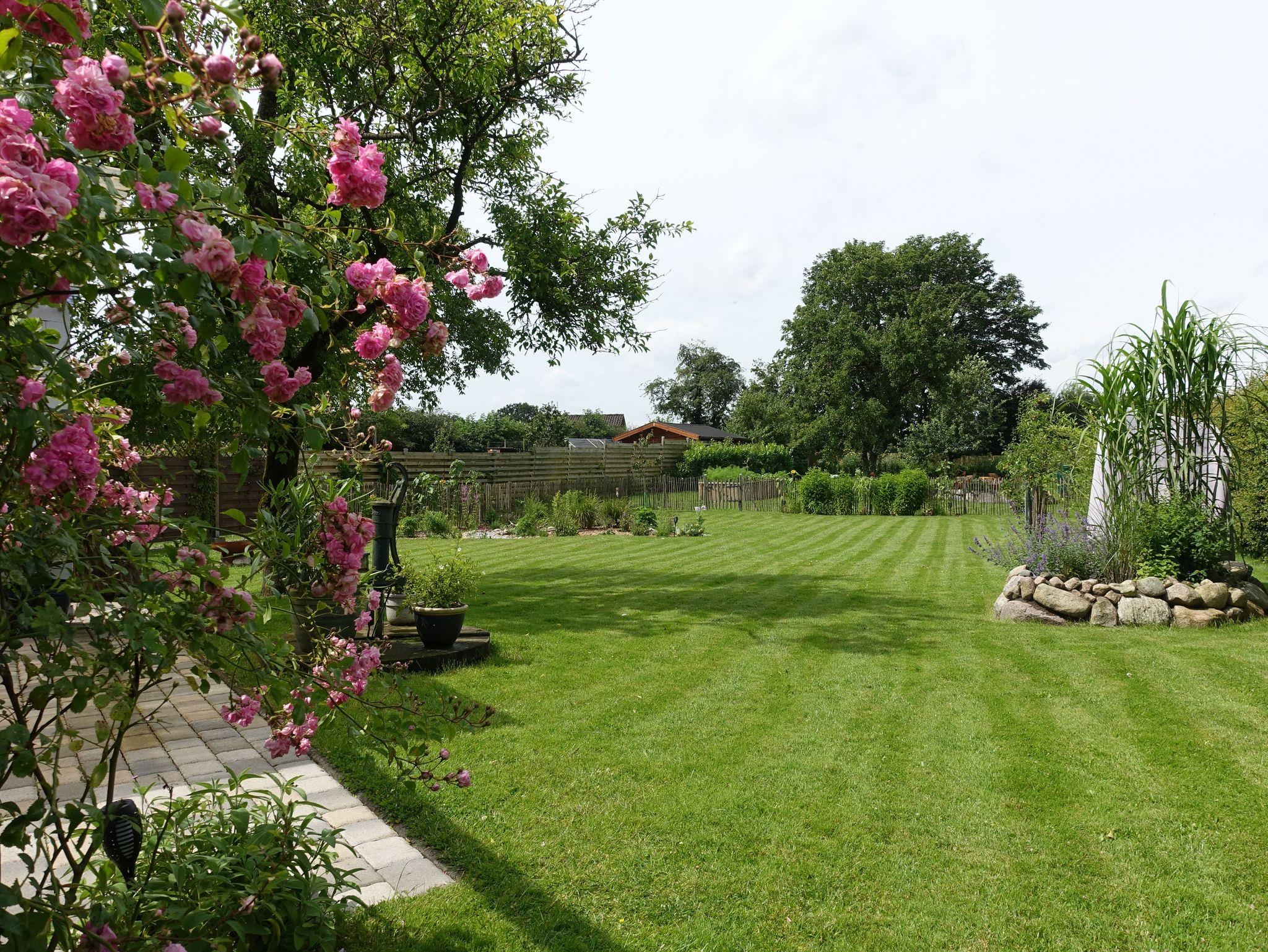 Der über 1000m² große Garten mit altem Baumbestand lädt zum Verweilen ein. Ob im Strandkorb, auf der überdachten Terrasse oder auf der Sonnenliege.