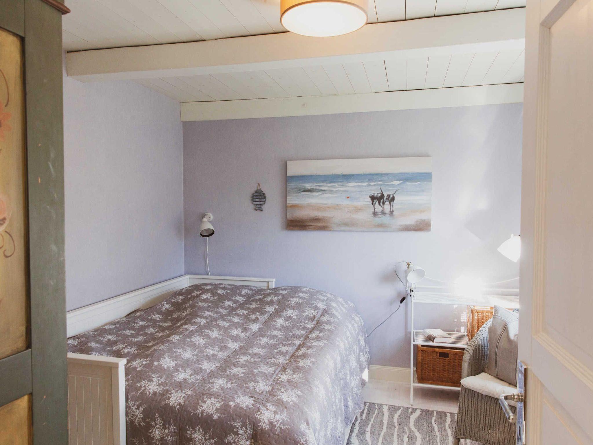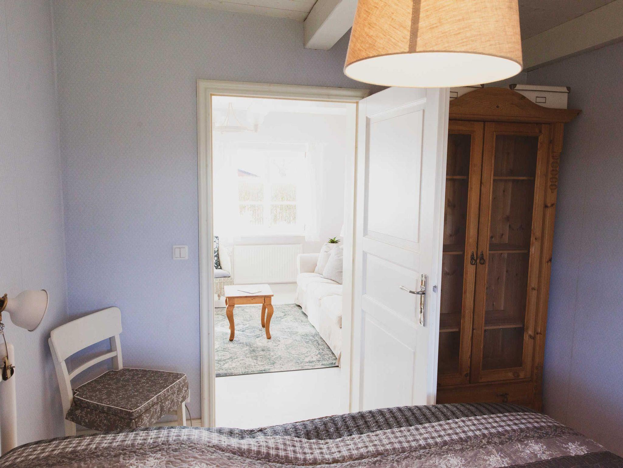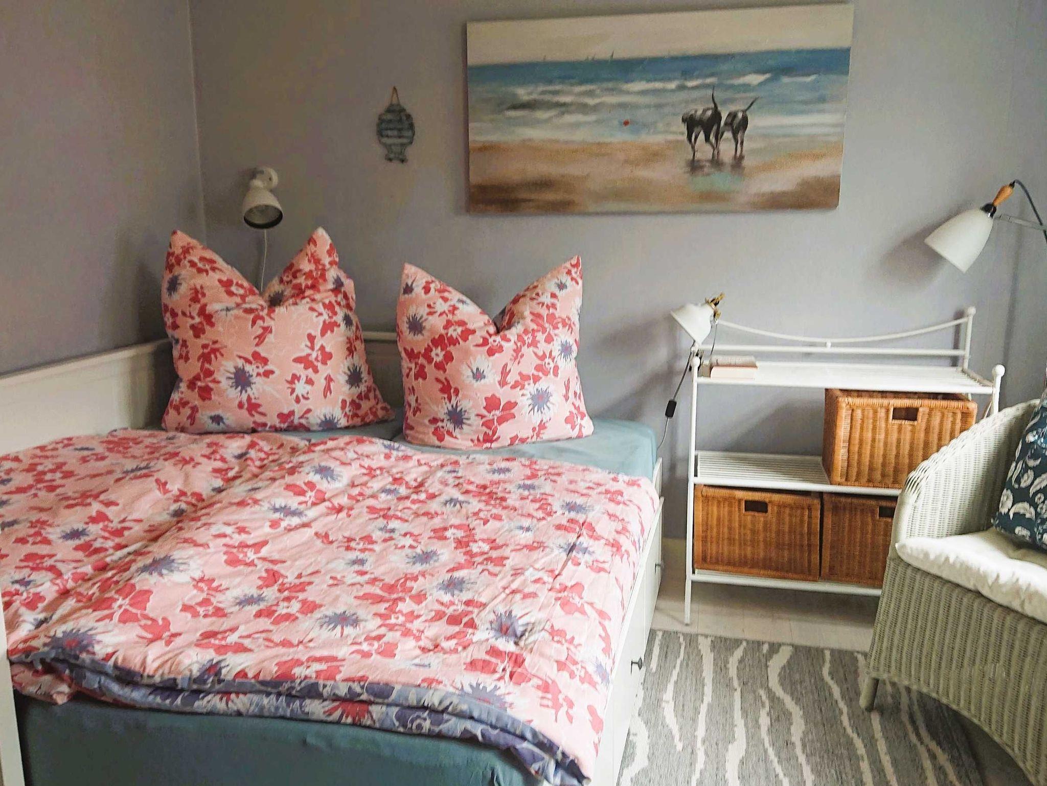 Es gibt zwei separate Schlafzimmer. Eins mit kleinem Wohnbereich, das ebenfalls mit zwei Korbsessel, Tisch und kleinem TV ausgestattet ist. Das Bett ist zugleich Sofa und Doppelbett auf selber Höhe, mit hochwertigen 24cm Matratzen. Dieses kann bei Bedarf aufgebettet werden.