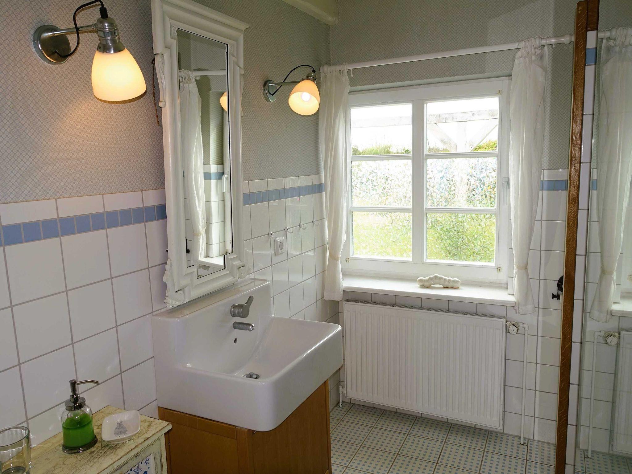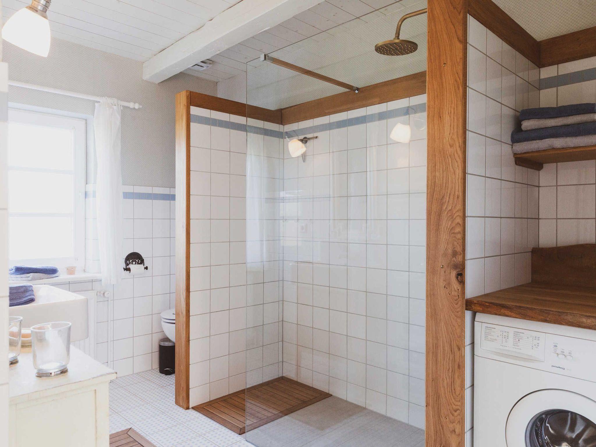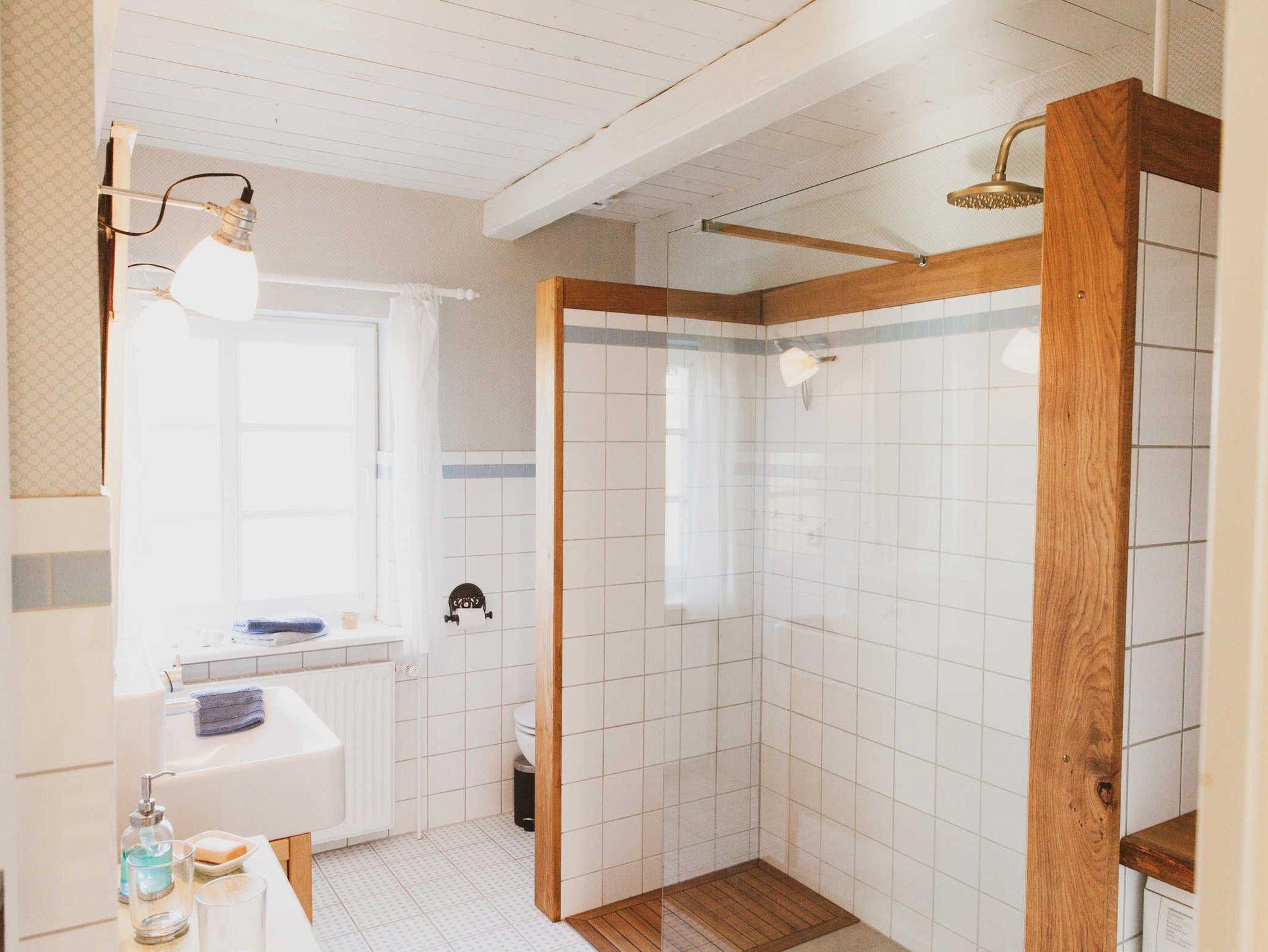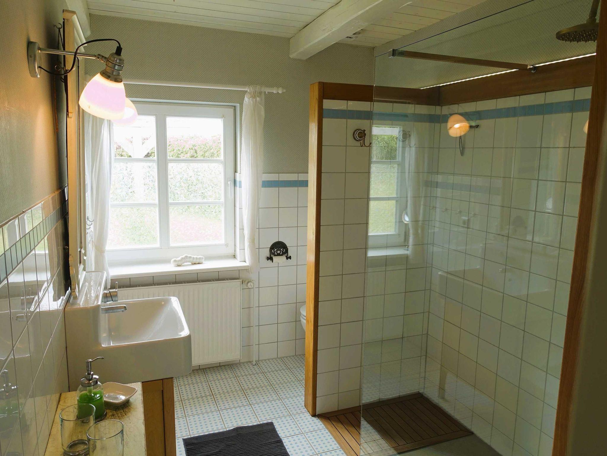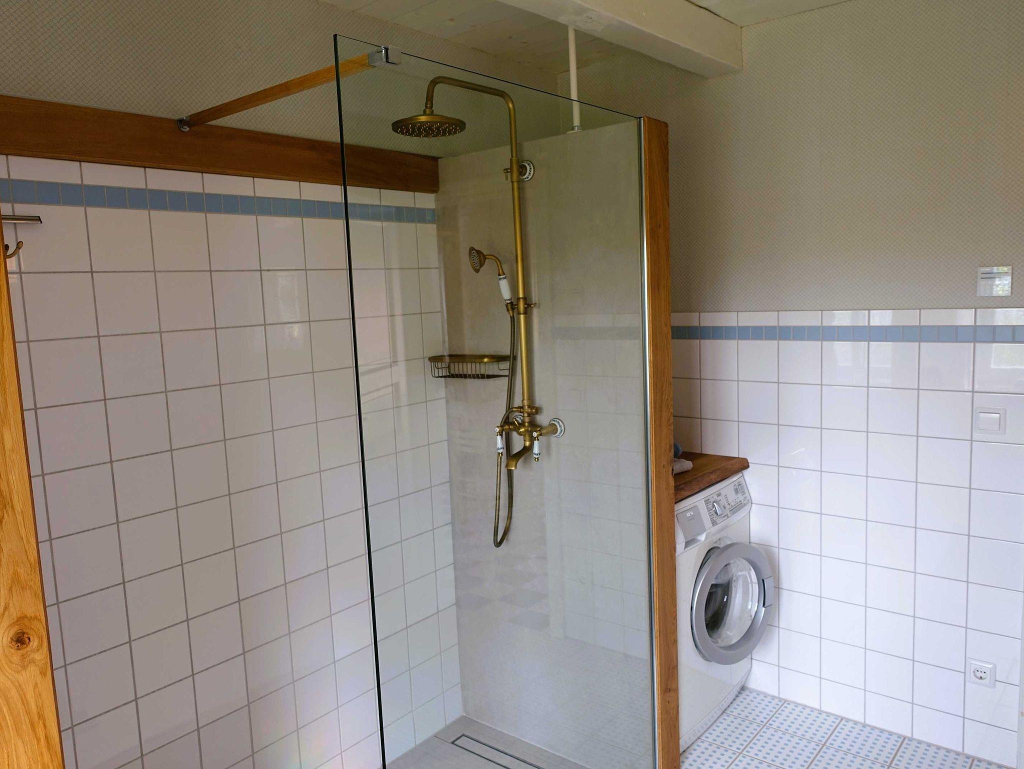 Das geräumige Bad mit walk in Dusche und Regen-Duscharmatur ist der ideale Start in den Urlaubstag.