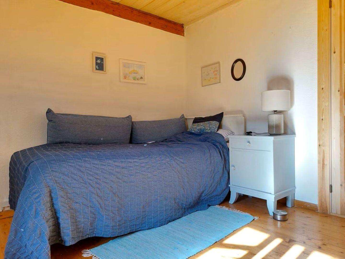 Ein gemütliches Schlafzimmer mit Doppelbett, ein weiteres mit Einzelbett sowie ein zusätzliches Einzelbett im Wohnzimmer schaffen viel Flexibilität.