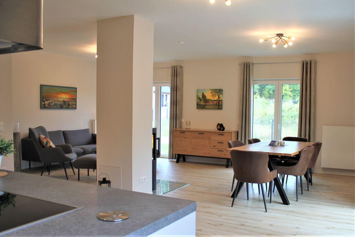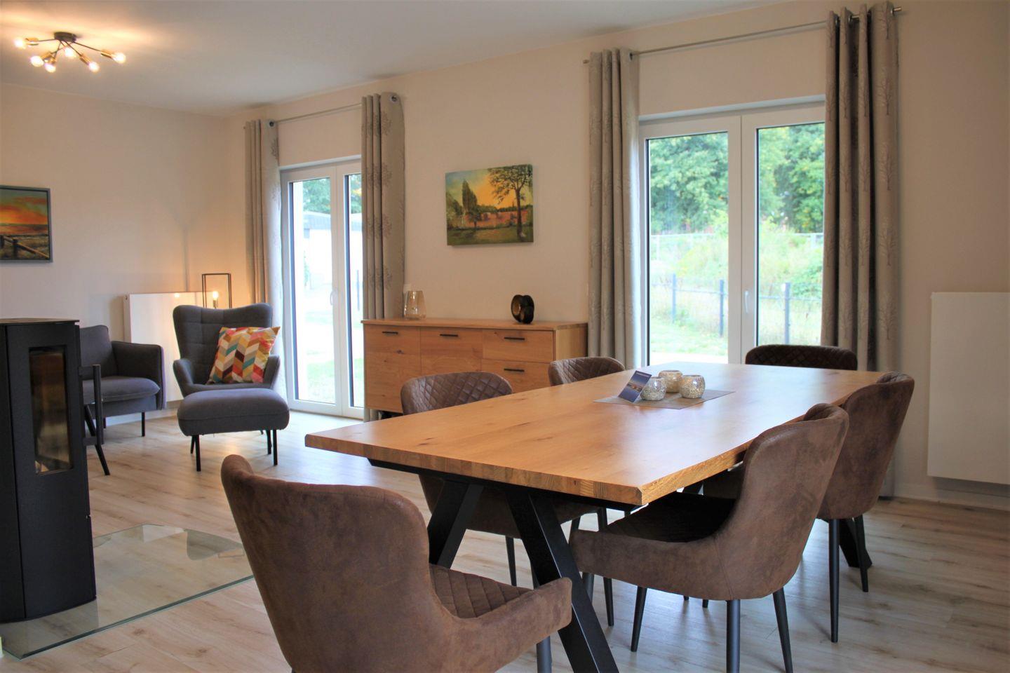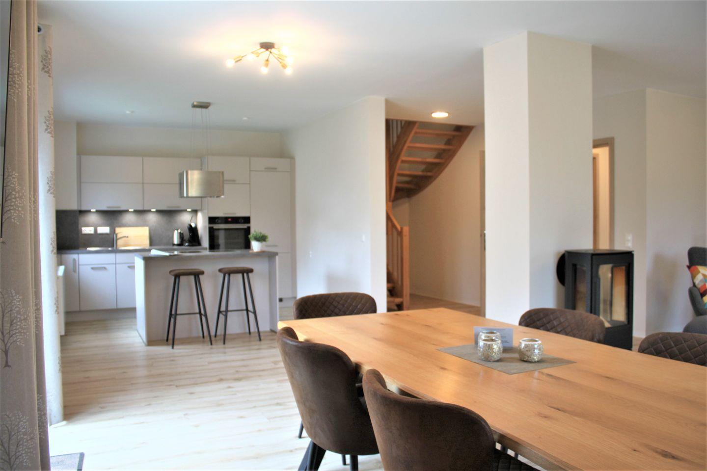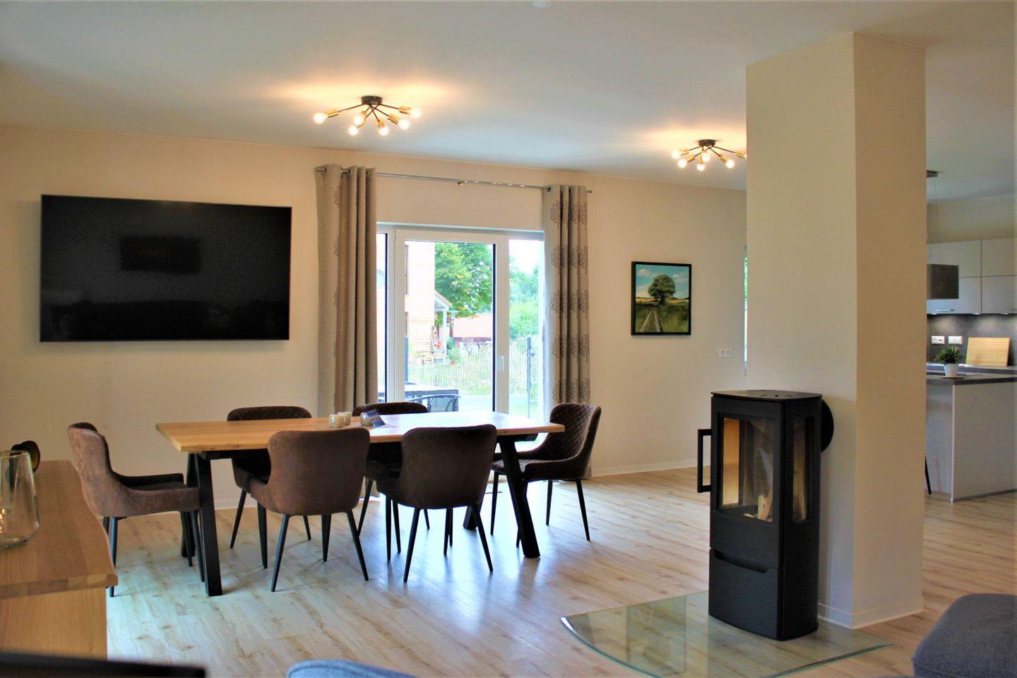 Das Wohn-und Esszimmer mit kombinierter offener Küche bietet mit einem großem Tisch (8 Stühle) und Kochinsel beste Möglichkeiten für gesellige Stunden. Der Kamin sorgt an kühleren Tagen für eine angenehme Wohlfühlatmosphäre.