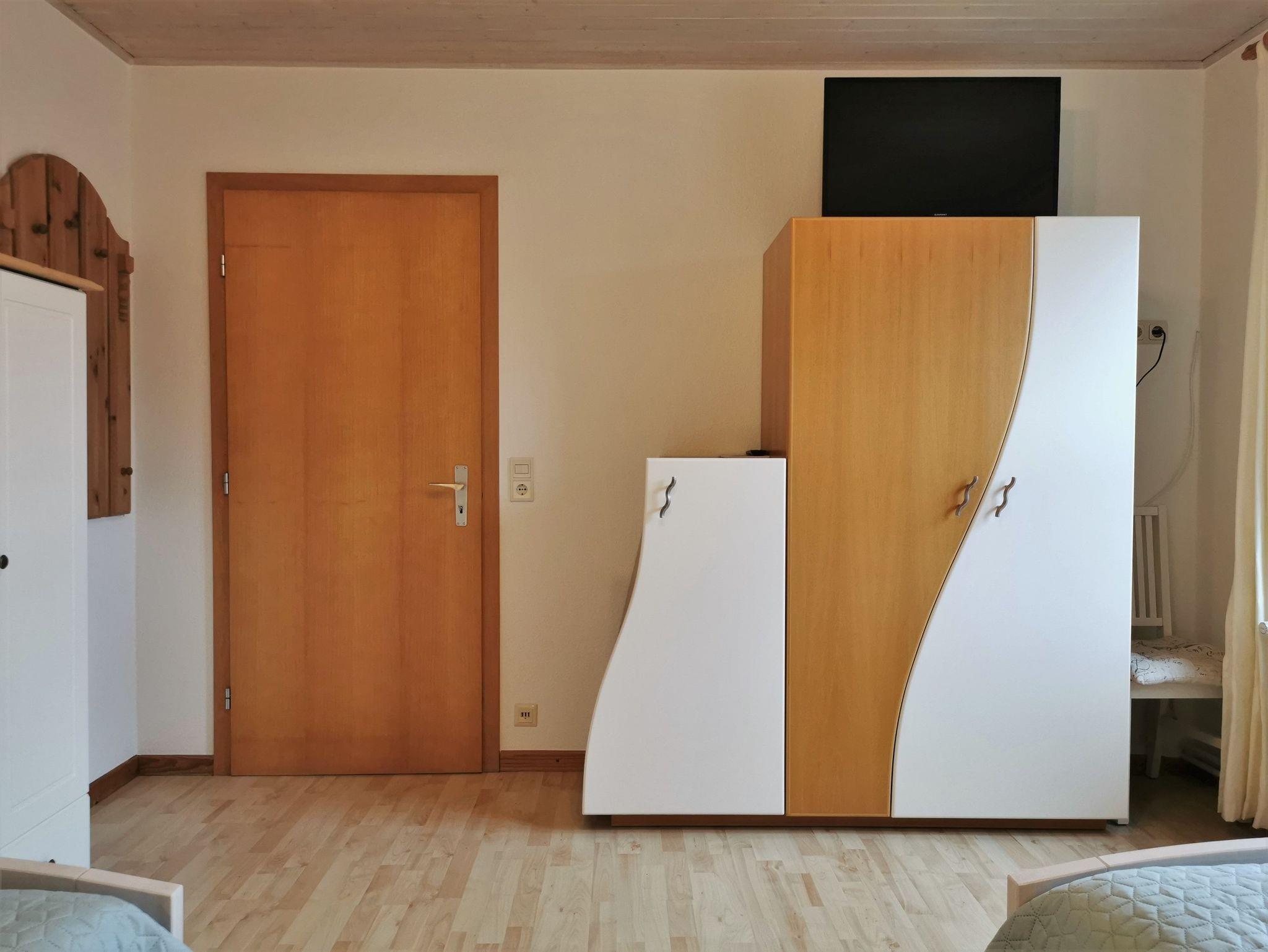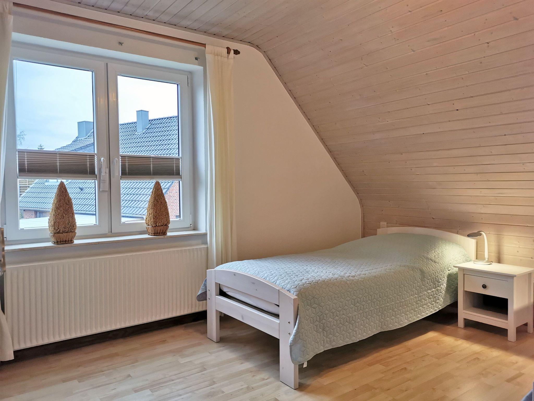 Die größere Ferienwohnung für 4 Personen (plus Aufbettungsmöglichkeit) liegt im Obergeschoss eines anderen Einfamilienhauses (ca. 30m entfernt) und ist etwa 80 qm groß. Sie verfügt über einen separaten Eingang, ein großes helles Wohnzimmer mit Essbereich und kleinem Balkon, einer voll ausgestatteten Küche sowie zwei Schlafzimmer mit zwei Einzelbetten. Das Schlafsofa im Wohnzimmer kann für eine weitere Person aufgebettet werden. Ein großes Duschbad mit Waschbecken und das WC sind getrennt voneinander. Es steht den Gästen kein Außenbereich zur Verfügung.