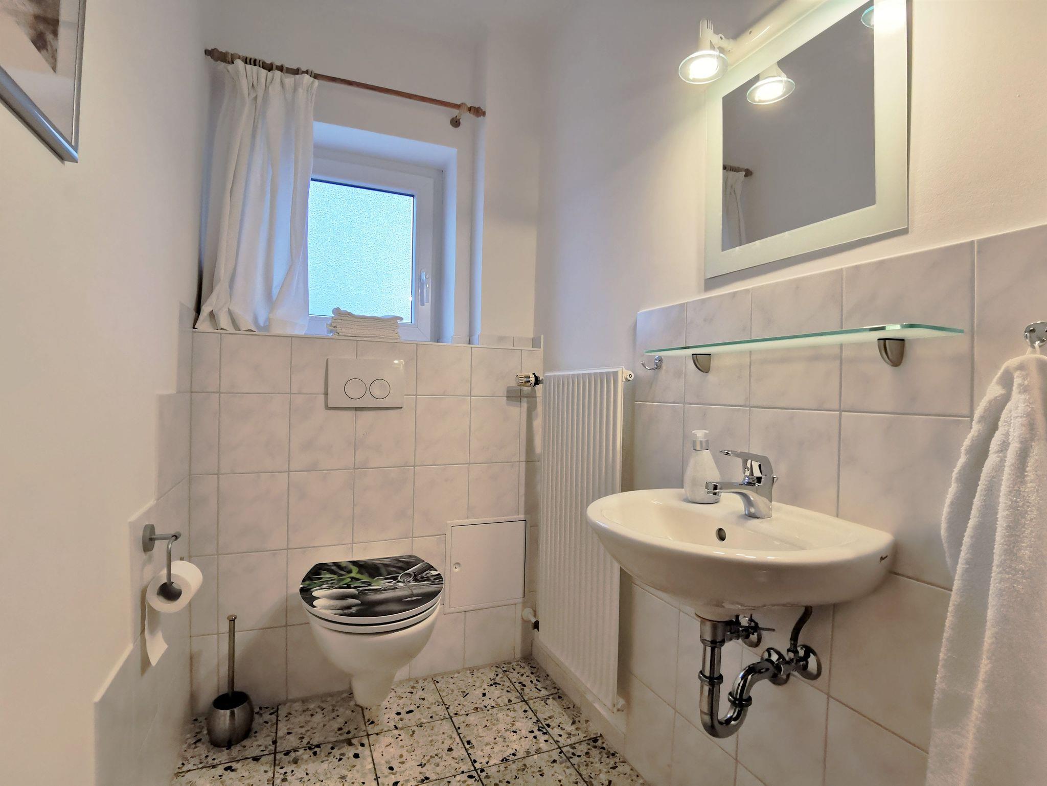 Das geräumige Badezimmer mit Dusche und Waschbecken ausgestattet, die Toilette ist getrennt davon in einem kleinen Bad mit Fenster.