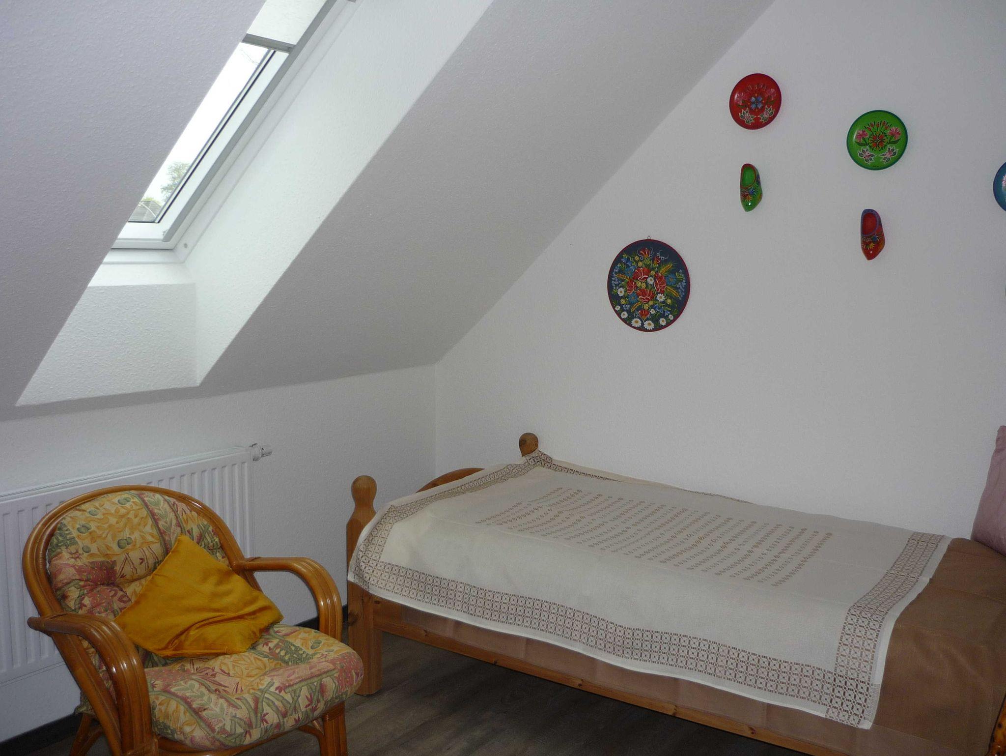 Gemütliche Ferienwohnung im Obergeschoss eines Einfamilienhauses. Die Wohnung besteht aus Wohnzimmer mit Schlafcouch, 2 Schlafzimmern (1 x Doppelbett, 1 x Einzelbett, Zustellbett möglich), Du/WC und Flur.