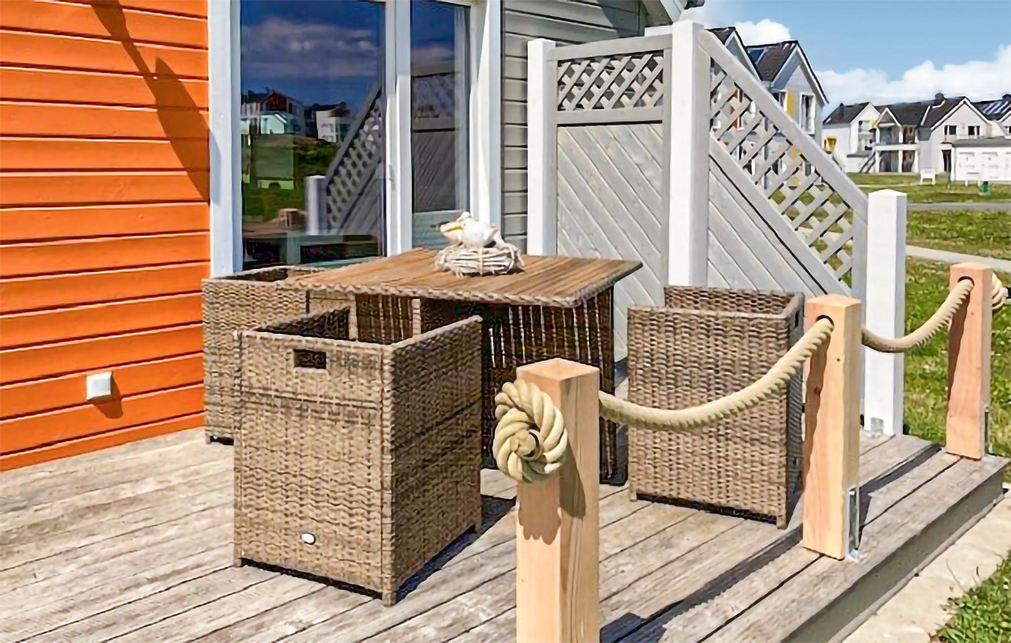 Sie betreten Ihr Ferienhaus über Ihre kleine, überdachte Terrasse. Die große Sonnenterrasse befindet sich auf der anderen Seite des Hauses. Hier können Sie am Morgen den Tag mit einem Frühstück starten oder bei einem Glas Wein im Sonnenuntergang ausklingen lassen.