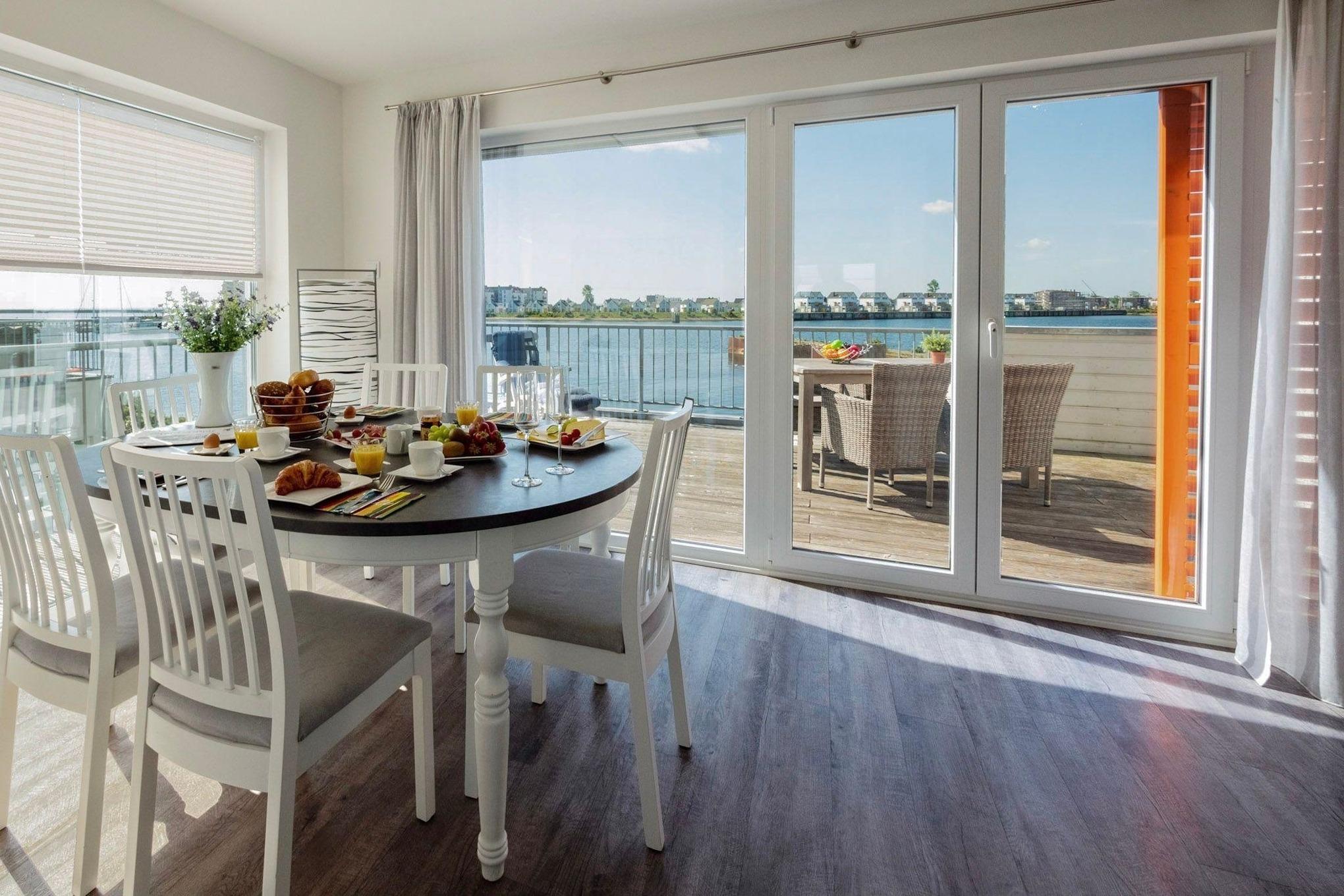 Im Fokus steht aber der perfekt umgesetzte lichtdurchflutete Wohn- und Essbereich mit Holz befeuertem Kaminofen, bodentiefen Panoramafenstern, welcher Loftartig gestaltet ist, sodass alle Räume fließend ineinander übergehen und sich der Wohnbereich mit der Natur verbindet. Die Integration der offenen Küche mit hervorragender Ausstattung und funktionalem Design, steht dem gemütlichen Beisammensein auch beim Zubereiten von allerlei Köstlichkeiten nichts im Wege. Die Wasserkulisse vor dem Essbereich mit 180 Grad Panoramablick auf den gesamten Hafen und die Ostsee ist hierbei zum Greifen nah – das ist Ostseeflair. Den zweiten Nordbalkon (ca. 8m²) betritt man über den Wohnbereich, hier können es sich unsere Gäste auf einer zusätzlichen Bestuhlung gemütlich machen und bei einem Sundowner mit Abendsonne den Tag ausklingen lassen.