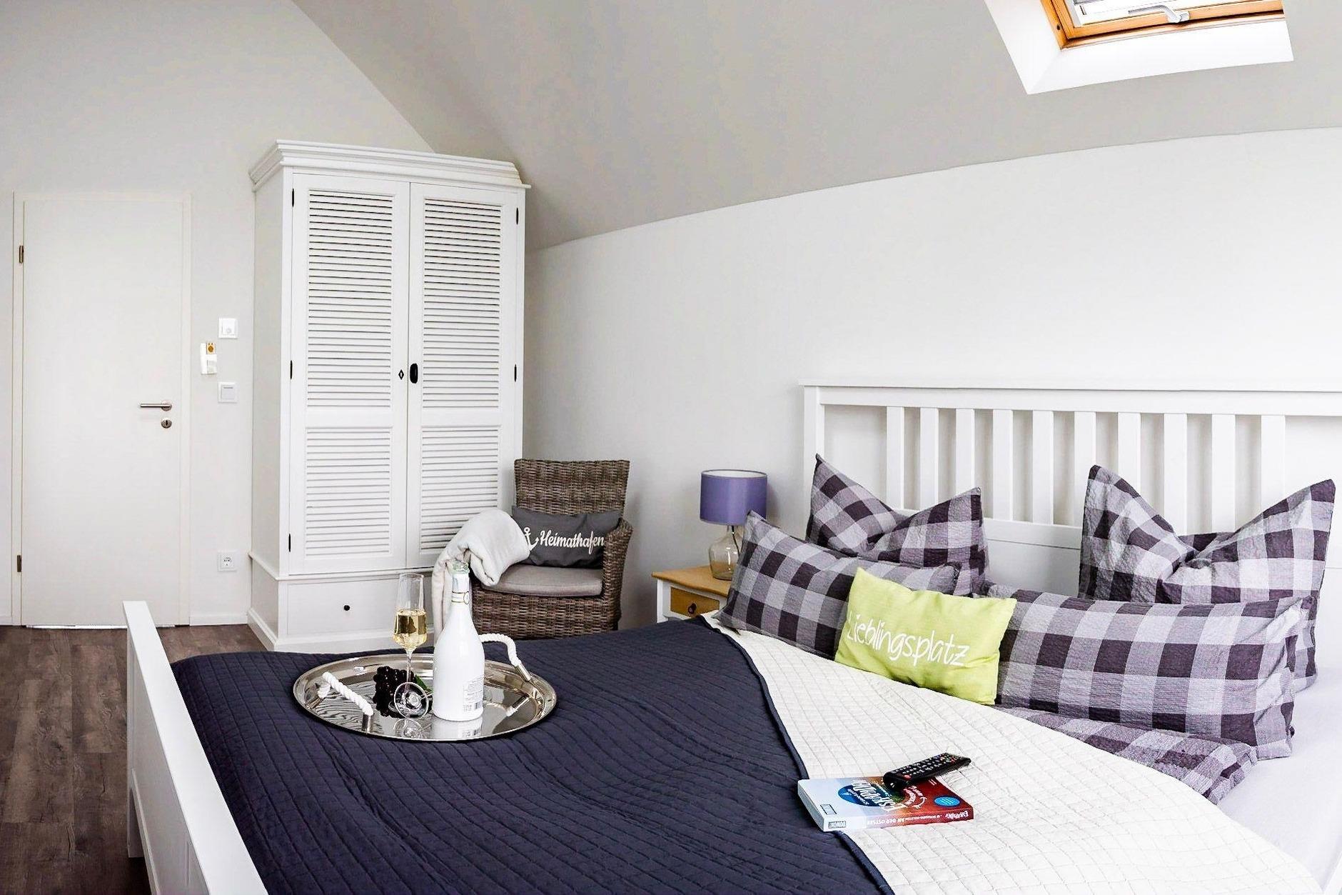 Bei dieser Wohnung sind spektakuläre Sonnenlichtspiele durch die zwei Balkone in Süd- und Nordausrichtung zu erwarten. Der Einrichtungsstil entspricht der exklusiven Lage der Ferienwohnung: Landhausstil gepaart mit klaren Farben und Formen versprechen Ruhe und Rückzug, während einzelne Farbakzente für erfrischende Leichtigkeit sorgen.