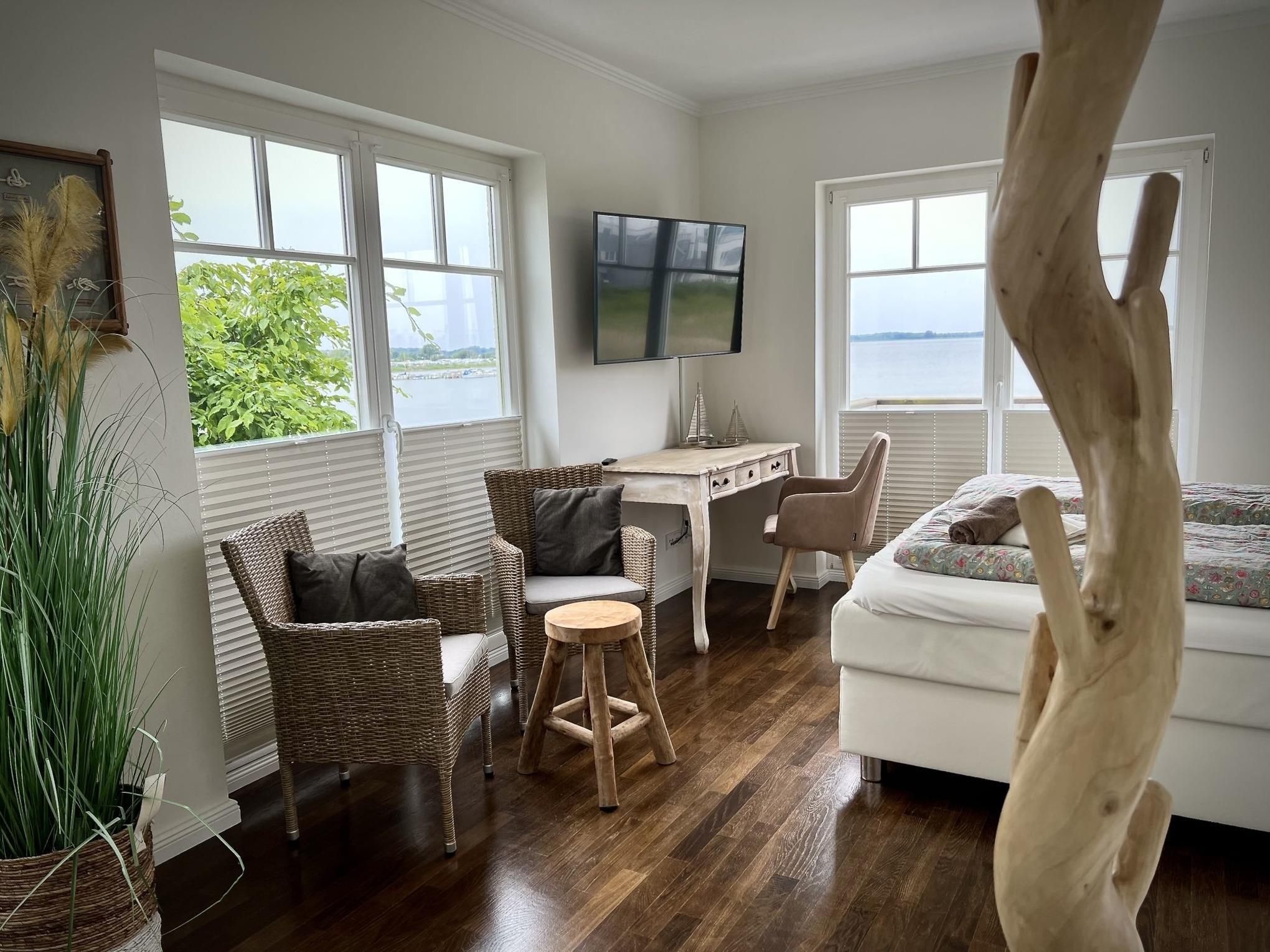 Über eine imposante Wendeltreppe gelangt man in das Obergeschoss. Zwei großzügige Schlafzimmer mit hochwertigen Boxspringbetten für vier Personen, garantieren einen wunderbar entspannten Schlaf und schöne Träume. Doch möchte man eigentlich bei diesem Ausblick schlafen...? Das Beruhigende ist: man wacht mit demselben traumhaften Ausblick wieder auf. Jedes Schlafzimmer punktet insbesondere mit dem direkten Zugang zum Balkon und dem traumhaften Ausblick auf die Schlei, sowie einen kleinen Schreibtisch für diejenigen, die im Urlaub ein wenig Arbeiten müssen. High Speed WLAN über Glasfaser und ein 43 Zoll Smart TV in jedem Schlafzimmer, ist in diesem Ferienobjekt selbstverständlich.
