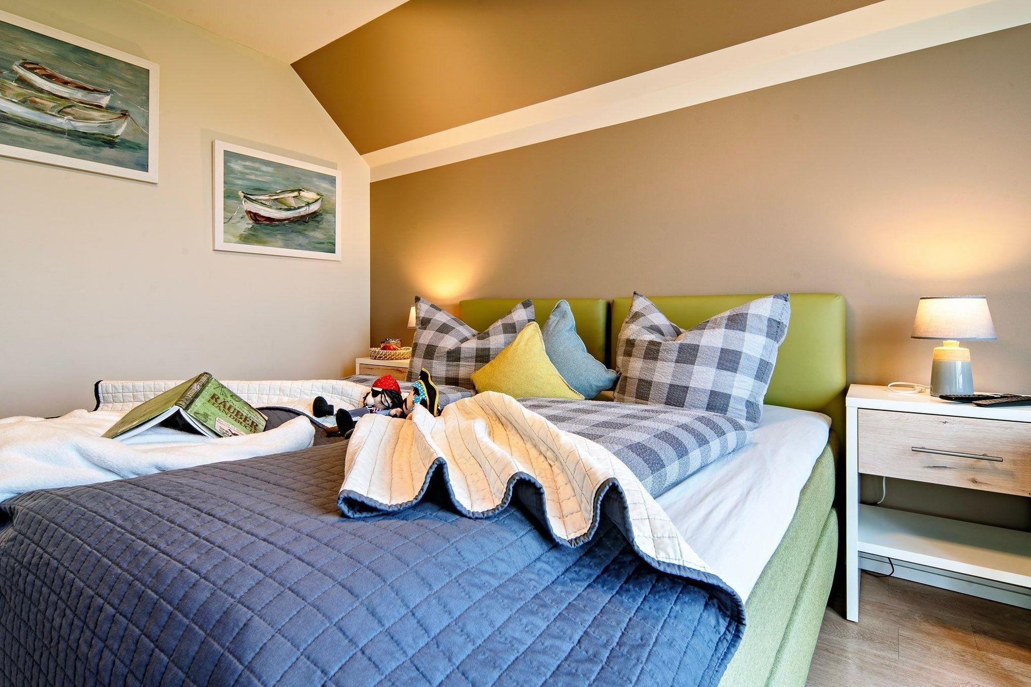 In der RÄUBERHÖHLE by Seeblick Ferien ORO finden Sie alles für eine erholsame Nachtruhe. Das Masterbedroom verfügt über ein gemütliches Boxspringdoppelbett, das Ihnen optimalen Komfort bietet. Genießen Sie eine angenehme Nachtruhe und entspannen Sie sich beim Fernsehen, direkt vom Bett aus. Das zweite Schlafzimmer ist mit zwei Einzelboxspringbetten ausgestattet, die bei ausreichender Harmonie zusammengeschoben werden können. Hier haben Sie die Flexibilität, je nach Ihren Bedürfnissen die Schlafgelegenheiten anzupassen. Selbstverständlich ich dieses ebenfalls mit einem Smart TV ausgestattet.