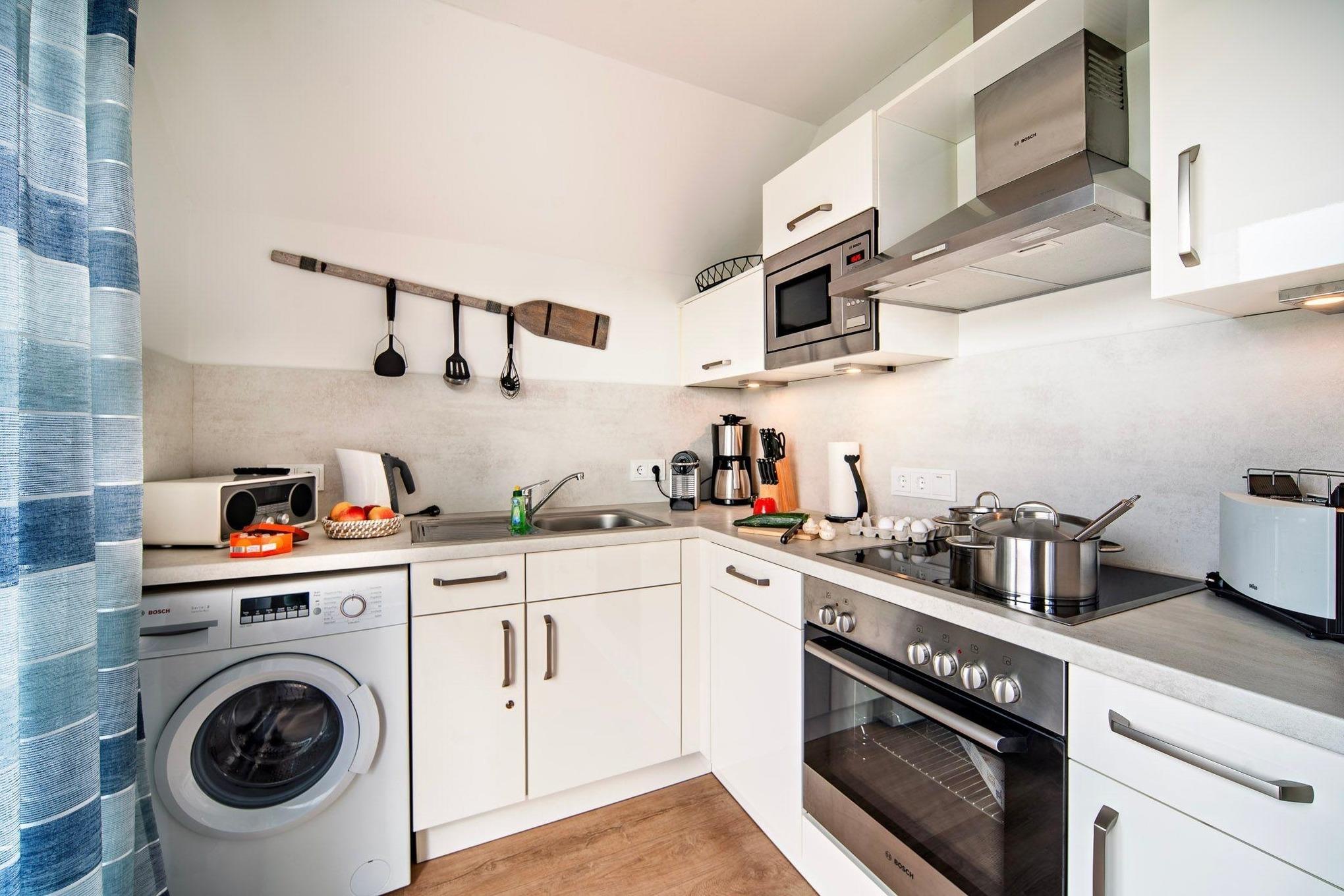 In der Ferienwohnung finden Sie eine voll ausgestattete Wohnküche, eine Waschmaschine, eine Spülmaschine, ein Bügeleisen und viele weitere Annehmlichkeiten vor. Verdunkelbare Plissees und Fliegengitter sorgen für eine angenehme Atmosphäre. Gesellschaftsspiele stehen für gemeinsame Unterhaltung bereit.