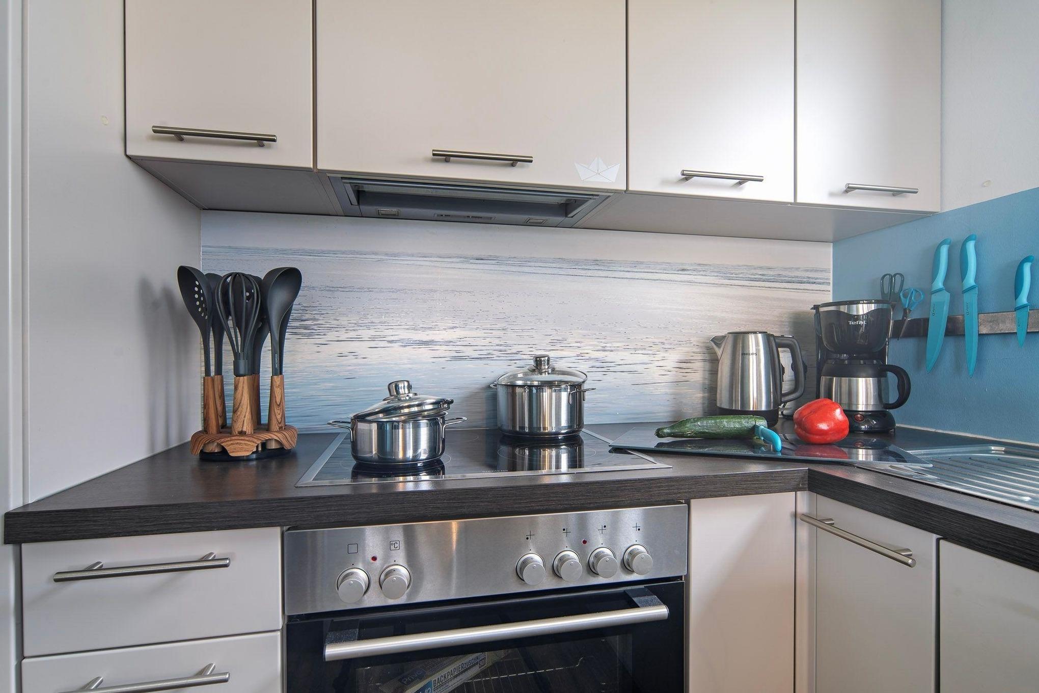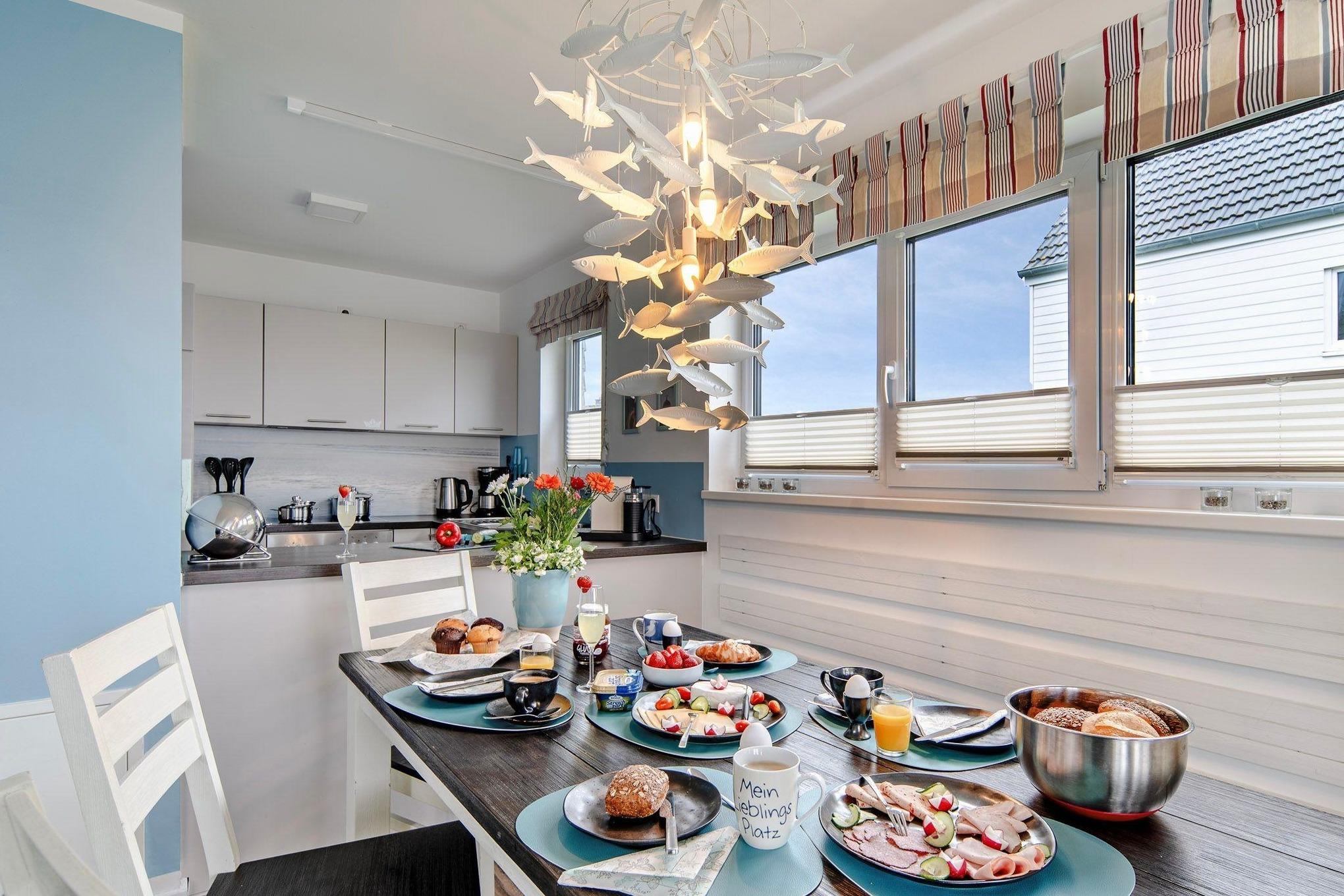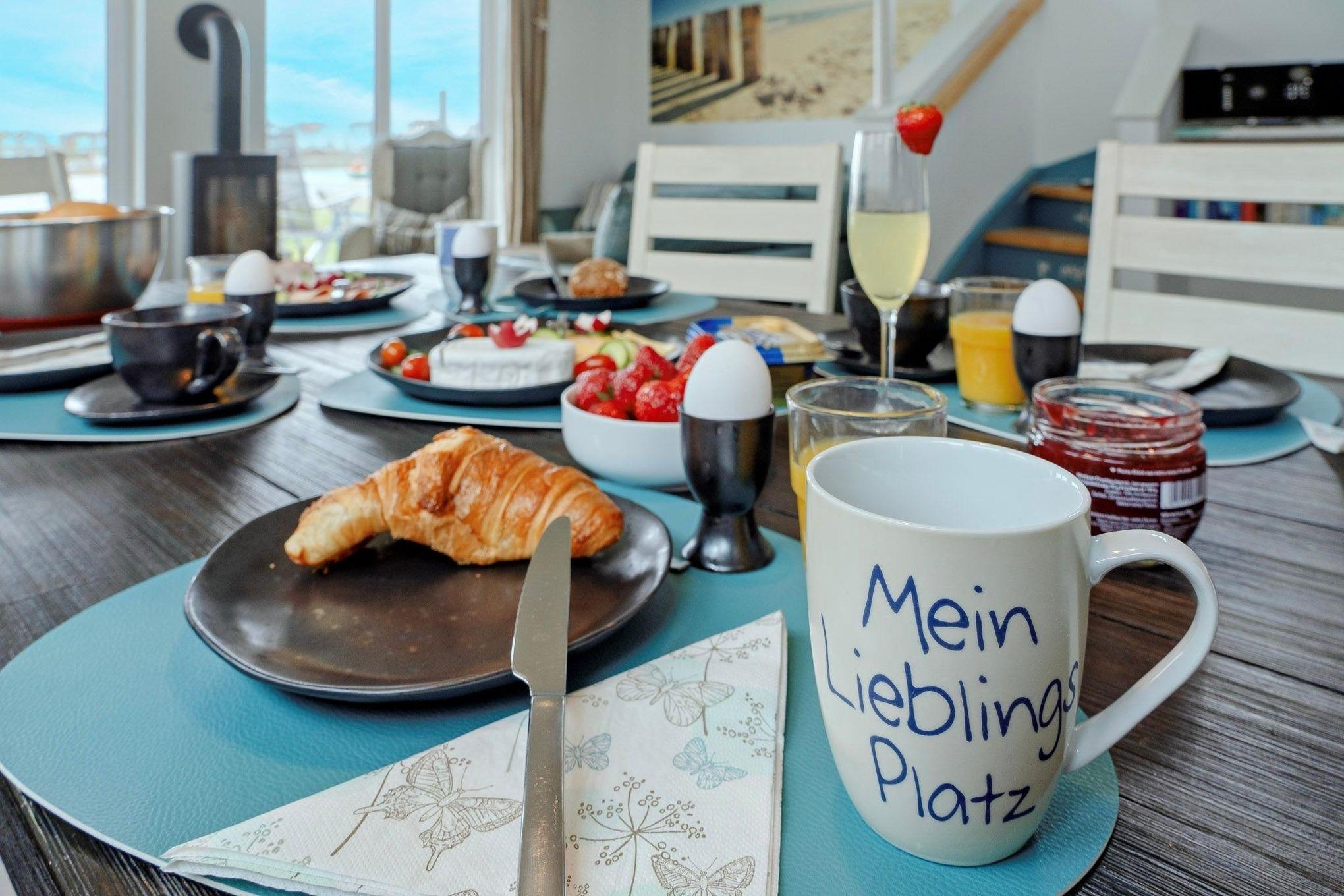 Das Ferienhaus Lieblingsplatz besticht durch eine liebevolle Einrichtung und eine familienfreundliche Ausstattung, die jeden begeistern wird. Der offene Wohn- und Essbereich im Erdgeschoss begeistert mit seiner Helligkeit und den bodentiefen Fenstern, die einen atemberaubenden Blick auf das Hafenbecken ermöglichen. Genießen Sie gemütliche Abende vor dem knisternden Kamin auf dem Ledersofa und entspannen Sie sich in dieser einladenden Atmosphäre. Gesellschaftsspiele und Bücher stehen für gemütliche Familienabende bereit.