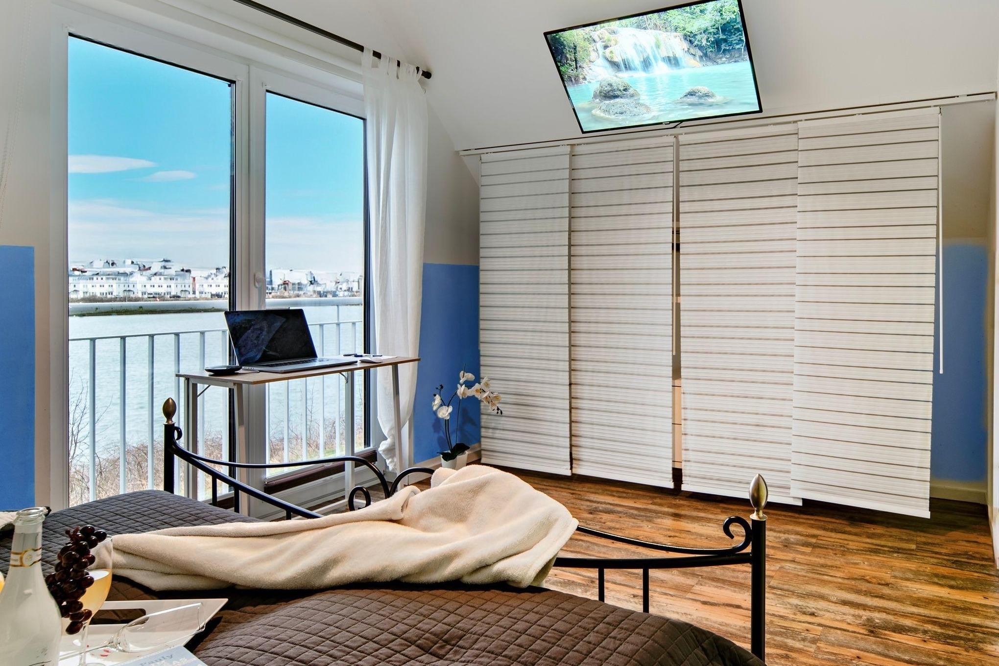 Im Obergeschoss des Ferienhauses finden Sie zwei Schlafzimmer vor, die zum Träumen einladen. Der Masterbedroom verwöhnt Sie mit einem komfortablen Doppelbett und einem atemberaubenden, direkten Wasserblick. Eine Deckenlampe mit Bluetoothfunktion versorgt unsere Gäste mit Musik. Das zweite Schlafzimmer verfügt über zwei Einzelbetten, die bei Bedarf auch zu einem Doppelbett umfunktioniert werden können, sowie ein hochwertiges Schrankbett. Ein Rausfallschutz für die kleinen Ostseeurlauber steht zur Verfügung.