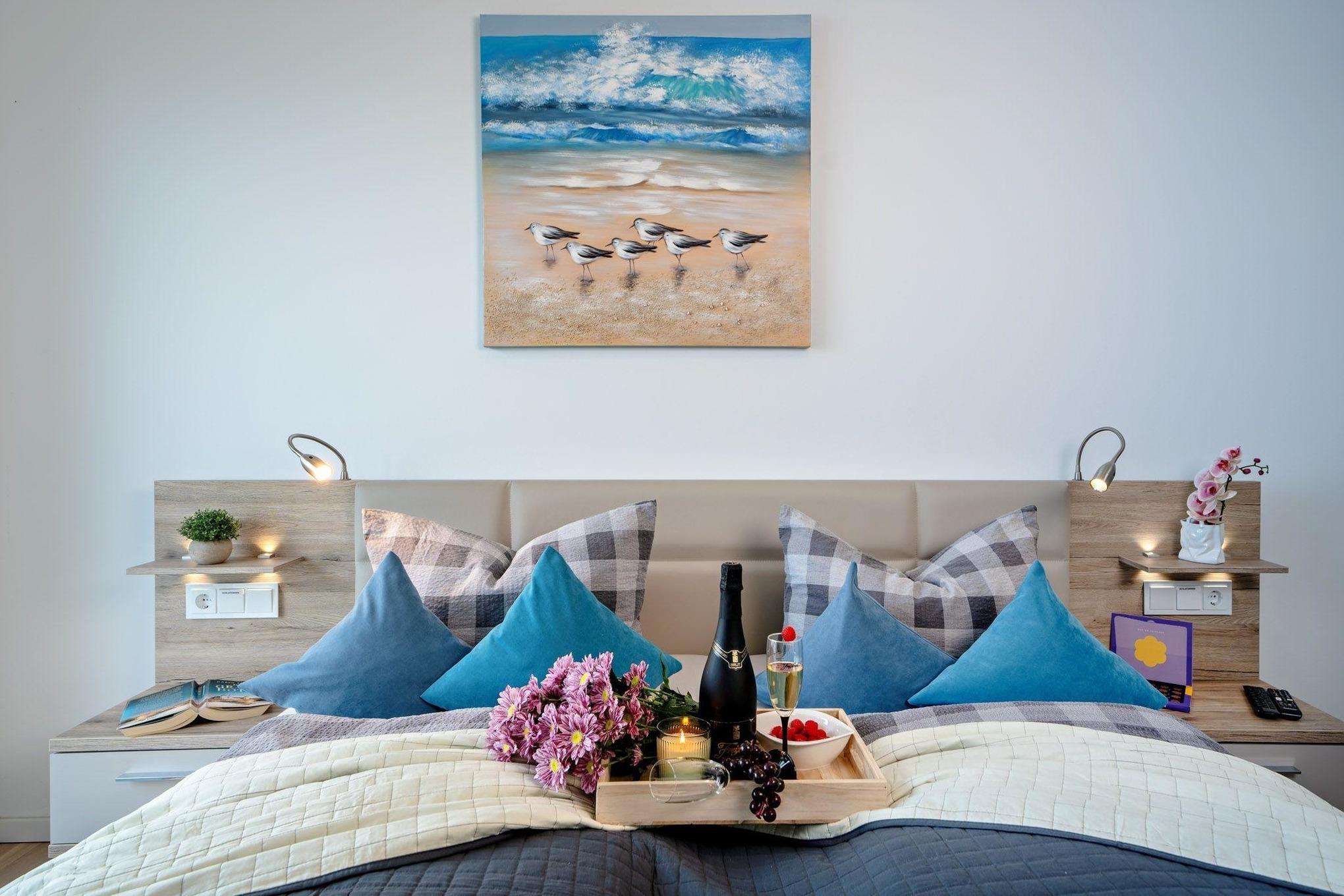 Beide Schlafzimmer bieten dank bodentiefer Fenster einen grandiosen Meerblick und haben direkten Zugang zu Balkonen. Das eine Schlafzimmer führt auf den Hauptbalkon, während das größere Schlafzimmer einen eigenen separaten Balkon besitzt. Hochwertige Doppelbetten mit individuell verstellbaren Lattenrosten garantieren erholsamen Schlafkomfort.