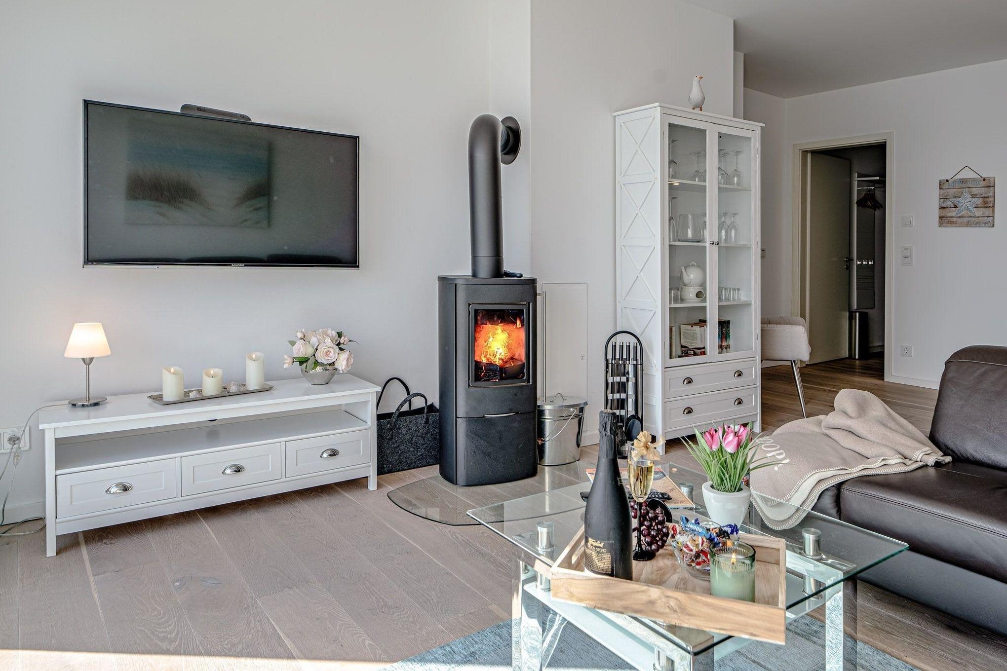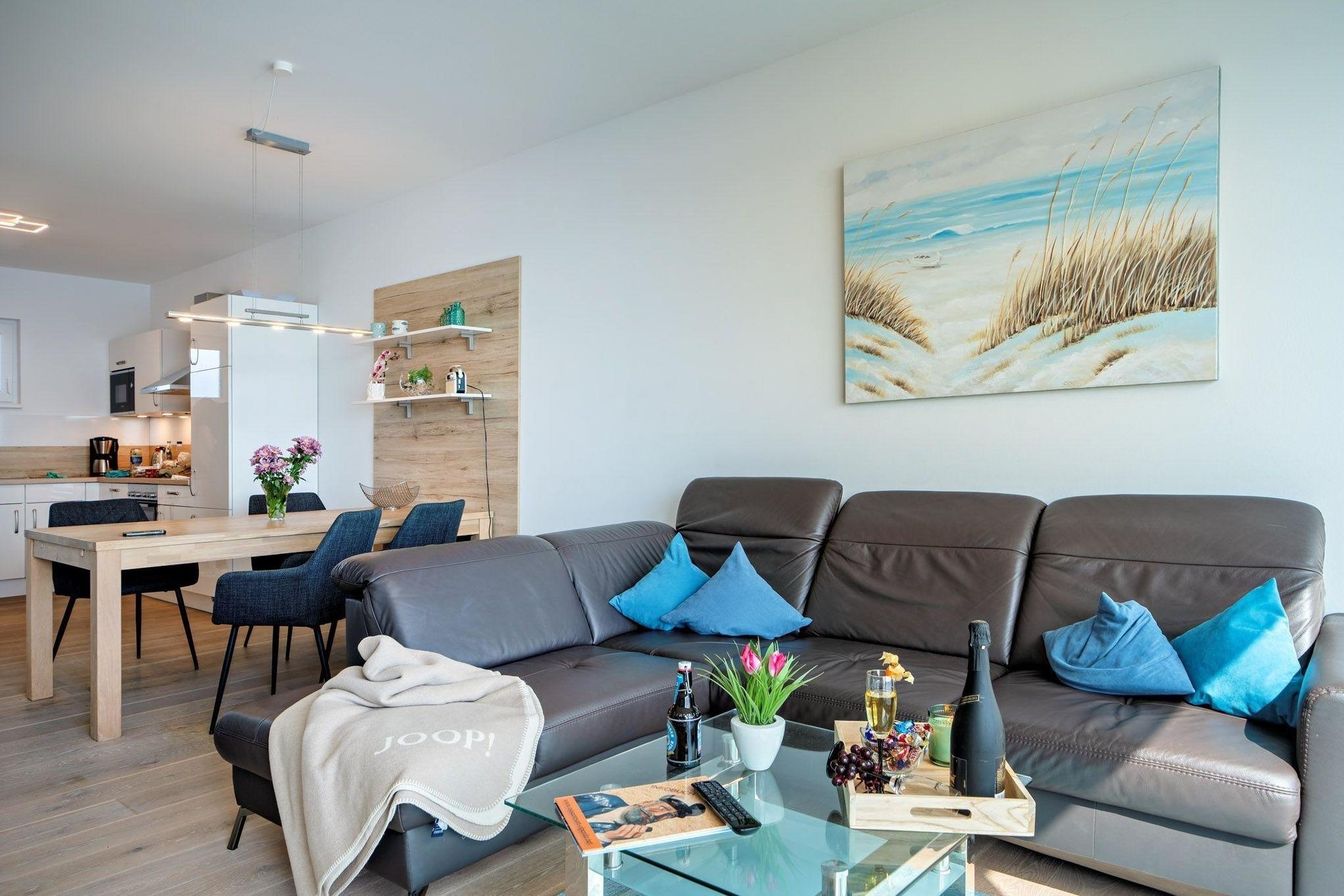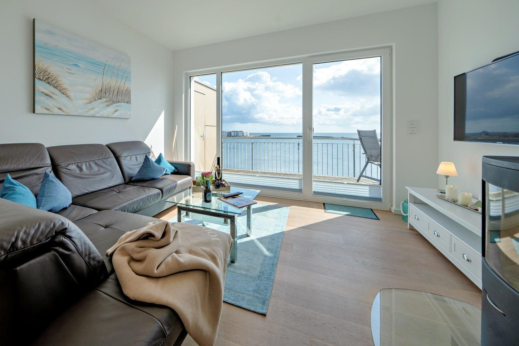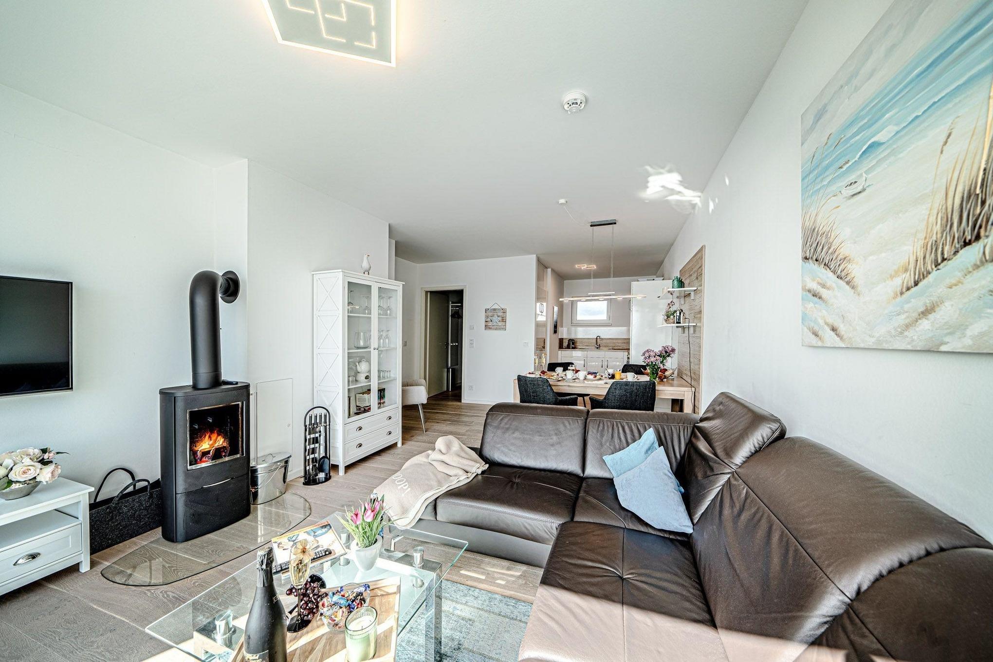 Die elegante Wohnung ist im modernen maritimen Landhausstil gehalten und verspricht zu jeder Jahreszeit Gemütlichkeit und Wohlfühlatmosphäre. Der offene Wohn-Essbereich ist lichtdurchflutet durch große bodentiefe Fenster, die das helle Echtholzparkett perfekt zur Geltung bringen. An kühlen Tagen sorgt die Fußbodenheizung in allen Räumen für wohlige Wärme. Bei stürmischem Wetter können Sie es sich auf der allergikerfreundlichen, aus Textilleder bestehenden, gemütlichen Wohnlandschaft bequem machen und dem Wellentreiben an der Hafeneinfahrt zuschauen, während im Kamin ein gemütliches Feuer knistert.
