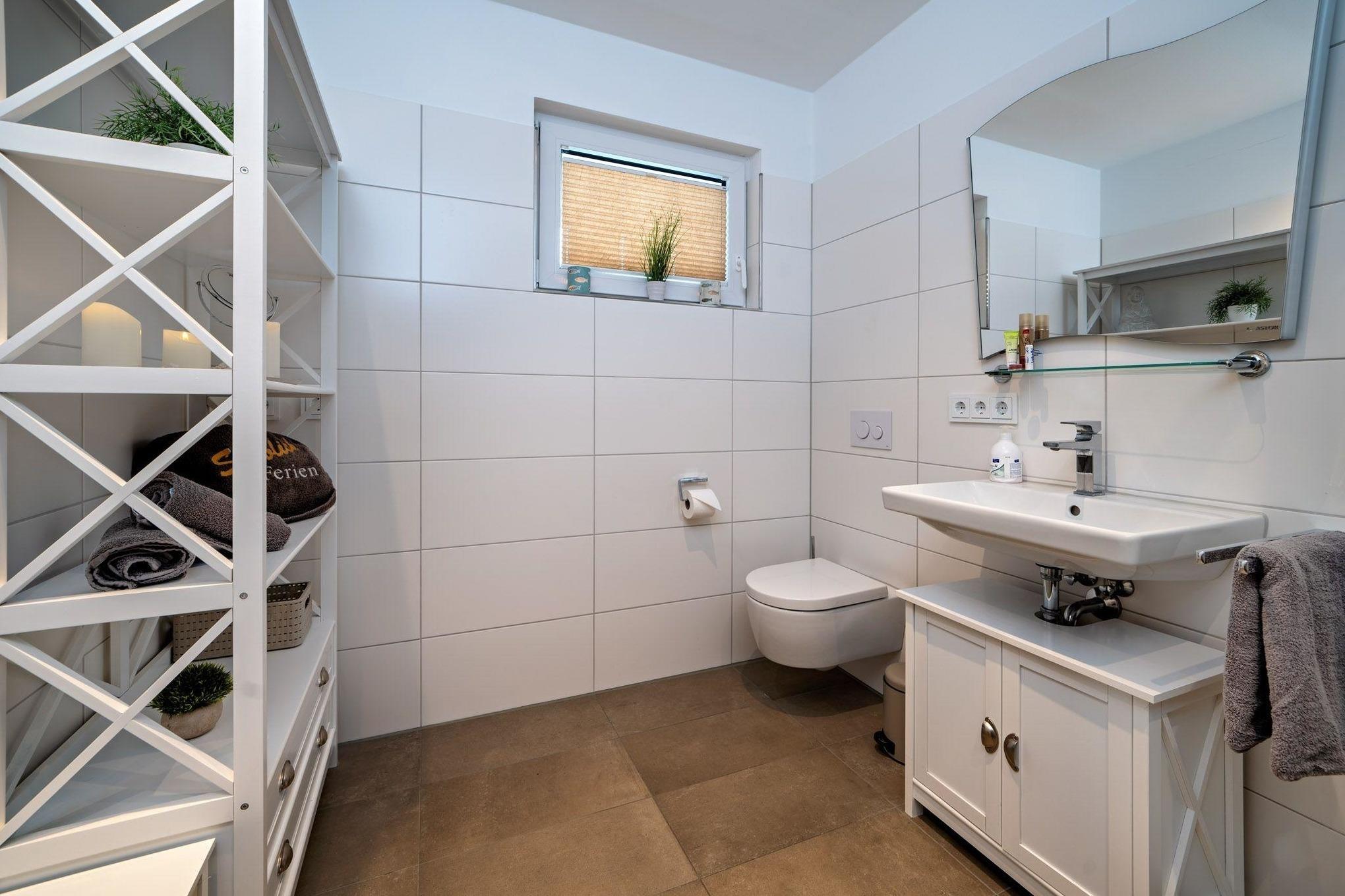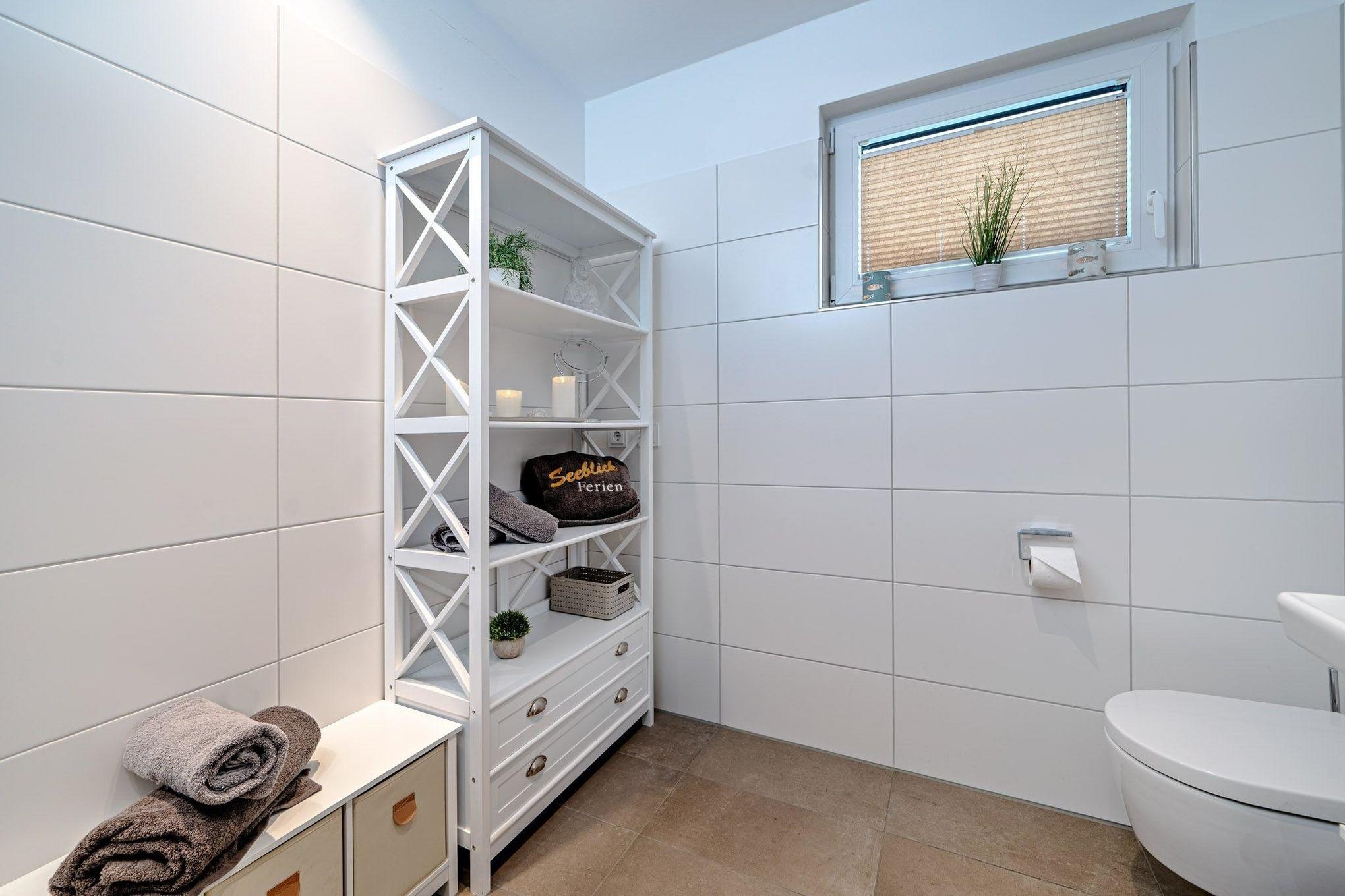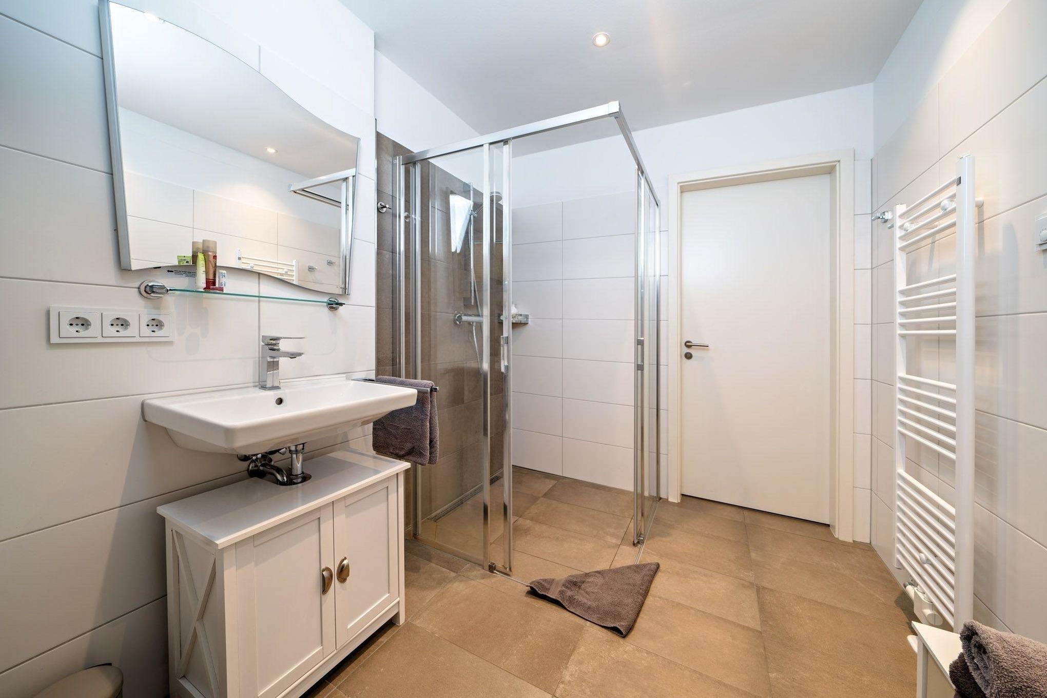 Das großzügige Badezimmer mit einer bodengleichen, großen Dusche ist ein weiteres Highlight der Kleinen Auszeit by Seeblick Ferien ORO und macht das Duschen zum Vergnügen. Für beste Unterhaltung sorgen smarte Fernseher mit Magenta TV im Wohnzimmer 49 Zoll und in beiden Schlafzimmern 43 Zoll sowie eine Spielesammlung.