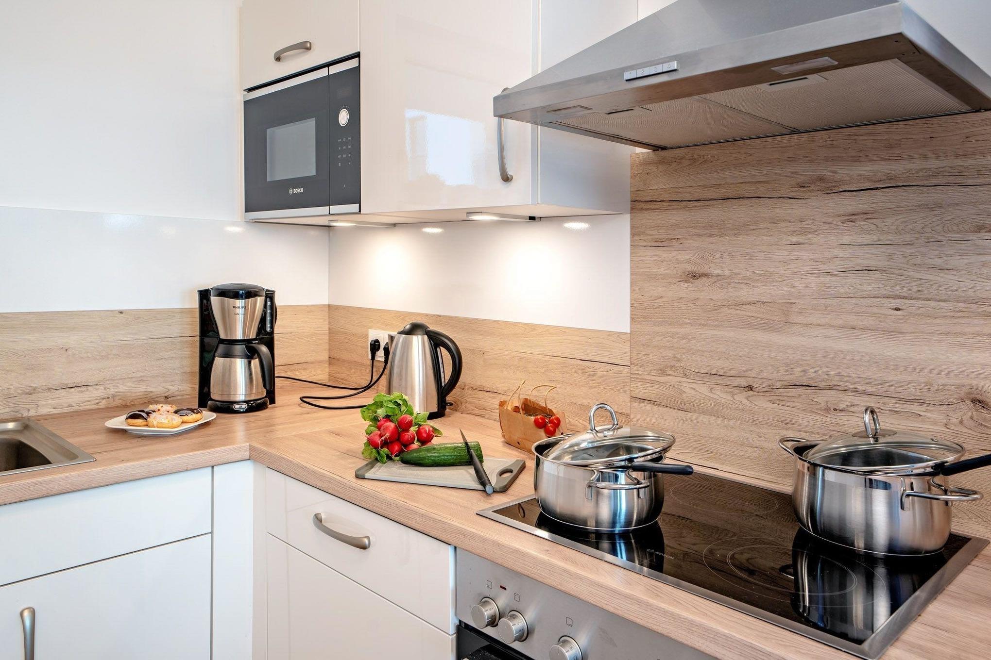 Die moderne, voll ausgestattete Küche lässt keine Wünsche offen und der angrenzende Essbereich bietet viel Platz für kulinarische Erlebnisse. Der große Balkon, der direkt ans Wasser grenzt, lädt ebenfalls zum Essen und Verweilen ein, natürlich sind auch Liegestühle vorhanden.