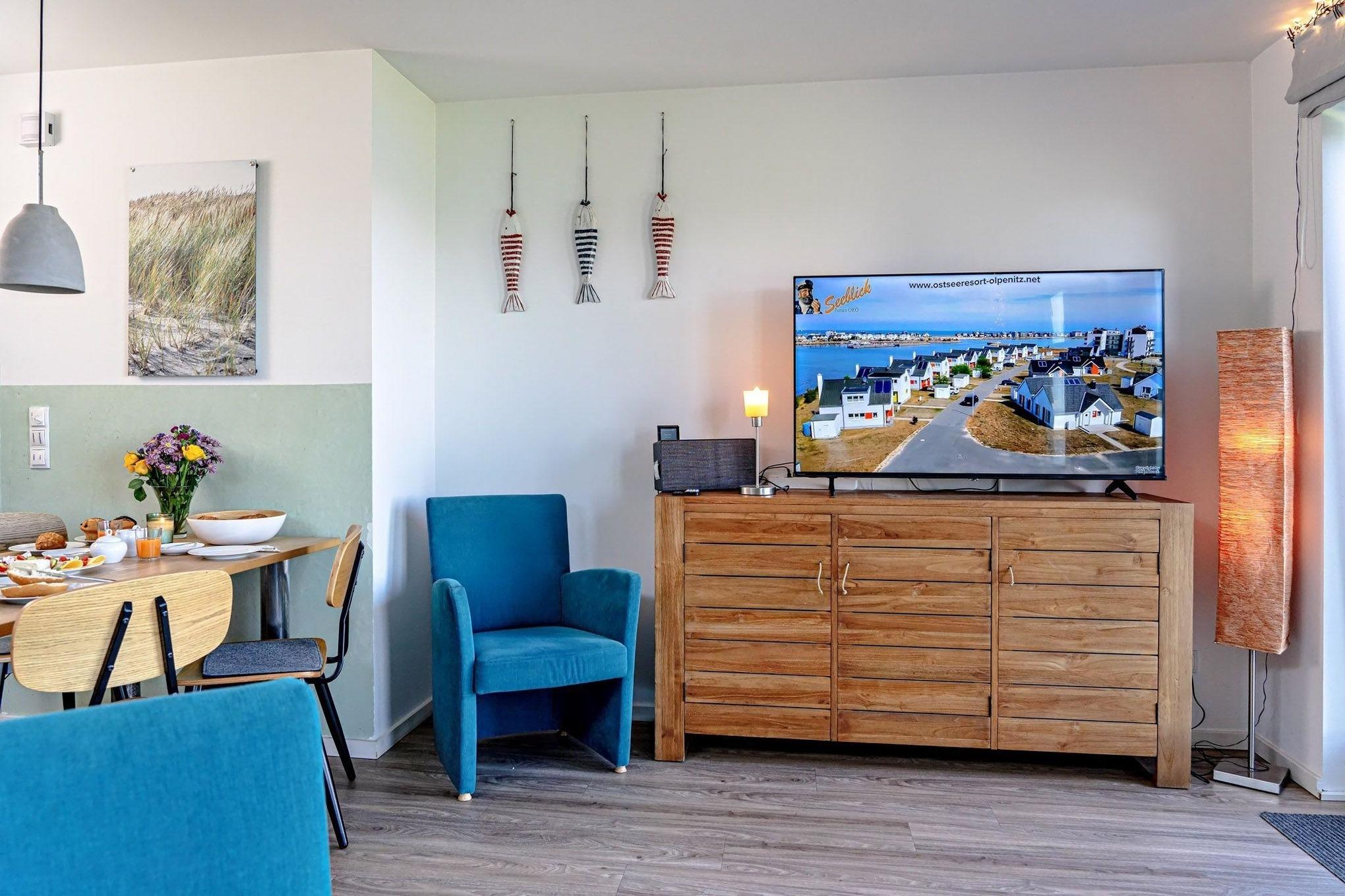 Der offene Wohnbereich im Erdgeschoss ist der perfekte Ort, um den Blick auf das glitzernde Wasser zu genießen. Ob beim gemeinsamen Essen oder bei einem gemütlichen Kaminabend im Wohnzimmer – hier erleben Sie Ostsee-Feeling pur.