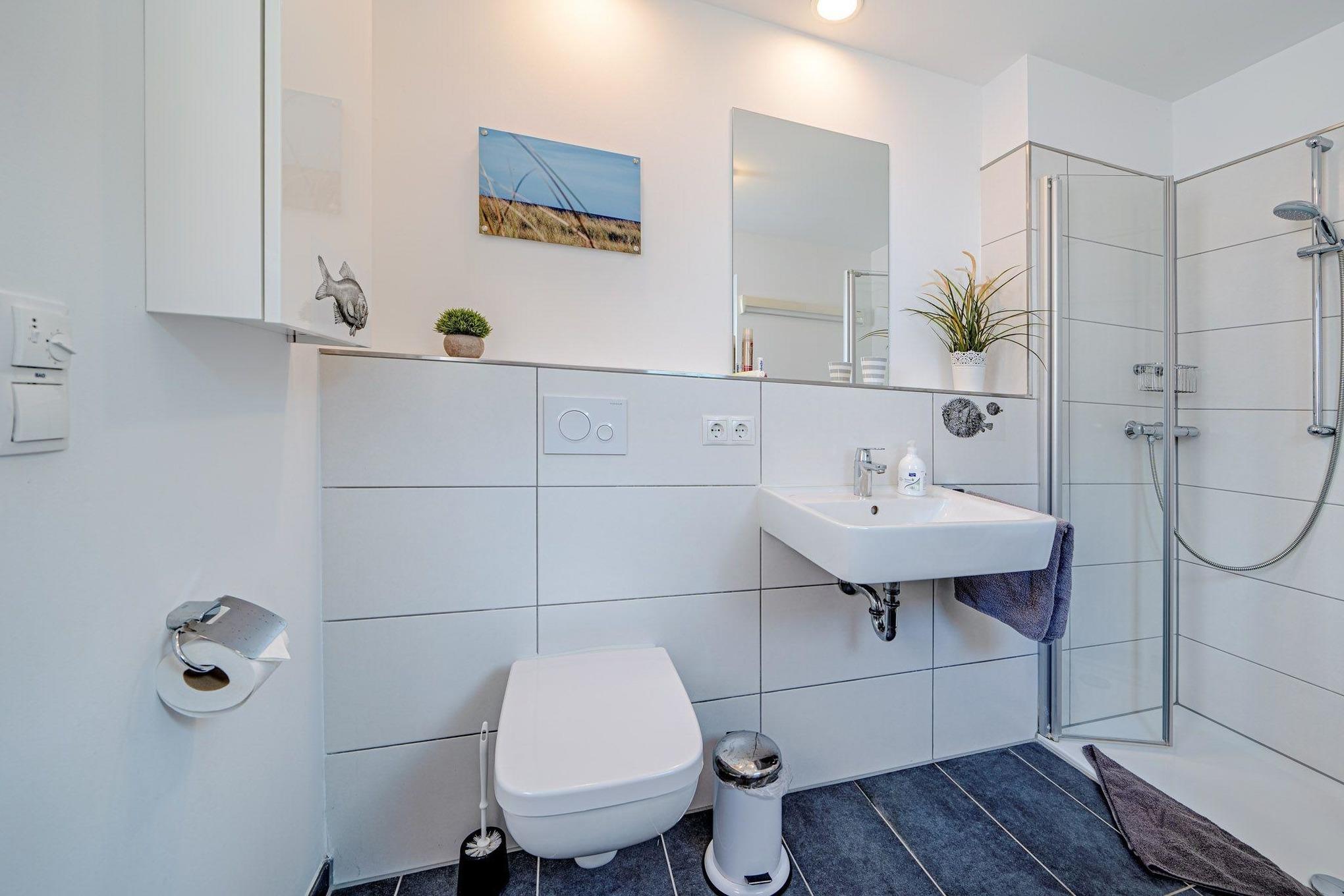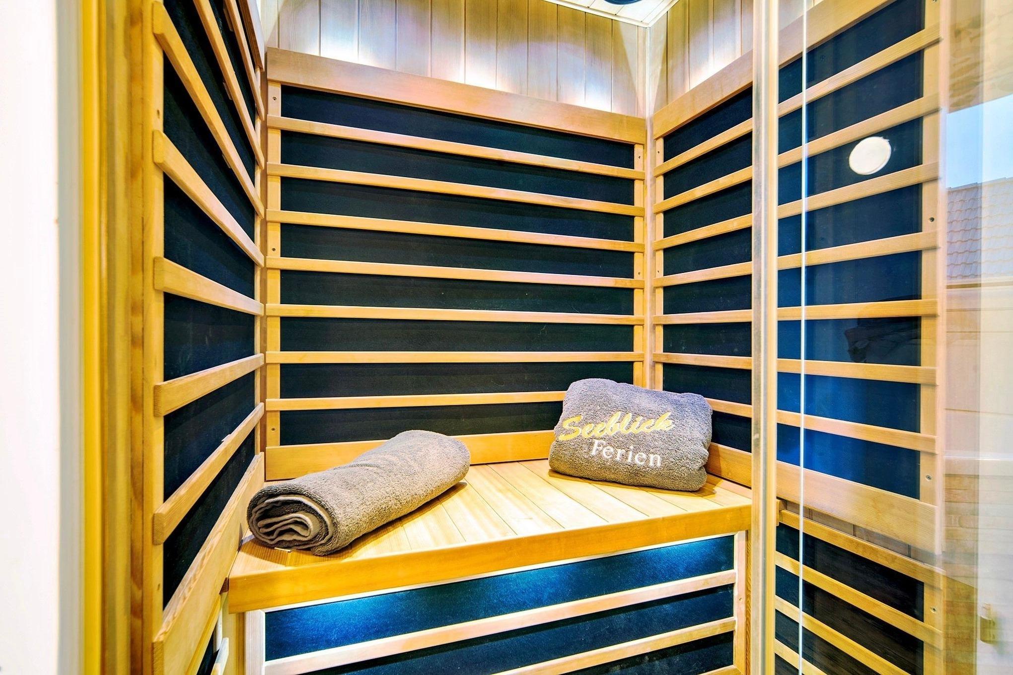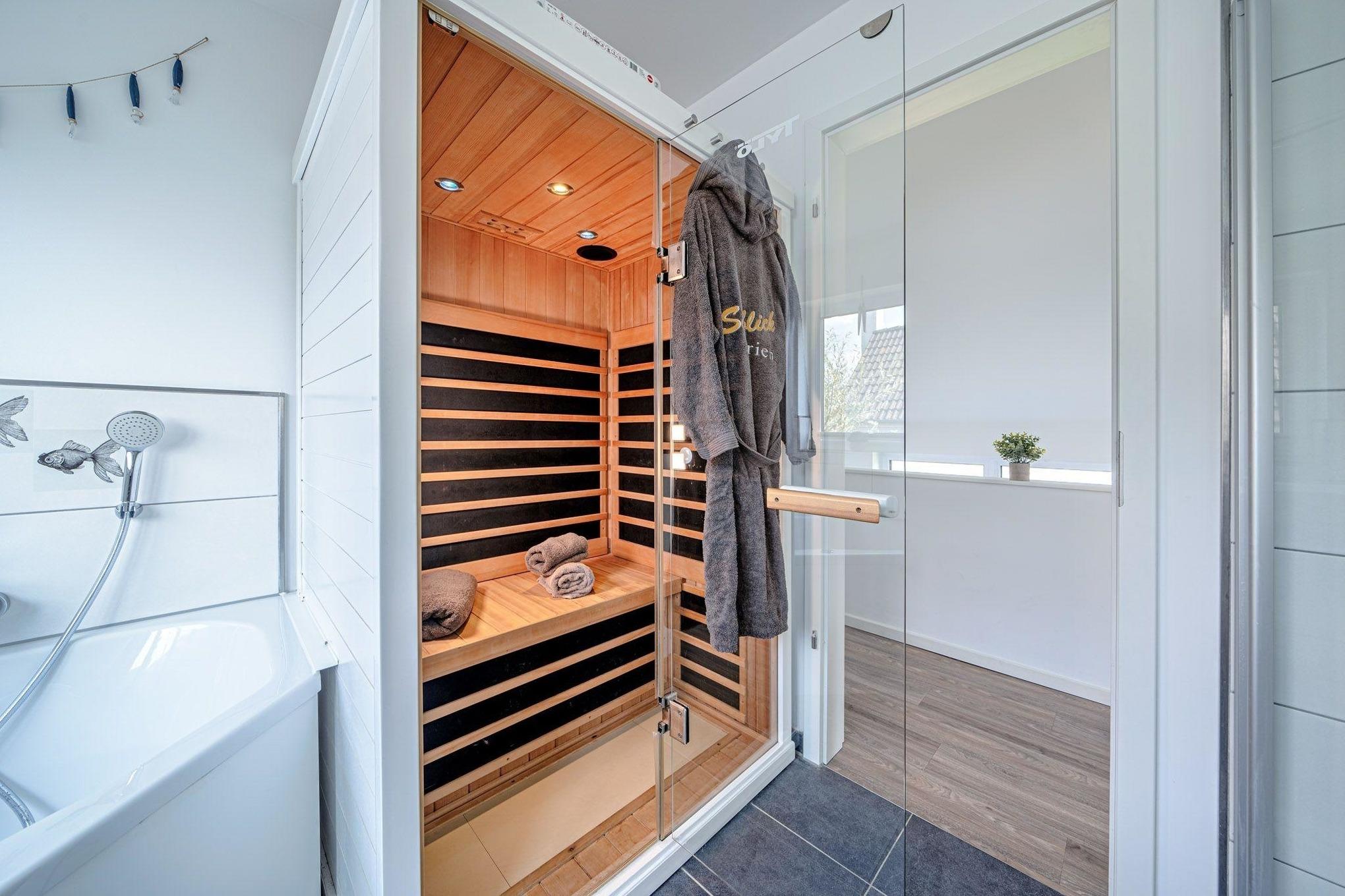 Das Ferienhaus bietet Ihnen den Luxus von zwei Badezimmern, jeweils auf einer Wohnebene. Entspannen Sie in der Infrarot-Sauna oder der großzügigen Badewanne mit Whirlpoolfunktionen und genießen Sie dabei den Blick auf das Wasser im ersten Obergeschoss.
