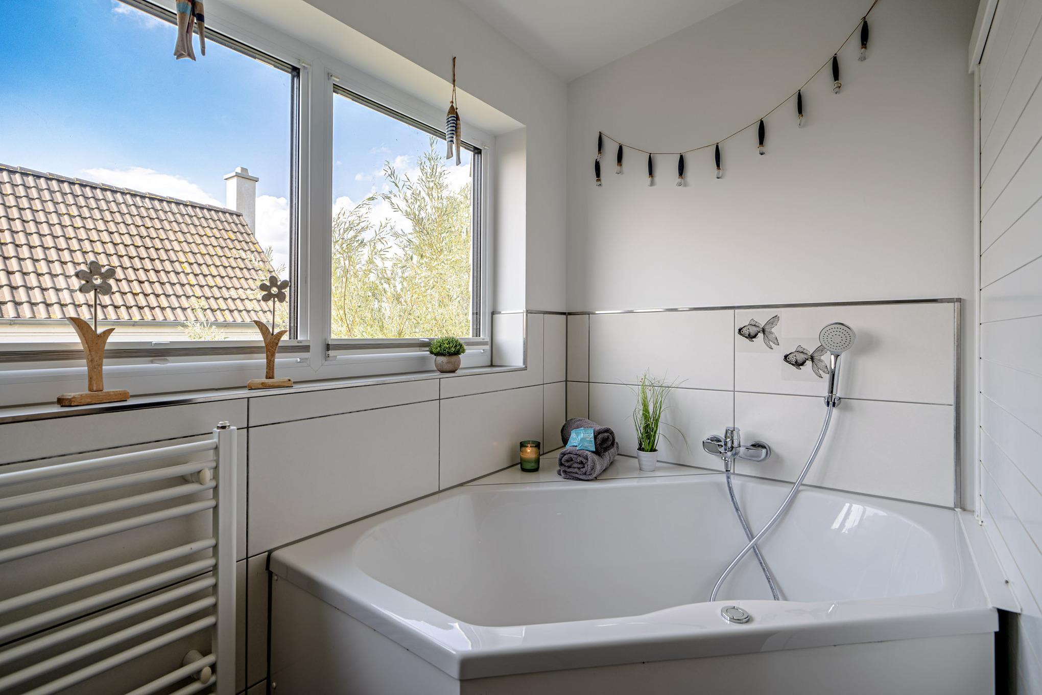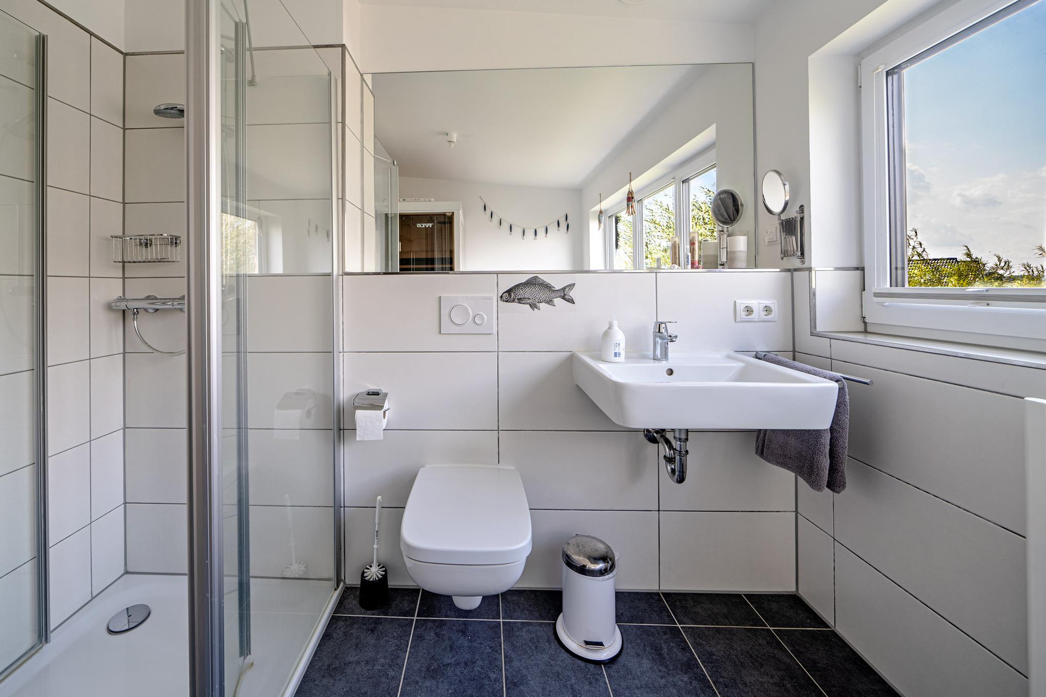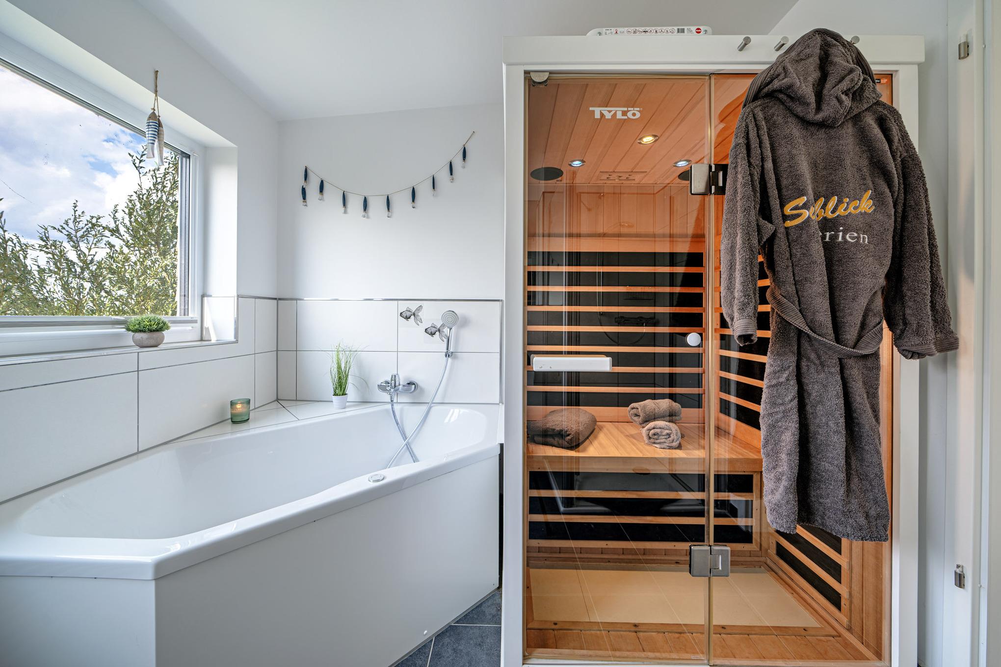 Das Ferienhaus bietet Ihnen den Luxus von zwei Badezimmern, jeweils auf einer Wohnebene. Entspannen Sie in der Infrarot-Sauna oder der großzügigen Badewanne mit Whirlpoolfunktionen und genießen Sie dabei den Blick auf das Wasser im ersten Obergeschoss.