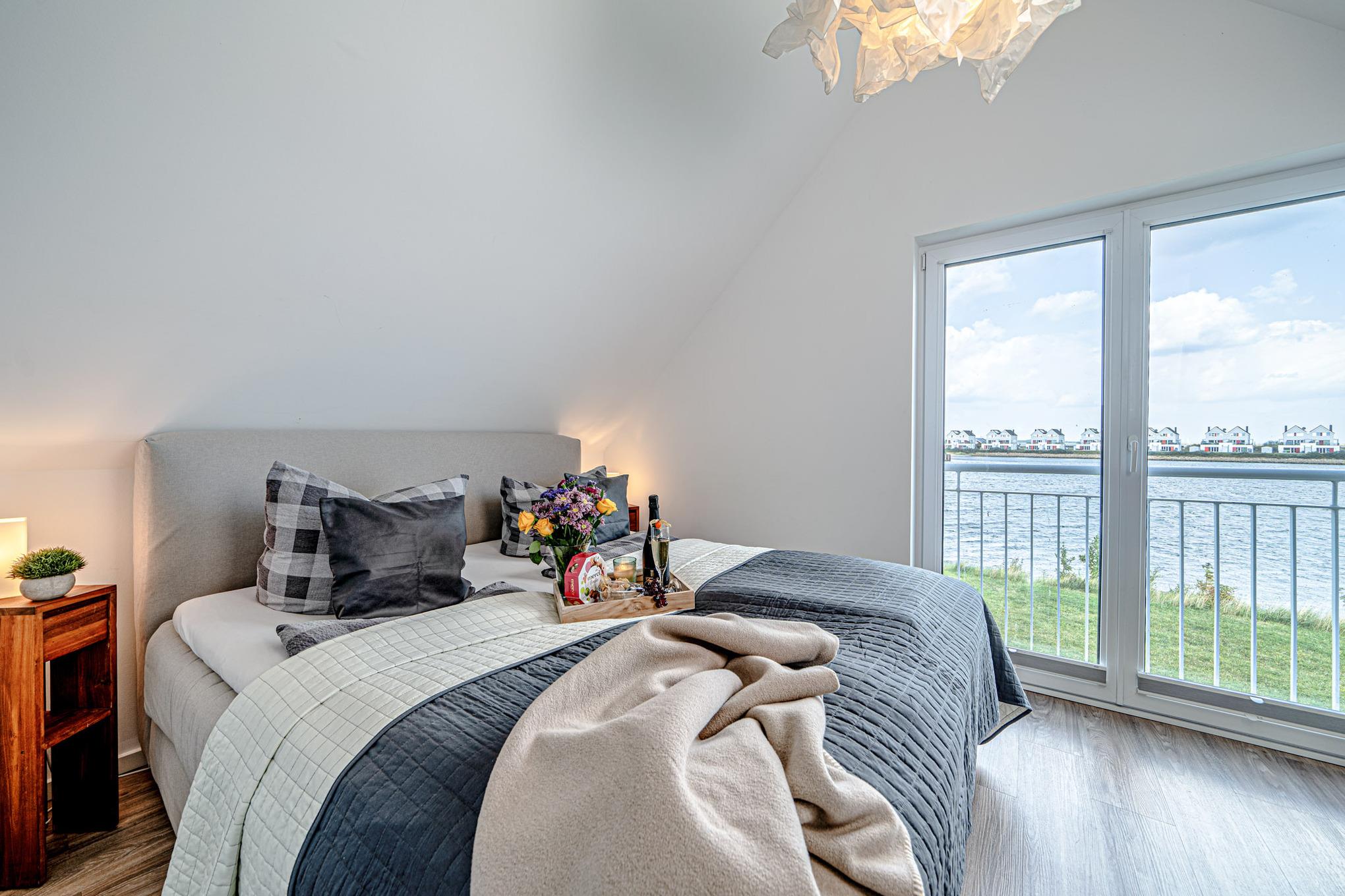 Im ersten Obergeschoss erwartet Sie ein stilvoller Ruhebereich mit atemberaubendem Blick über das weite Meer. Das Hauptschlafzimmer mit Smart TV und einem komfortablen Boxspringbett und das zweite Schlafzimmer mit zwei Einzelbetten bieten erholsamen Schlaf. Ein Babybett steht ebenfalls bereit.