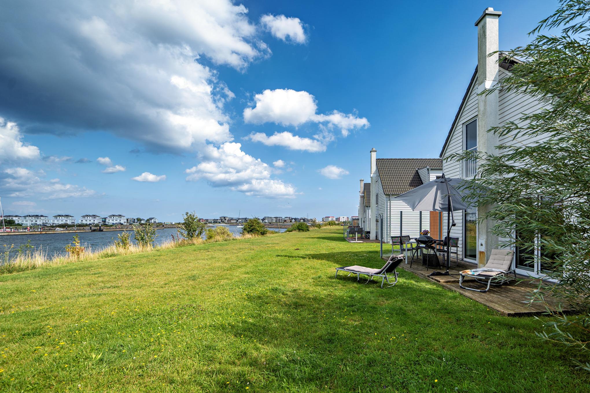 Die großzügige Terrasse bietet einen einzigartigen Blick auf vorbeiziehende Segel- und Sportboote, während der private Garten Ruhe und Erholung verspricht. Ein Weber-Elektrogrill und Sonnenliegen stehen zur Verfügung.